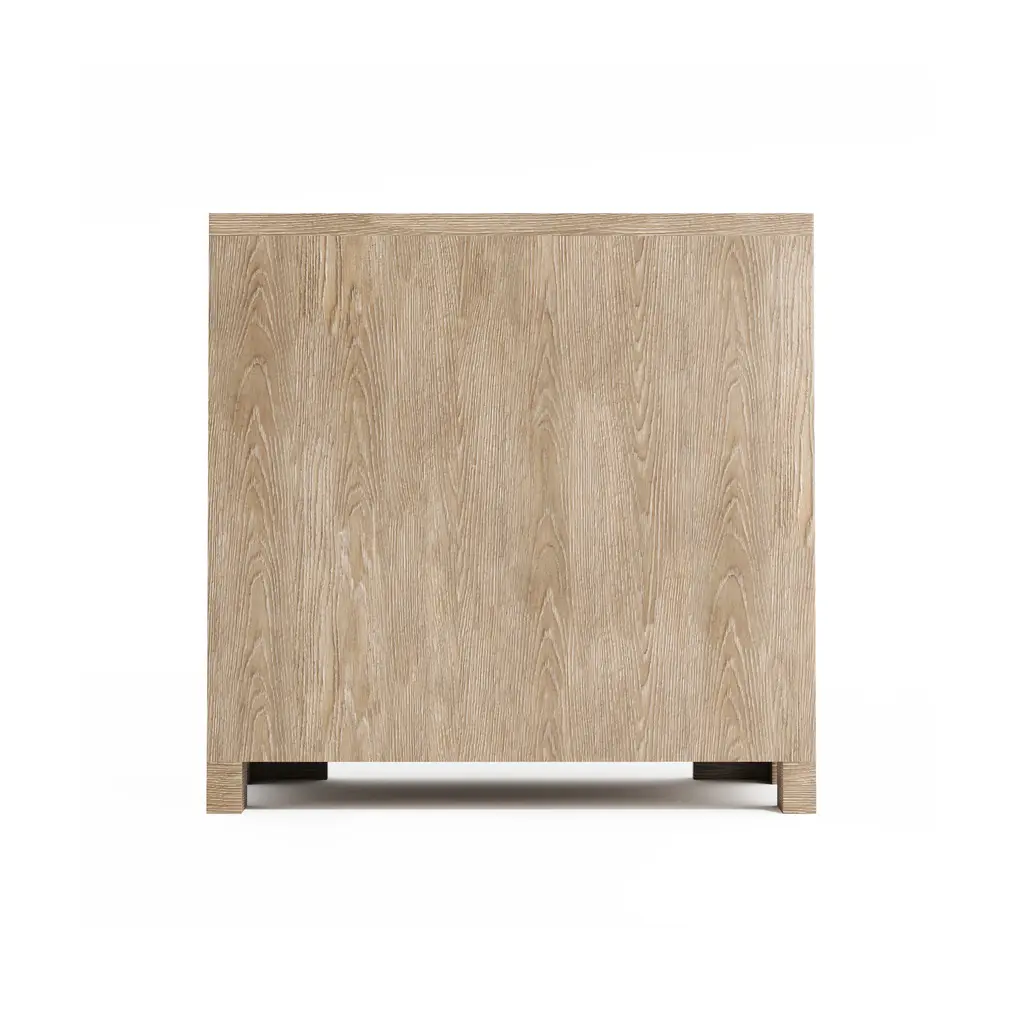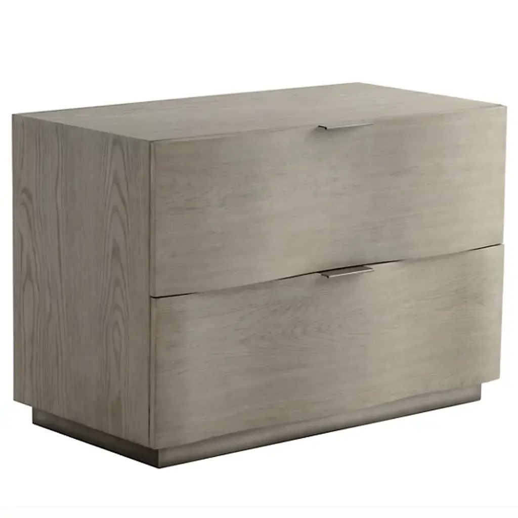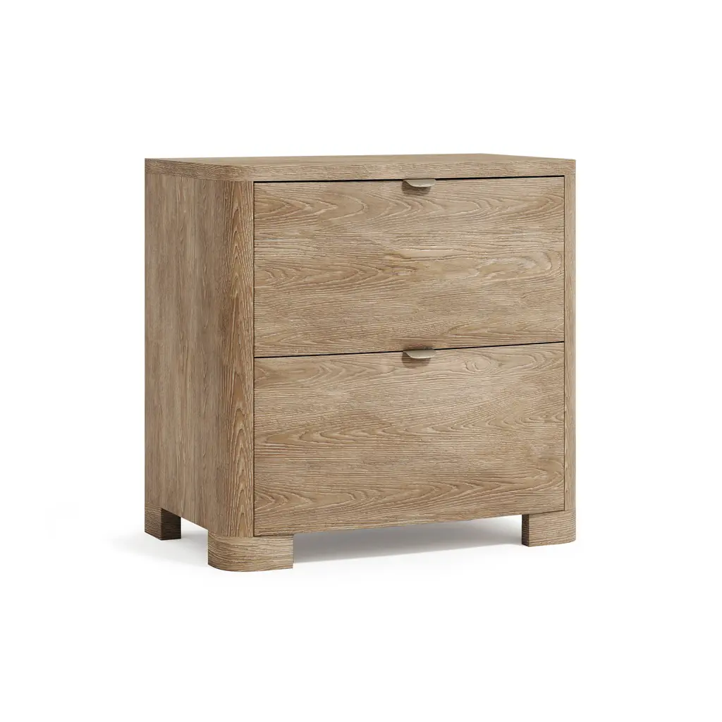 The Aventura Nightstand from Bernhardt captivates with its dimensional pyramid shaping and elegant bow front design. Featuring two drawers with sleek tab pulls, it combines style with practicality through a built-in two-port USB charging system discreetly located on the back. Finished in Marcona, this piece balances chic sophistication with rustic charm, making it a refined addition to any bedroom. Highlights