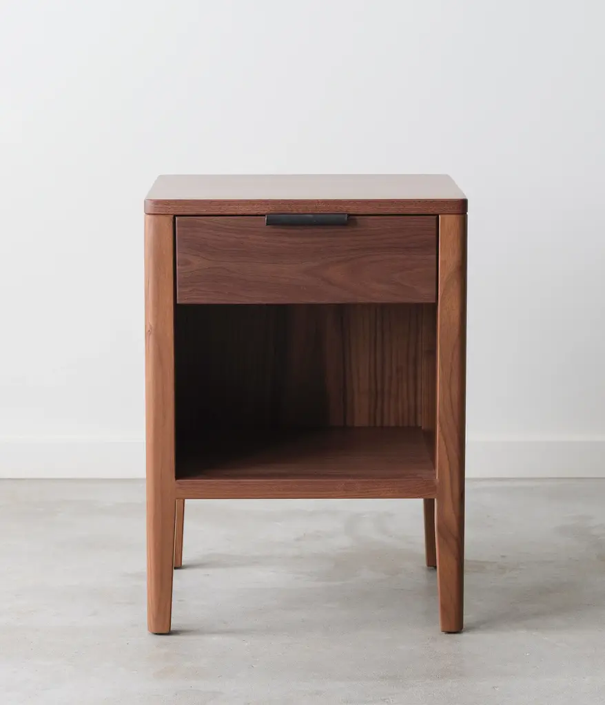 A stylish, petite option for your bedroom. One dovetail drawer box with soft-close, under mount drawer slides. Custom leather pull, designed and made in Chicago.