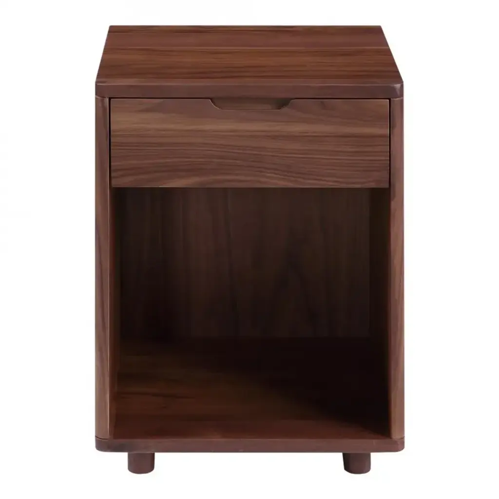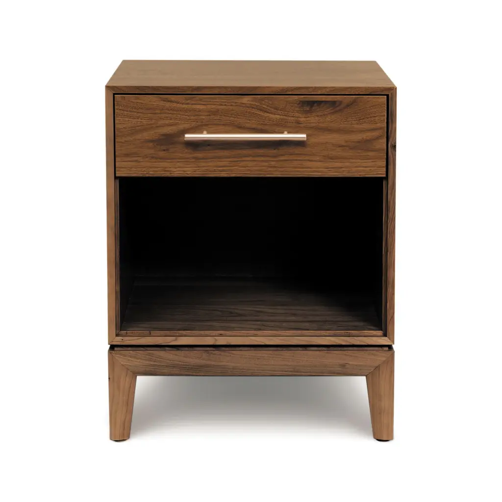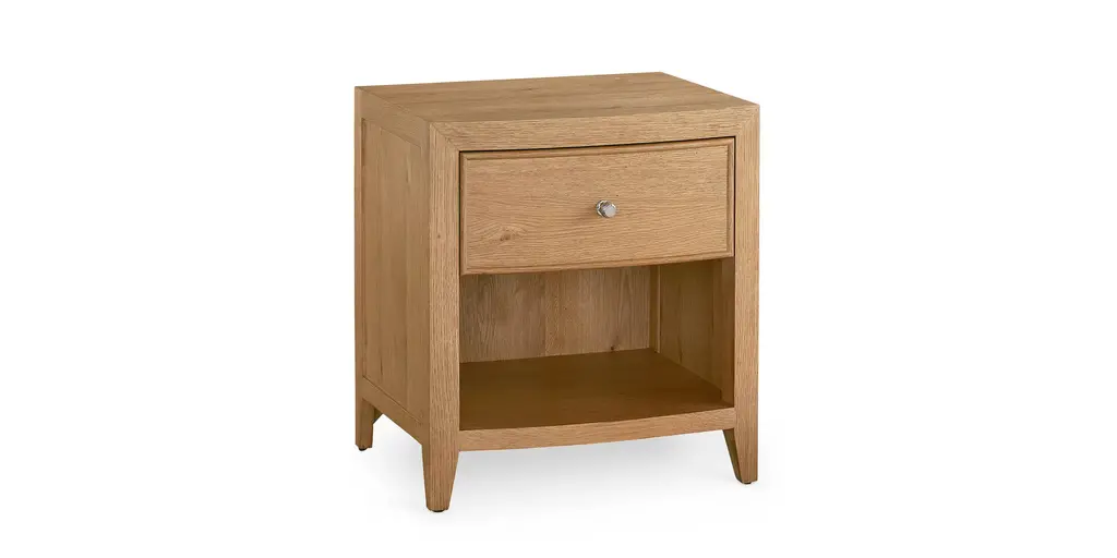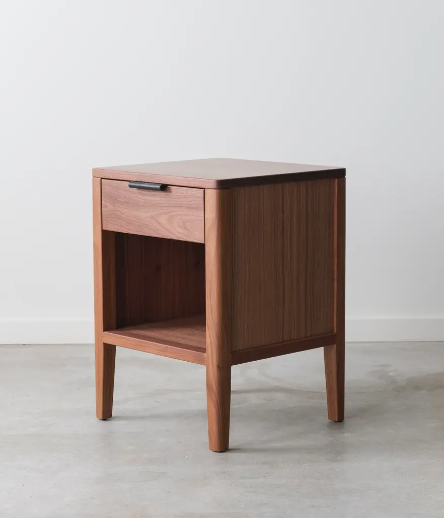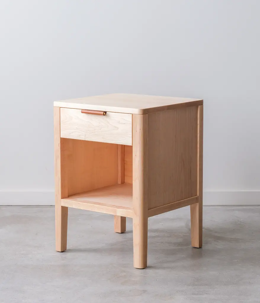 A stylish, petite option for your bedroom. One dovetail drawer box with soft-close, under mount drawer slides. Custom leather pull, designed and made in Chicago.