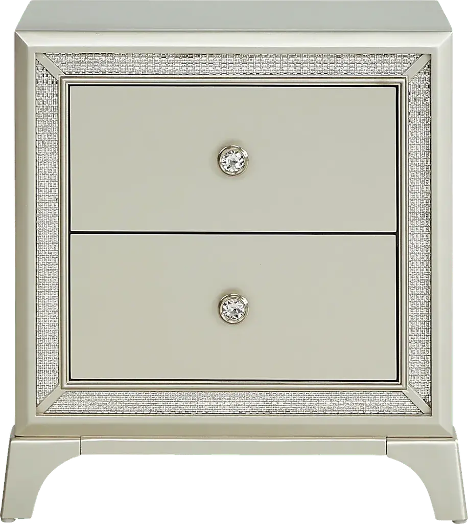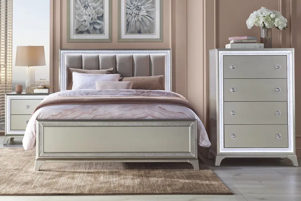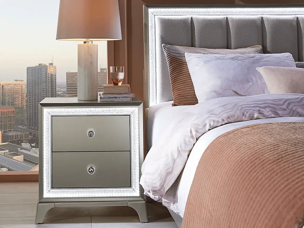 Greet the day with a splash of glamor when the Avery bedroom's dazzling design puts the final lavish touch on your rest and recharge room. Contemporary in style, this nightstand features a shimmering LED frame with crystal adornments and hardware for a luxurious display. Both drawers include French dovetail construction in the front, English dovetail in the back, and dustproof bottoms to ensure support and longevity.