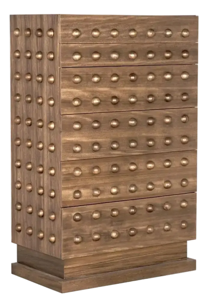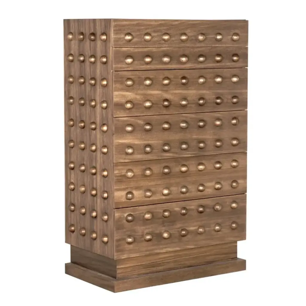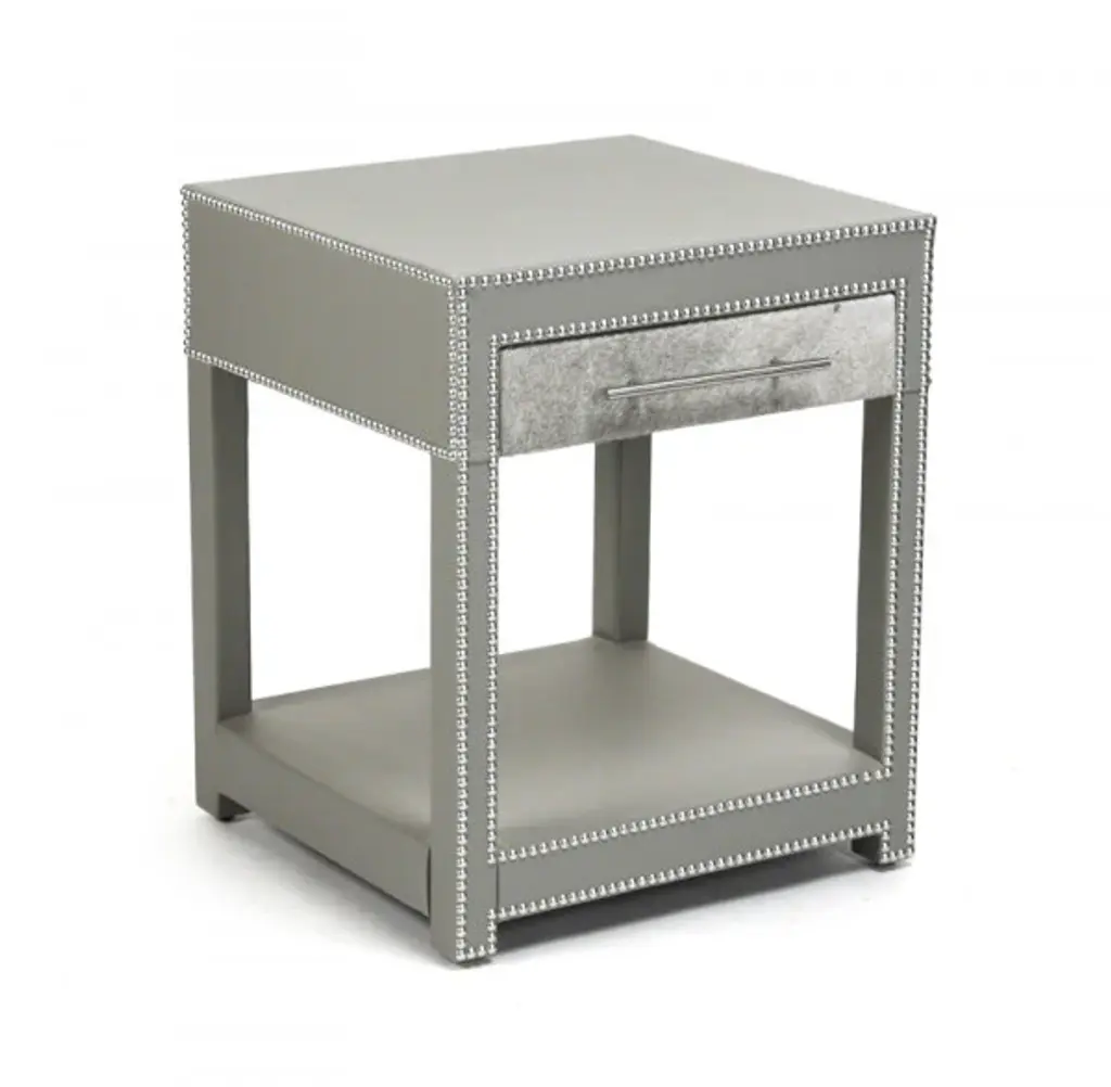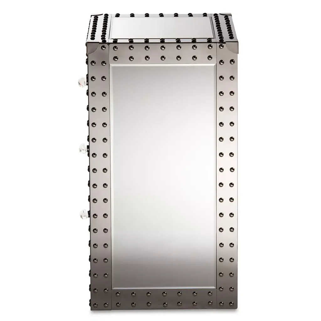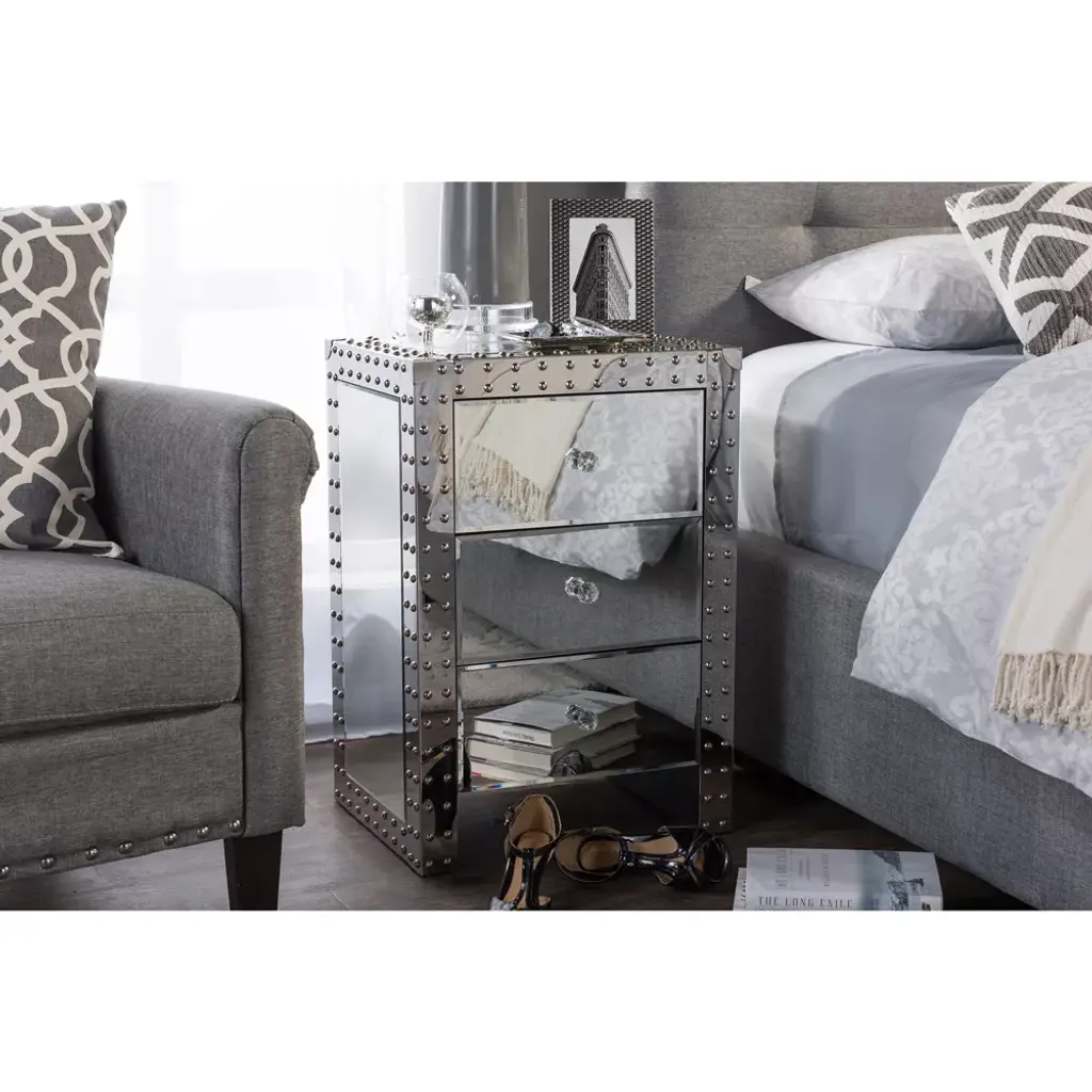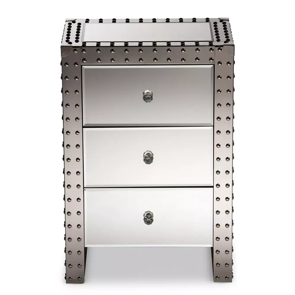 The end table is an essential piece for any shared space. The Azura mirrored contemporary end table offers a sleek, upscale look for any modern interior. Stylishly embellished with mirrored glass finish and nail heads trim on all sides, the Azura offers the perfect touch of elegance and will be a stunning piece to add to your collection. Three spacious drawers line the front with each one fitted with lovely crystal knobs. These provide an understated look while making the drawers accessible. The mirrored finish surfaces and the silver nail heads trim will catch the light beautifully and create a glamorous, sparkling look in your space. Made in China, the Azura end table will arrive fully assembled. Dimensions: 26" High x 18" Wide x 14" Long; Drawer Upper: 6.24" High x 14.04" Wide x 10.53" Long; Drawer Middle: 6.24" High x 14.04" Wide x 10.53" Long; Drawer Lower: 6.24" High x 14.04" Wide x 10.53" Long