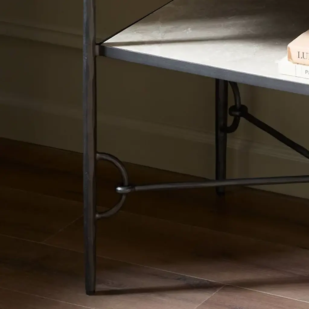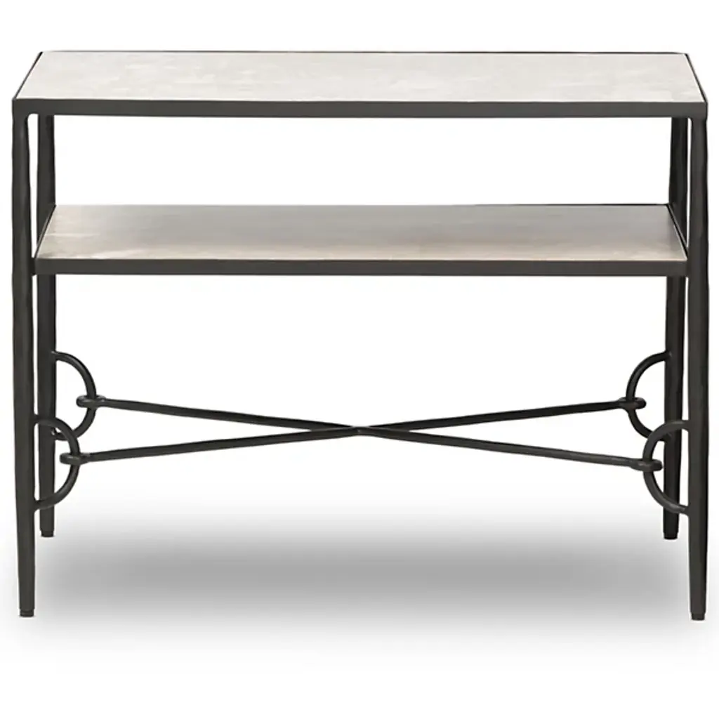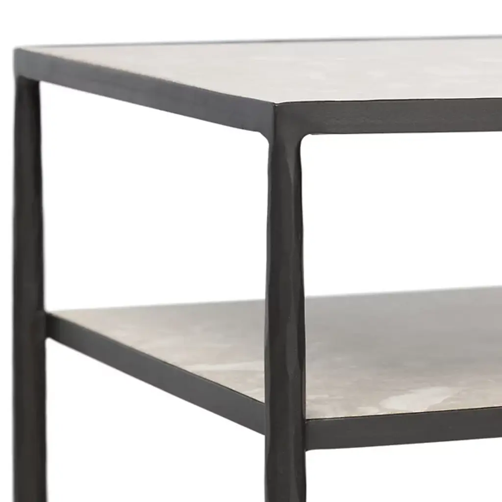 The Babylon Nightstand from Four Hands matches direct design with slender refinement. A hammered gunmetal frame supports two slim marble shelves with an open interior ideal for small item storage. An X-shaped base joins the slender, vertical legs via curving metal loops, adding an element of fine detail to the design. The marble shelves feature natural inclusions and imperfections, providing a unique organic character to each nightstand.