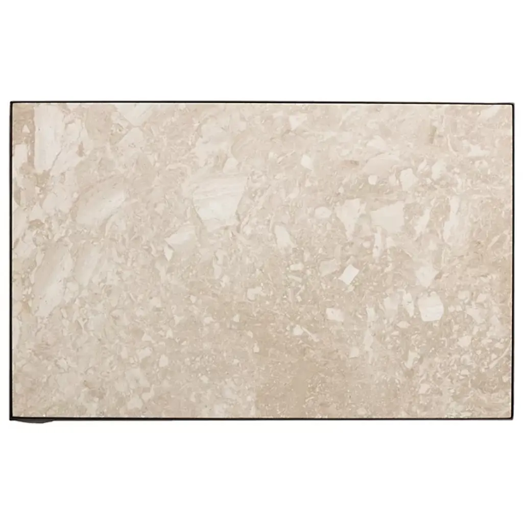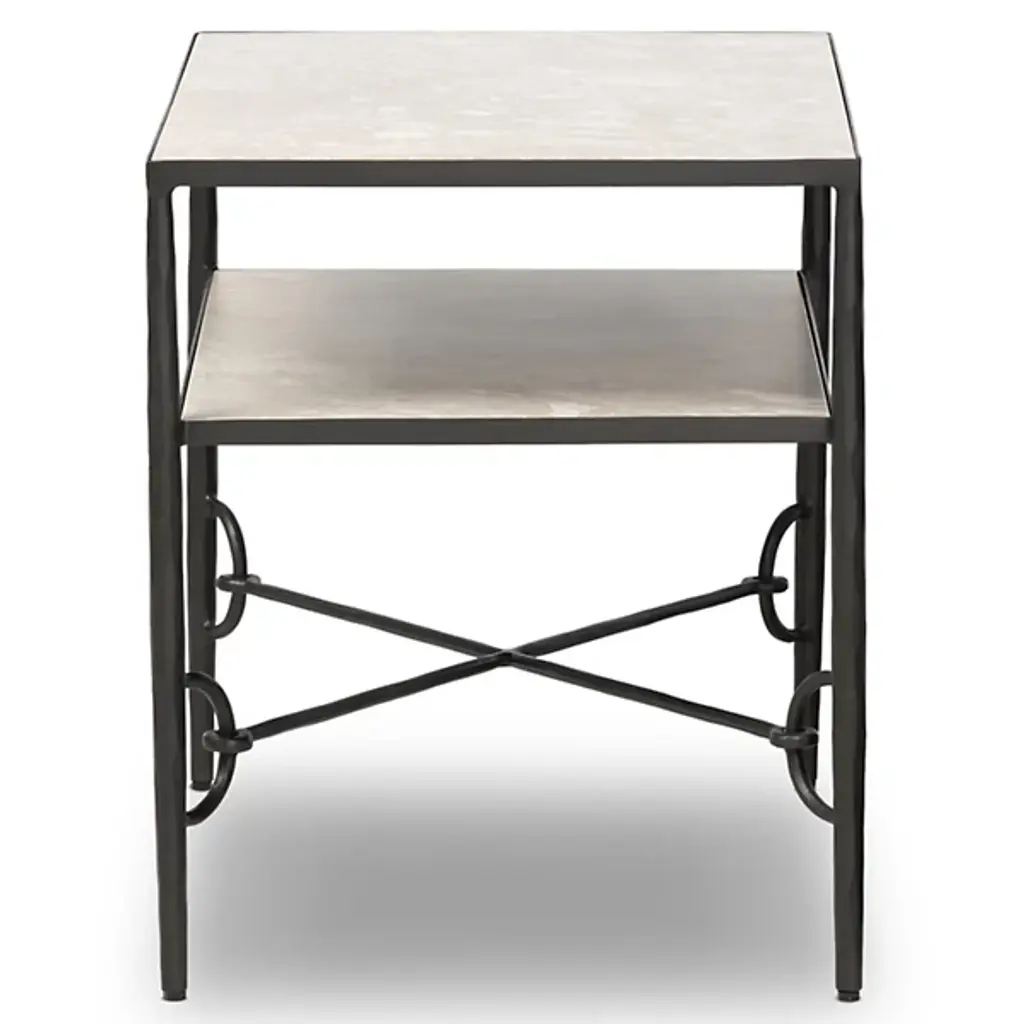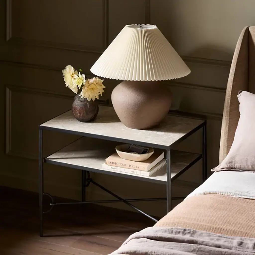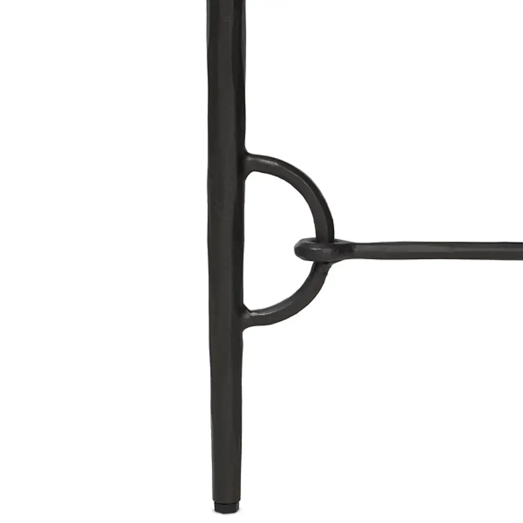 The Babylon Nightstand from Four Hands matches direct design with slender refinement. A hammered gunmetal frame supports two slim marble shelves with an open interior ideal for small item storage. An X-shaped base joins the slender, vertical legs via curving metal loops, adding an element of fine detail to the design. The marble shelves feature natural inclusions and imperfections, providing a unique organic character to each nightstand.