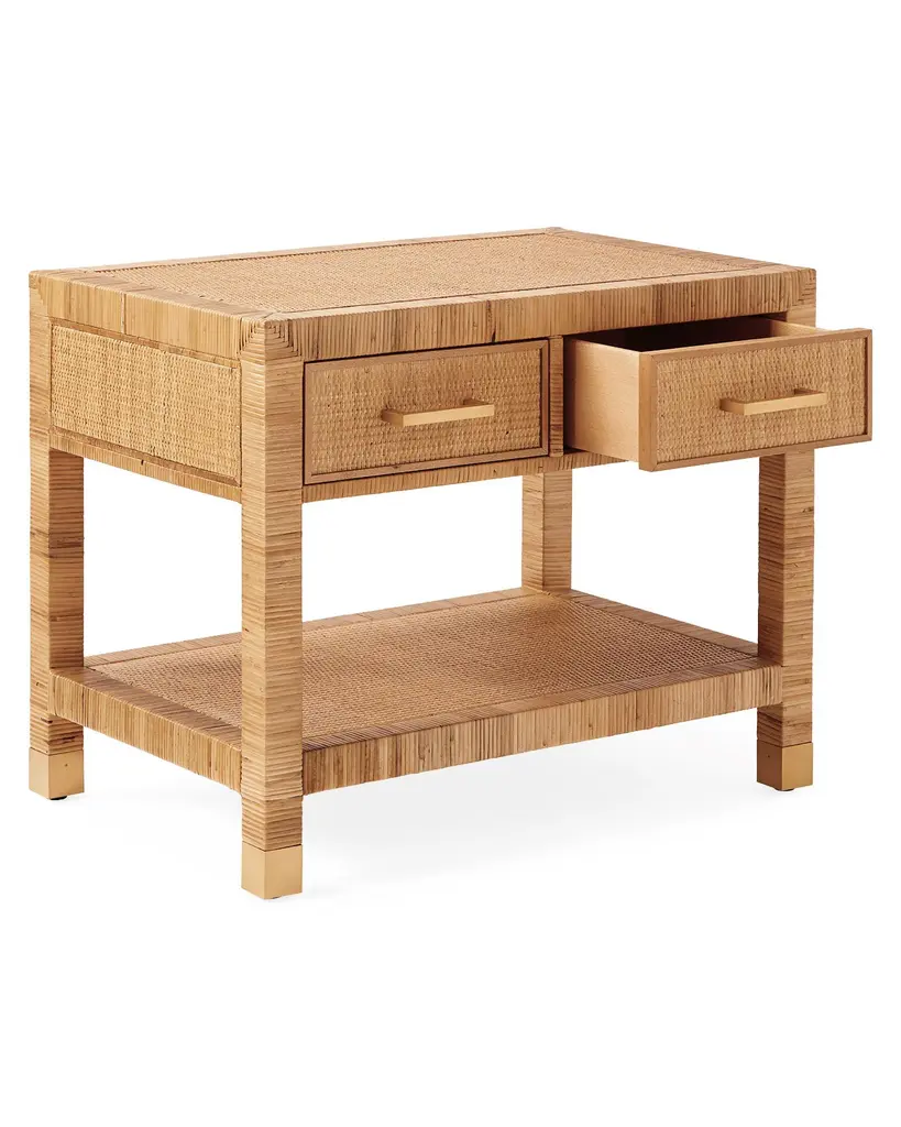 Design chameleon. A Parsons shape. Rattan woven over beechwood. Resplendent texture. Brass caps. A showpiece of tonal nuance. Lovely as a centerpiece between twin beds or as bookends on each side of a larger bed.