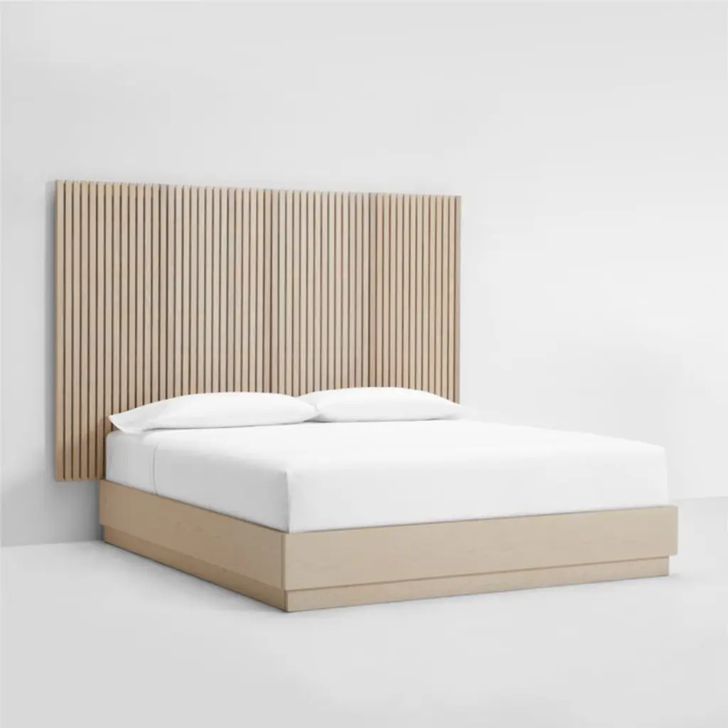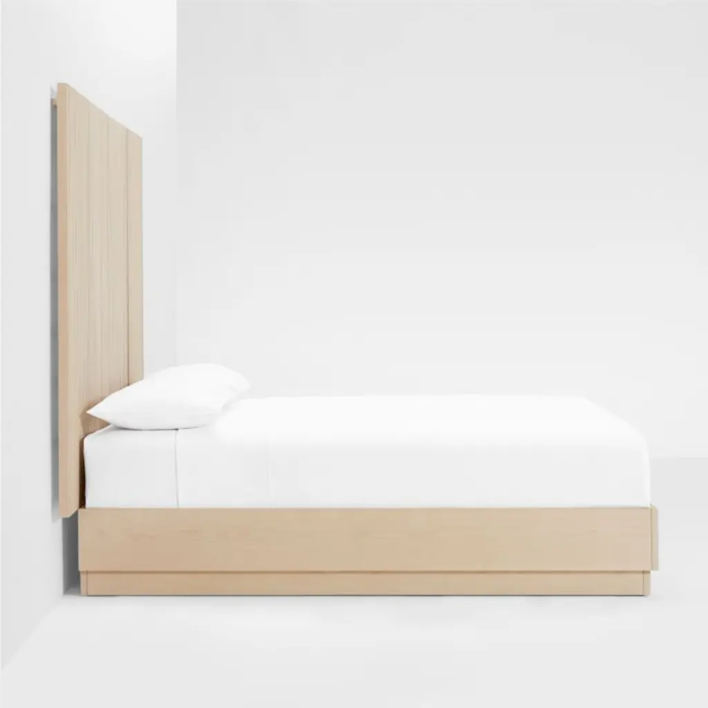 Part of our space-saving Batten modular storage system, three slatted Batten back panels make the perfect backdrop for the Batten plinth-base bed. Both panels and bed are made of handsome oak veneer finished in white oak. To customize your bedroom, add on Batten storage components including floating nightstands, shelves and hooks. Designed by Bill Eastburn of William Eastburn Design, the Batten collection is a Crate & Barrel exclusive.