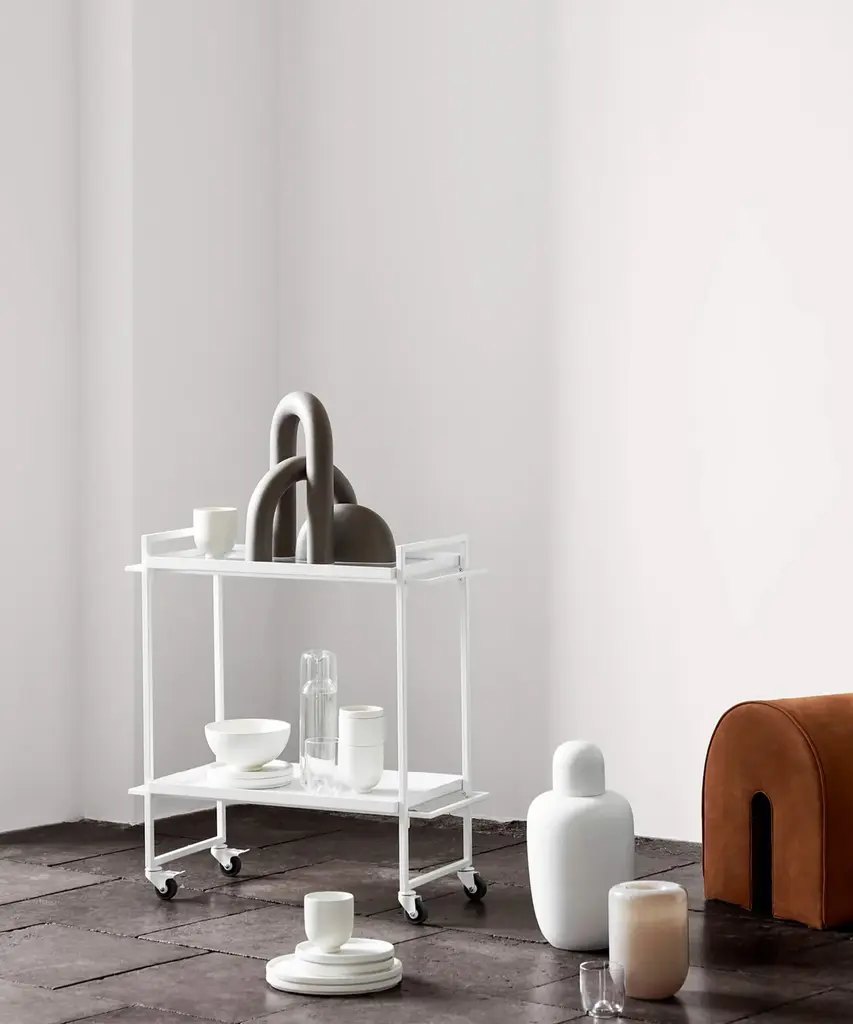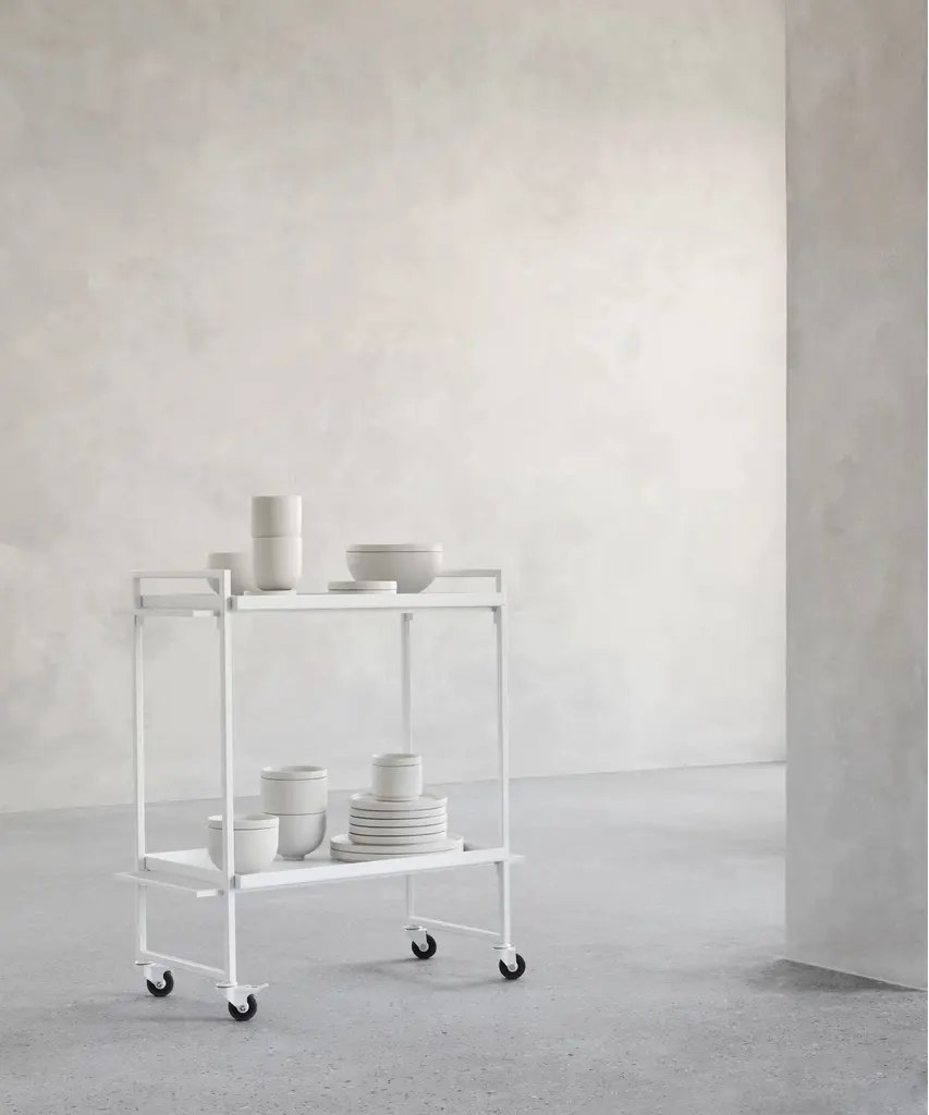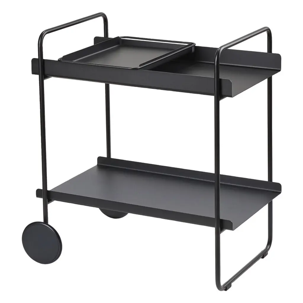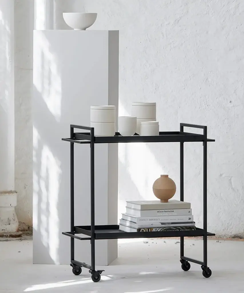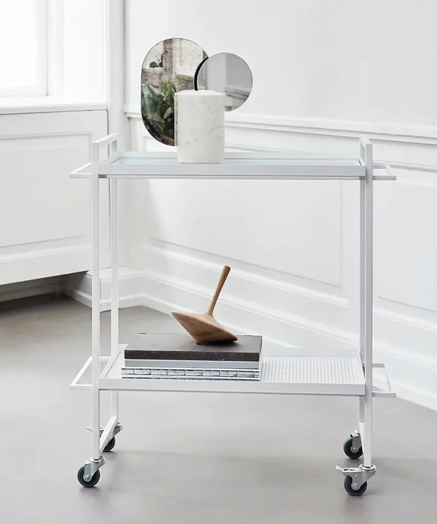Bauhaus Trolley is inspired by the influential German Bauhaus art school. The design of the serving trolley is light and graphical. Use it as a serving trolley, as a movable serving table or to exhibit your indoor herb garden or plants. The Danish Designed Trolley emphasizes that simple design is beautiful. A functional and extremely versatile trolley perfect when used as a movable serving trolley or bar cart. In fact, you can easily use it for anything from a bedside table to a coffee table. The Bauhaus Trolley is already an all-time best seller in the collection and a unique two-storage table and a mobile piece of furniture on wheels. Useful in virtually any room of your house and will fit in any home interior. The Bauhaus Trolley is available in black and white powder-coated steel and includes two trays - one in hardened glass and one made of perforated steel. The Bauhaus Trolley series is a modern and minimalistic trolley in Scandinavian / Danish design. The wheels of the trolley can be fastened thus making it a stationary small table. This elegant piece of furniture is designed by architect Kristina Dam, it is shipped flat-packed and is assembled with screws. Kristina Dam Studios' design ethos and philosophy could be described as Nordic Minimalism, with a focus on simple graphic lines, attention to detail, and carefully selected materials. The entire range of designs is produced within the EU and shipped worldwide. Designed by Kristina Dam Studio in Copenhagen, Denmark.