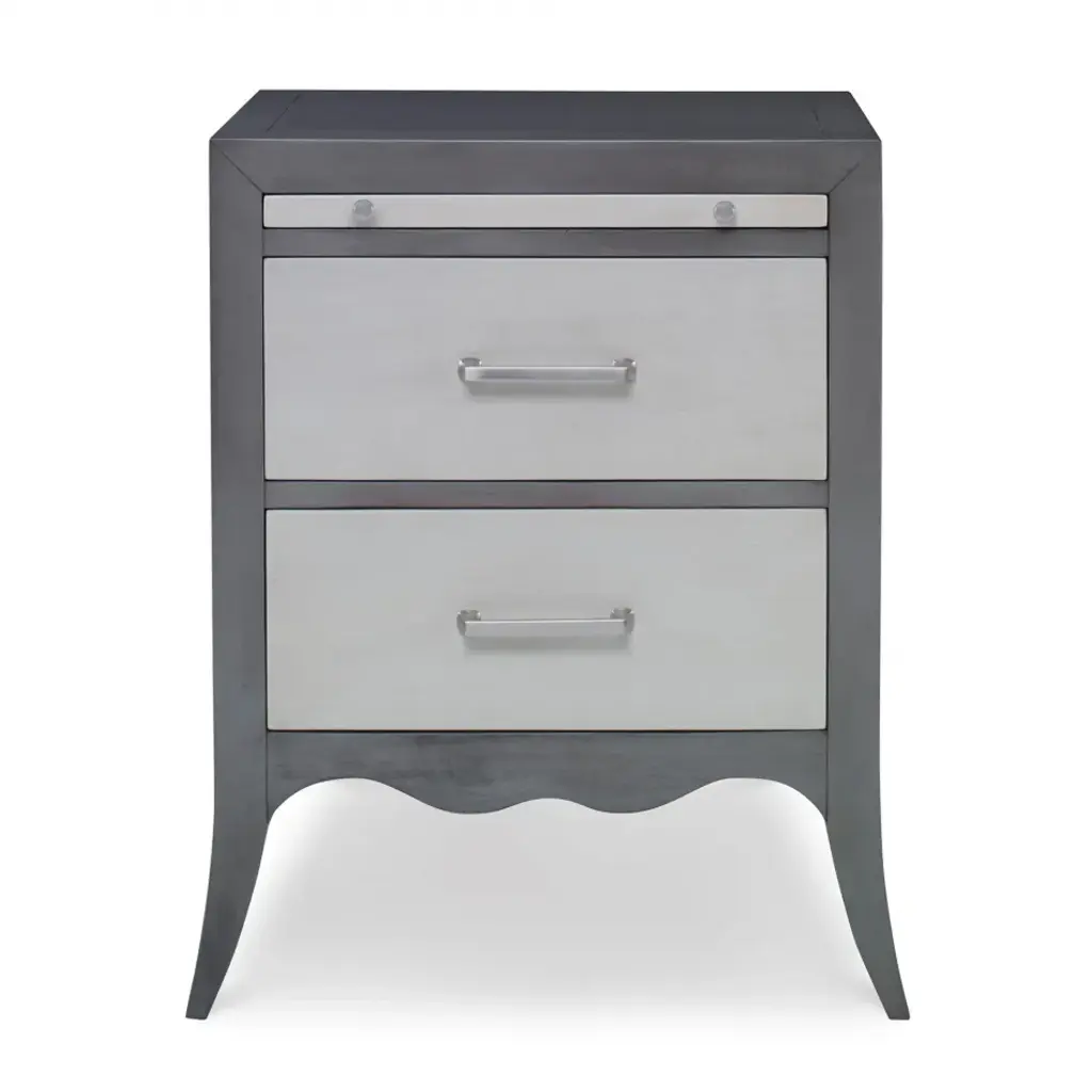 Crafted from Mahogany solids, this petite nightstand features two drawers and one pull out tray all raised over a curved bottom rail and splayed tall legs.