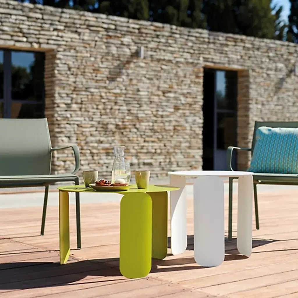 Tune up the terrace. The BeBop Low Table by Fermob adds harmony to a multitude of spaces, from a coastal flavored sunroom to a sunny garden patio. Designer Tristan Lohner named the table for a unique type of jazz music with multifaceted rhythms. The design features a round table top that appears to float effortlessly on a trio of thin, rounded feet. The Steel top and base are well supported with Aluminum tube cross-beams and treated with high outdoor protection. Finished with an anti-UV powder coating, the colorful table easily takes a place bedside or chairside and hits all the high notes for mix and match options on the terrace.