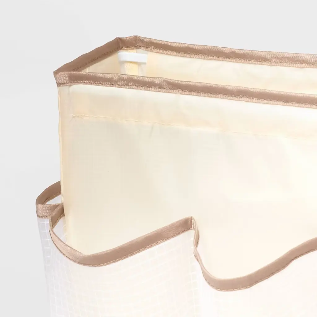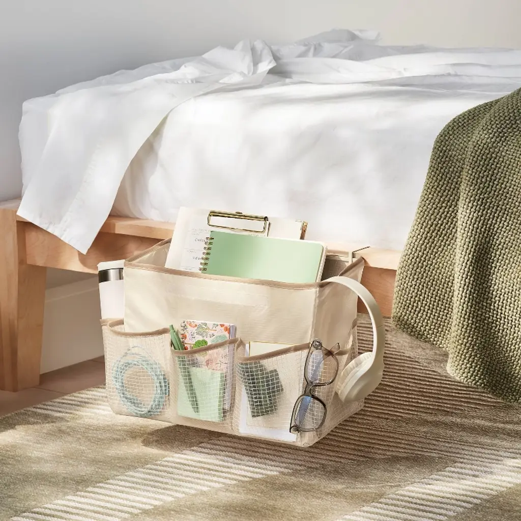 Keep your nighttime essentials close by and easy to reach with this Bedside Caddy from Brightroom™. This bedside caddy features a single rectangular compartment that comes in handy for stashing your phone, remote controls, reading glasses, books or more. Plus, it features all-around pockets to store small items such as jewelry, accessories, or more. Designed in a tan hue with a white grid-like print on the pockets, it's sure to add functional style to your bedroom decor.Brightroom™: See your space in a new light.
