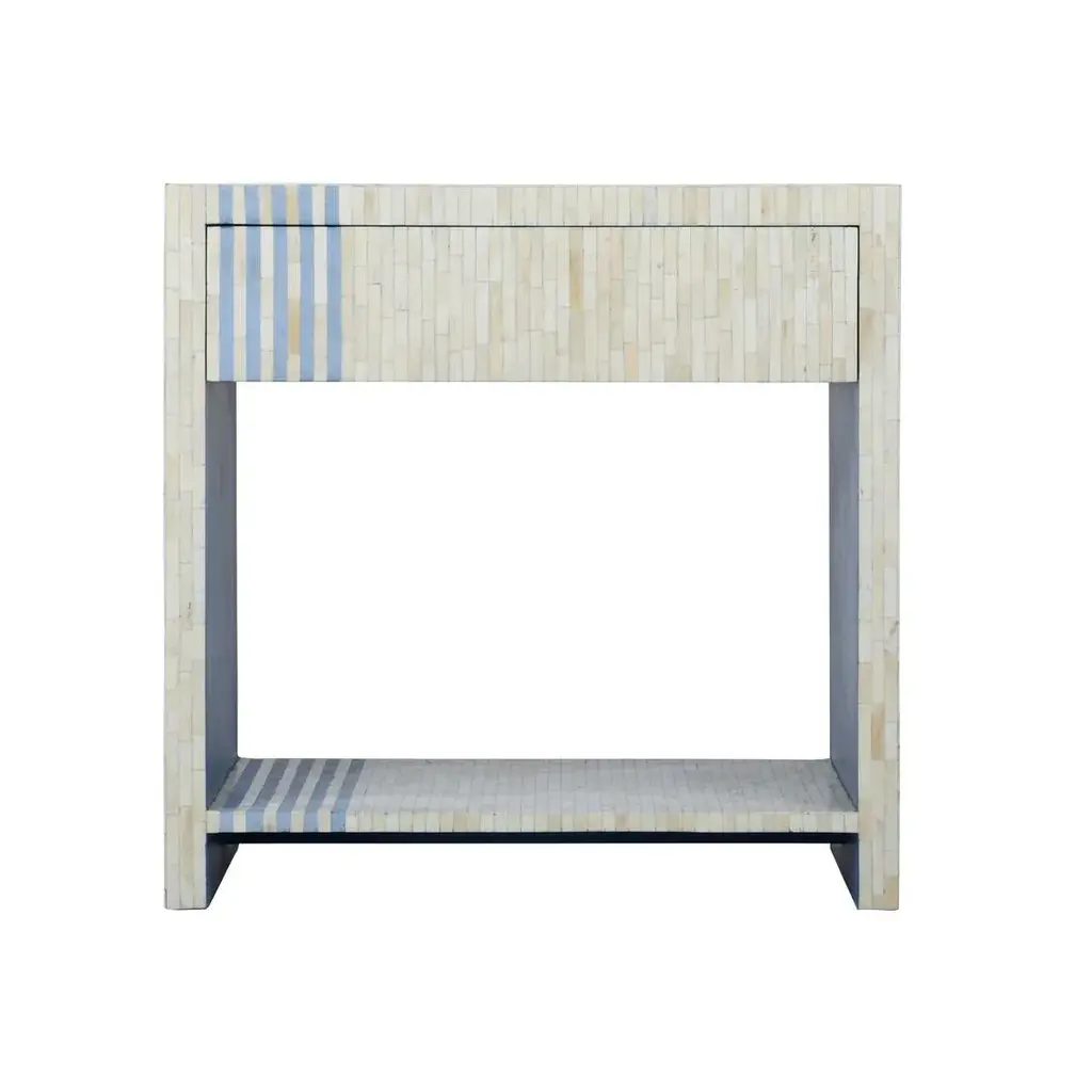 The bedside table blends beauty and function in a piece that can be used in a variety of places in a home. The exquisite craftmanship includes hand cut bone inlay in a geometric pattern and a sleek drawer with metal glides that easily functions with no knob.