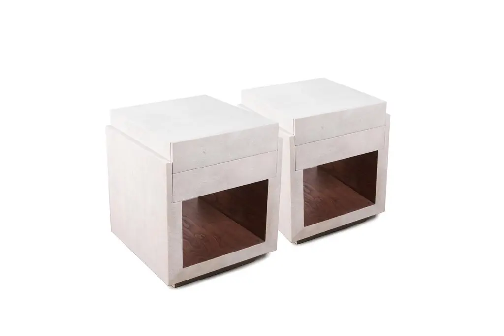 The Paris based label has distinguished themselves since their launch, with their iconic use of shagreen mixed with brass and other exotic materials. All furniture is handcrafted by skilled artisans, ultimately making each piece unique, designed in Paris and produced in the Philippines.The Tomboy bedside by R&Y Augousti is an elegant piece with its subtle geometry. This bedside table is completely inlaid in a mixture of coal black shagreen and gemelina wood veneer in the shelf opening. This bedside table includes two drawers and a lower open shelf. Available in other finishes, see images at end of slide. Custom color/sizing available on request.The finish of the shagreen is authentic as it is hand-dyed by our artisans and the designer calls this finish "coal black shagreen"The dimensions of this piece are 19.75 x 19.75 x 23.5"All R&Y Augousti pieces are handmade by artisans, ultimately making each piece unique. Wipe clean with soft dry cloth.Acclaimed design duo Ria & Yiouri Augousti have established themselves since the 1990s as pioneers of modern-vintage style through their luxurious Art Deco inspired collections.The Paris based label has distinguished themselves since their launch, with their iconic use of shagreen mixed with brass and other exotic materials. All furniture is handcrafted by skilled artisans, ultimately making each piece unique.All shagreen-covered items should be kept out of direct sunlight, color variants may occur on the stingray and other exotic finishes, but this showcases the Parisian label's commitment to creating authentic luxurious products using natural components.