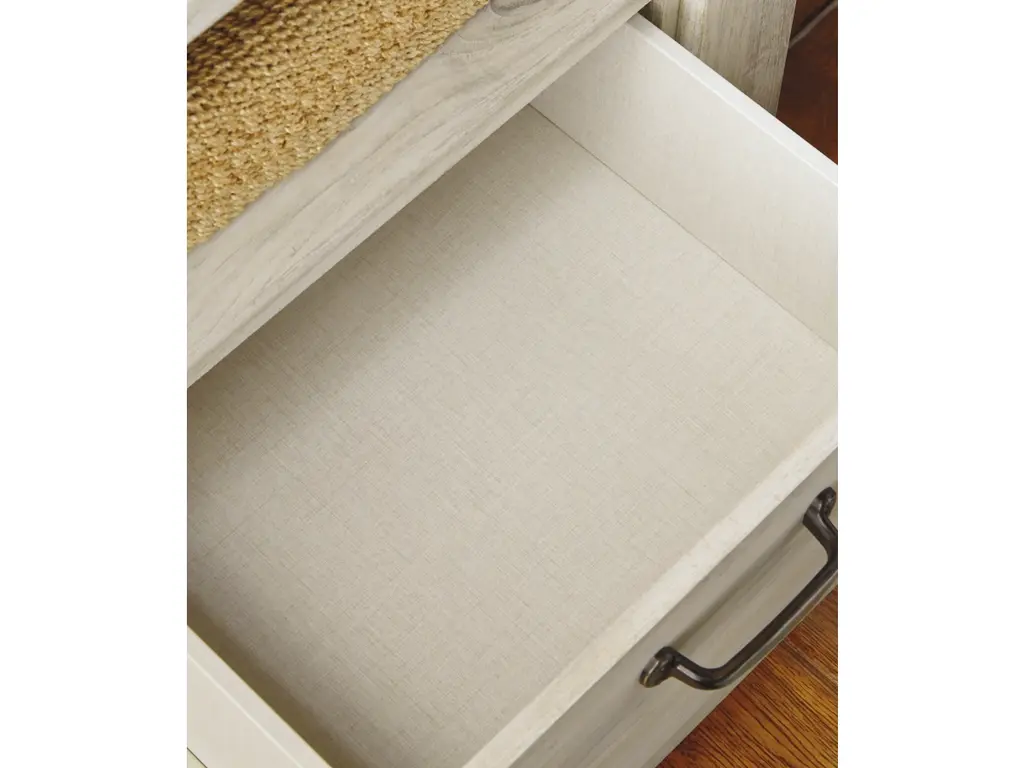 Your bedroom isn’t just a room. It’s a canvas. Express your farmhouse style with the Bellaby nightstand. Wispy white finish over replicated oak wood grain brightens up the space with charm. Brushed nickel-tone handles with black edging finesse the piece with a bit of shine. Drawer is spacious and lined with faux linen laminate to hold your belongings with care. This clean-lined profile is the perfect authentic foundation for inviting decor.