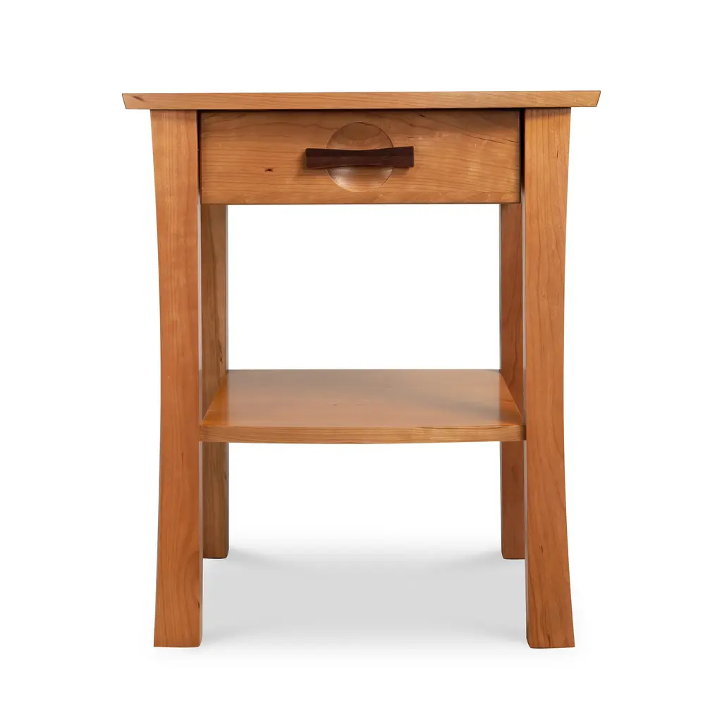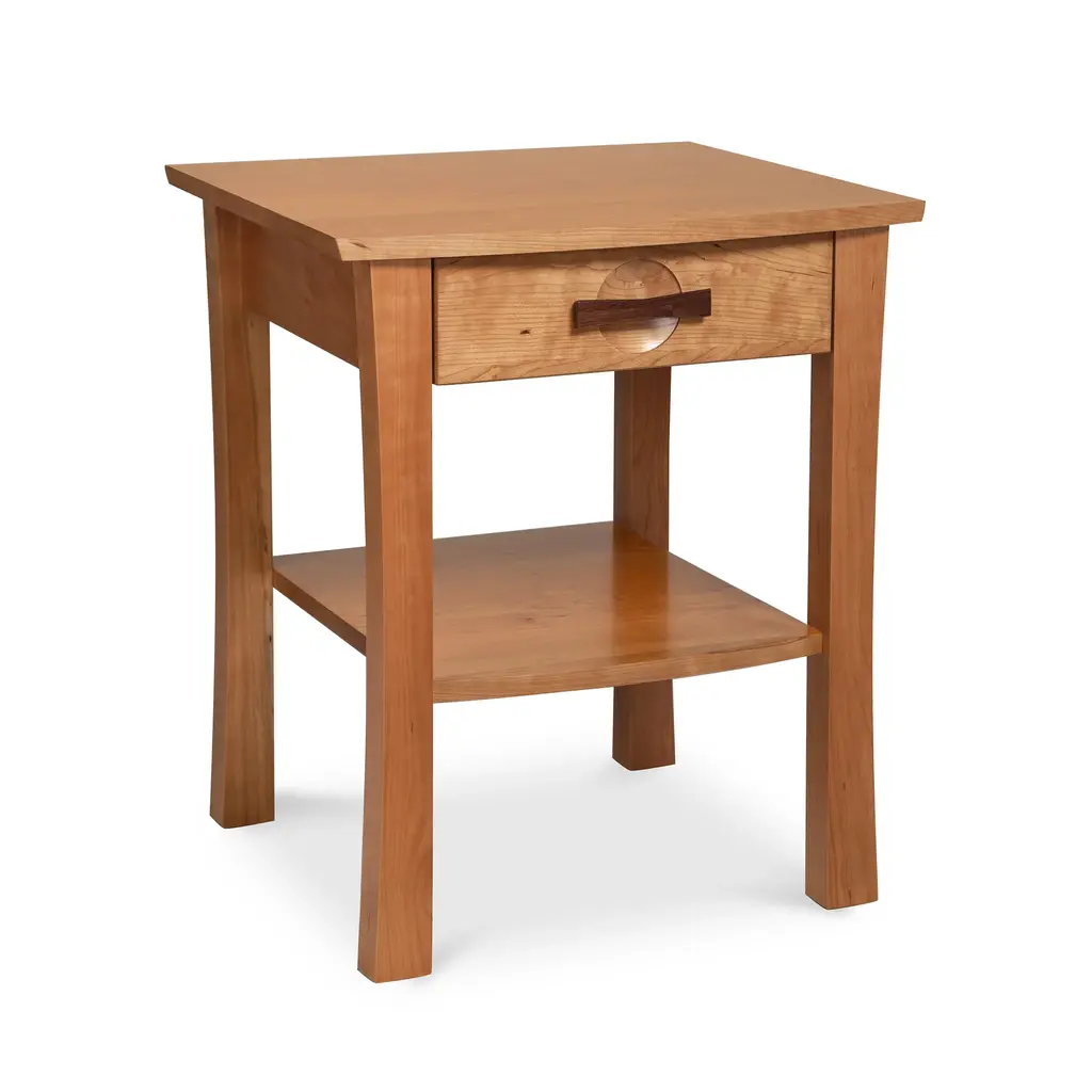 Our solid cherry wood Berkeley nightstand is a fusion of Arts & Crafts and Asian Styling. Open design features a single drawer and handy bottom shelf. Customize online in your choice of wood color. Our Berkeley Bedroom Furniture Collection is handmade in Vermont using sustainably harvested woods.Construction details include solid black walnut drawer pulls, frame and panel structural design, solid wood top, 1/4" top-grade cherry veneer panels integrated into the case sides and back, fully finished drawer boxes with solid wood drawer fronts/sides/backs, asymmetrical English dovetails and adjustable two-glide wooden spring-loaded drawer slides.Base price represents natural cherry wood with solid black walnut drawer pullsShown in natural cherry wood with solid black walnut drawer pullsMatching furniture available in our Berkeley Furniture CollectionNatural variations in solid wood and hand applied finishes make each piece unique. Slight grain and finish irregularities tell you that the furniture has been crafted from solid wood and are considered hallmarks of quality.