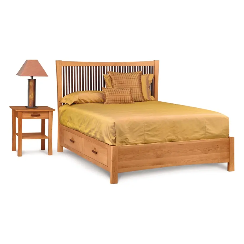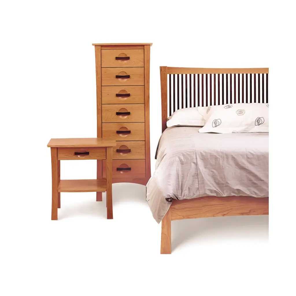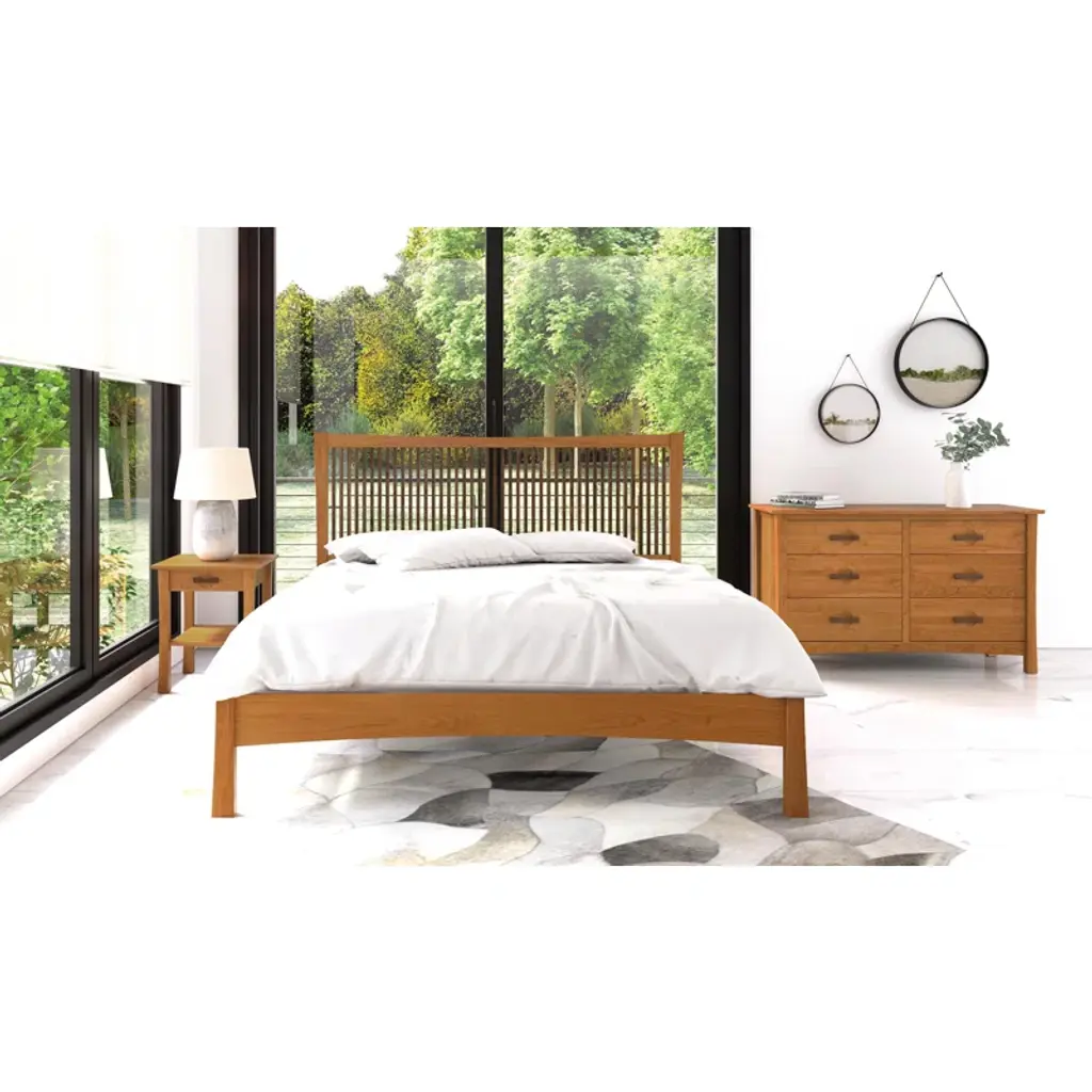 A fusion of arts & crafts and Asian design, the Berkeley bedroom is both sophisticated and practical. Crafted in solid cherry hardwood with American black walnut accents, the collection features a variety of cases and a low footboard bed designed for use with a mattress only.