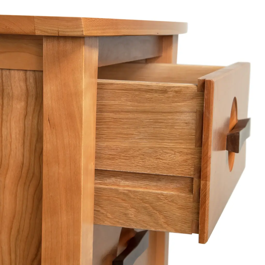 Our Copeland Berkeley 2-Drawer Nightstand has an American Arts & Crafts style fused with modern Asian design. Customize online in your choice of wood color. Our Copeland Berkeley Bedroom Furniture Collection is handmade in Vermont using sustainably harvested woods.Construction details include solid black walnut drawer pulls, frame and panel structural design, solid wood top, 1/4" top-grade cherry veneer panels integrated into the case sides and back, fully finished drawer boxes with solid wood drawer fronts/sides/backs, asymmetrical English dovetails and adjustable two glide wooden spring-loaded drawer slides.Base price represents nightstand in natural cherry with black walnut drawer pullsShown in natural cherry with black walnut drawer pullsMatching furniture available in our Berkeley Furniture CollectionNatural variations in solid wood and hand applied finishes make each piece unique. Slight grain and finish irregularities tell you that the furniture has been crafted from solid wood and are considered hallmarks of quality.