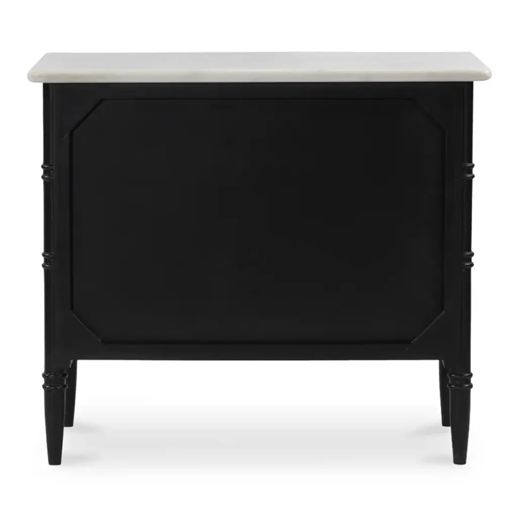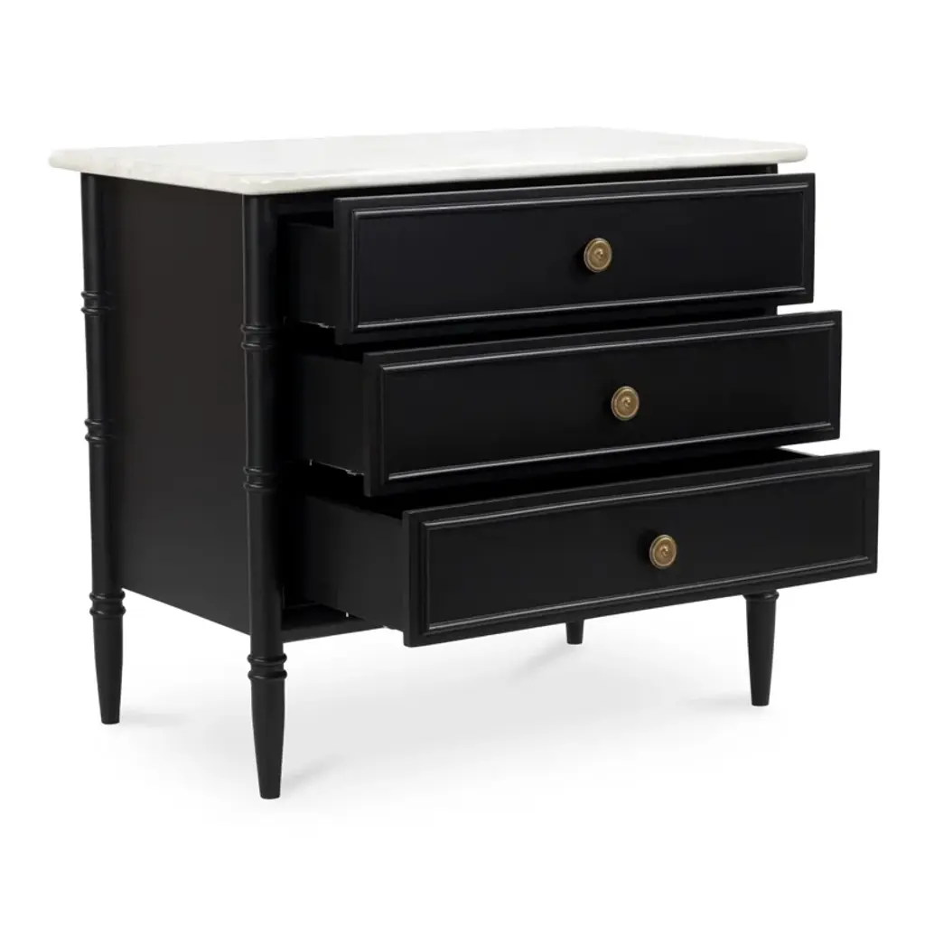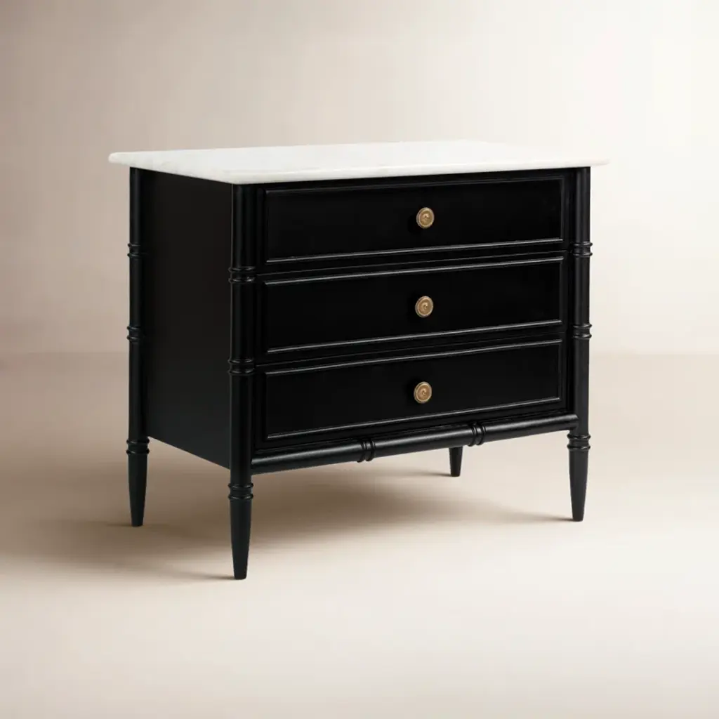 Inspired by the everyday grace of Provence style, the Berlin nightstand showcases a classically graceful profile with distinctive turned details. Crafted from Mango wood, this piece is crowned with an expressive marble top and finished with solid antique finished brass finish handles, adding a touch of timeless sophistication and natural beauty.