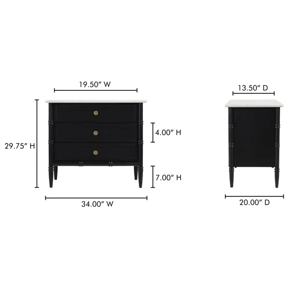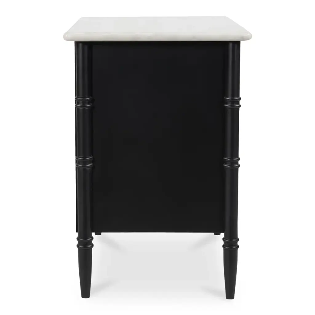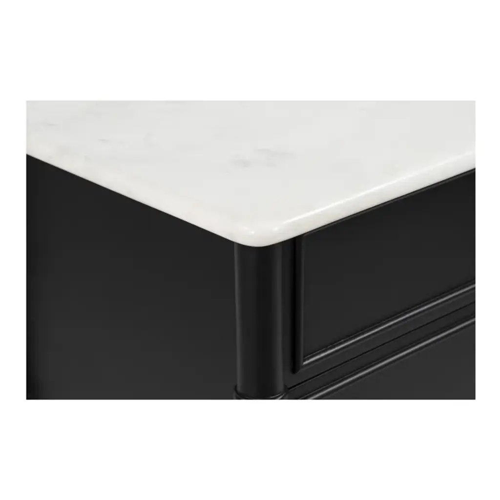 Inspired by the everyday grace of Provence style, the Berlin nightstand showcases a classically graceful profile with distinctive turned details. Crafted from Mango wood, this piece is crowned with an expressive marble top and finished with solid antique finished brass finish handles, adding a touch of timeless sophistication and natural beauty.
