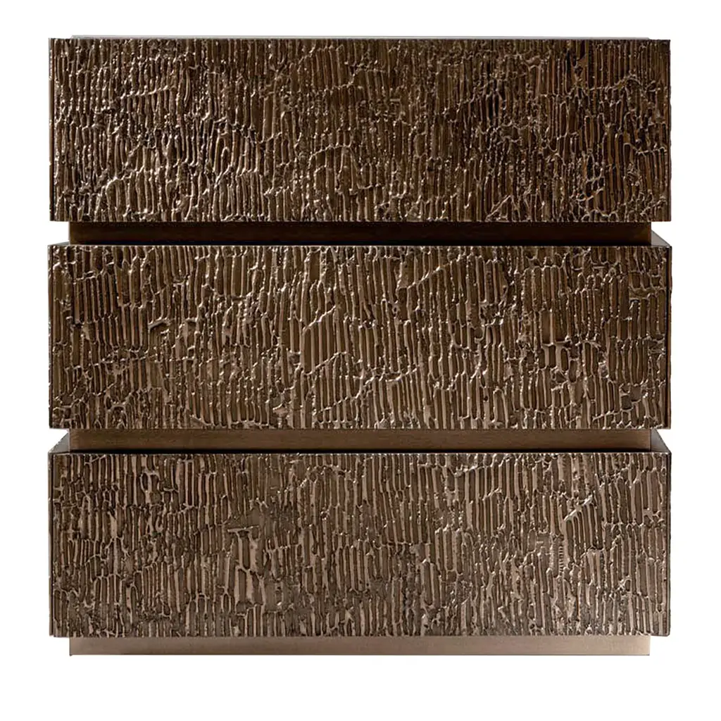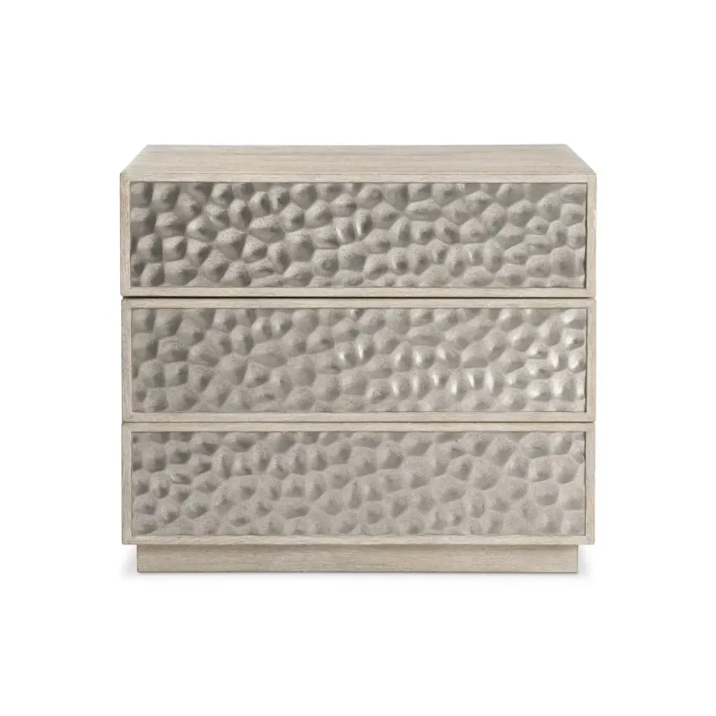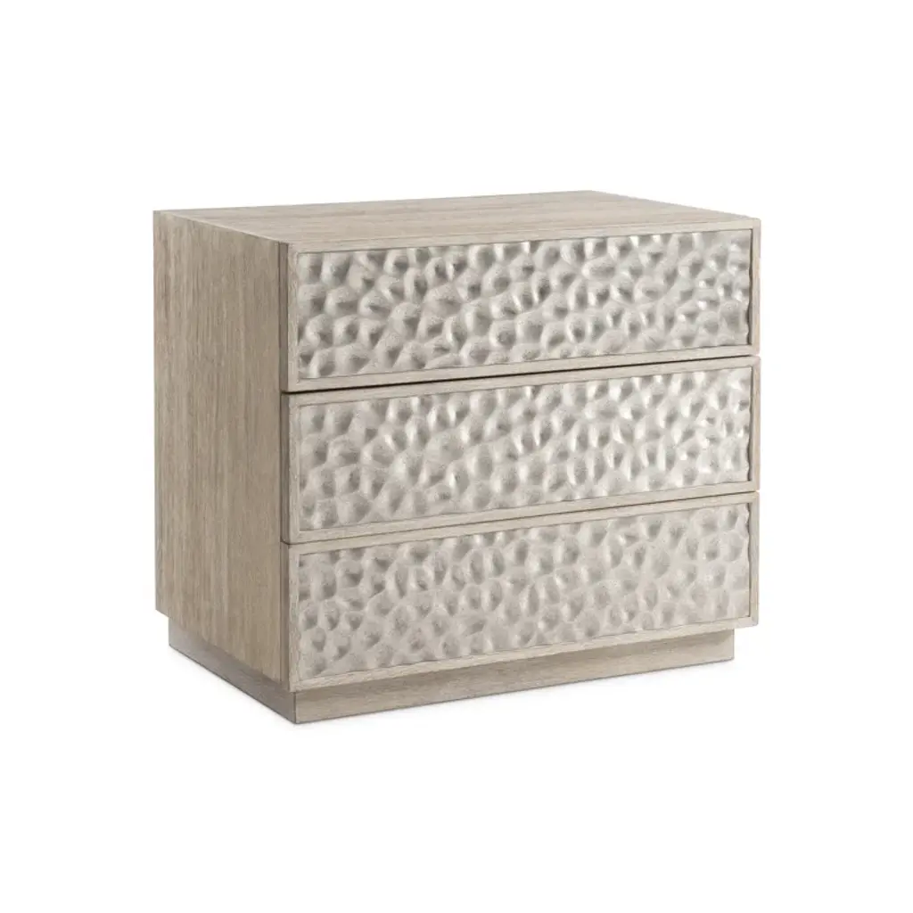 Hammered cast aluminum defines a new modern primitive design for the drawer fronts on the Hansby nightstand. The textural look is balanced by a light wood Trevin finish on the case and plinth base. A two-port A+C USB charging unit provides a high-tech element.