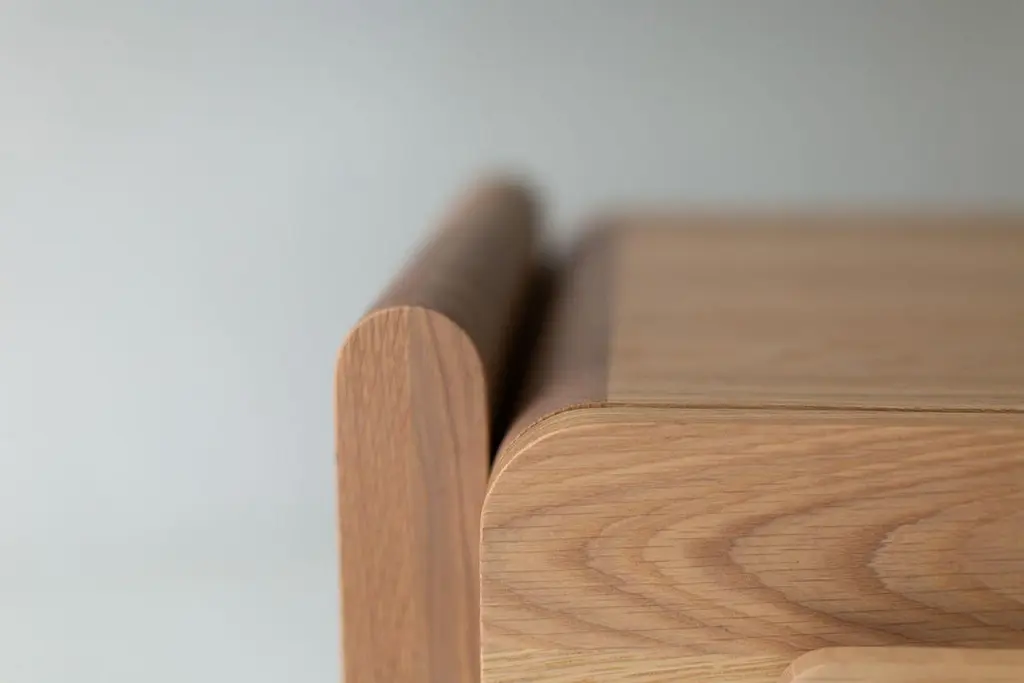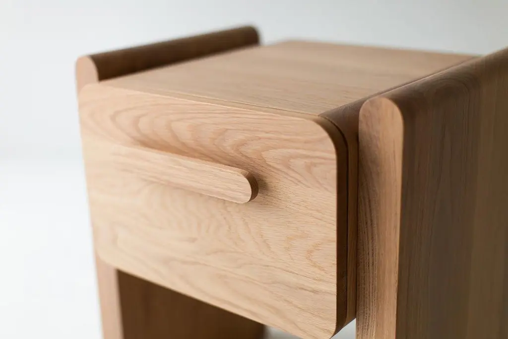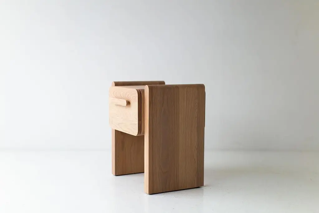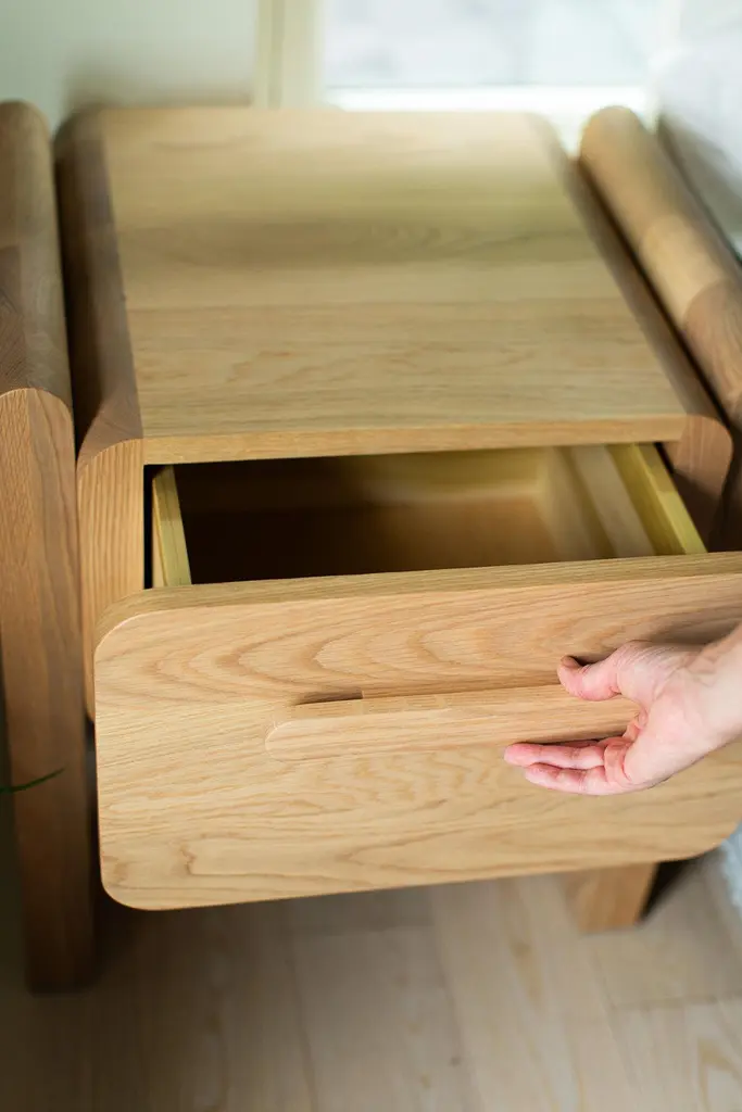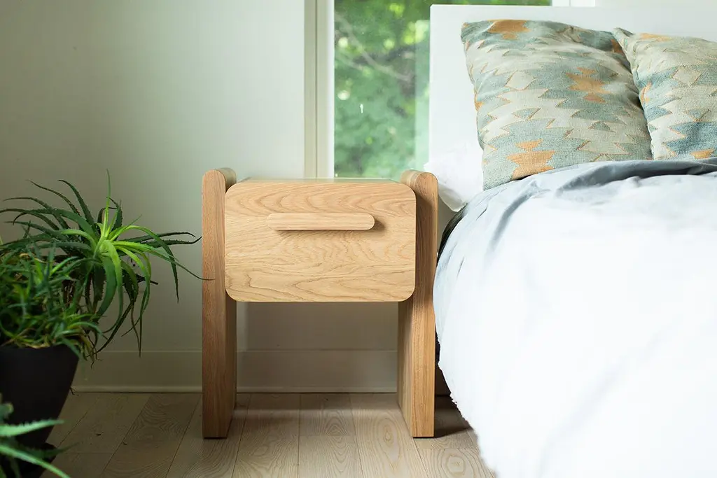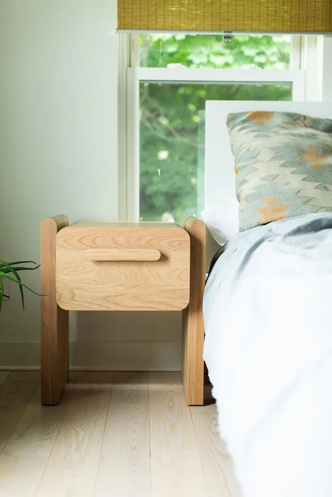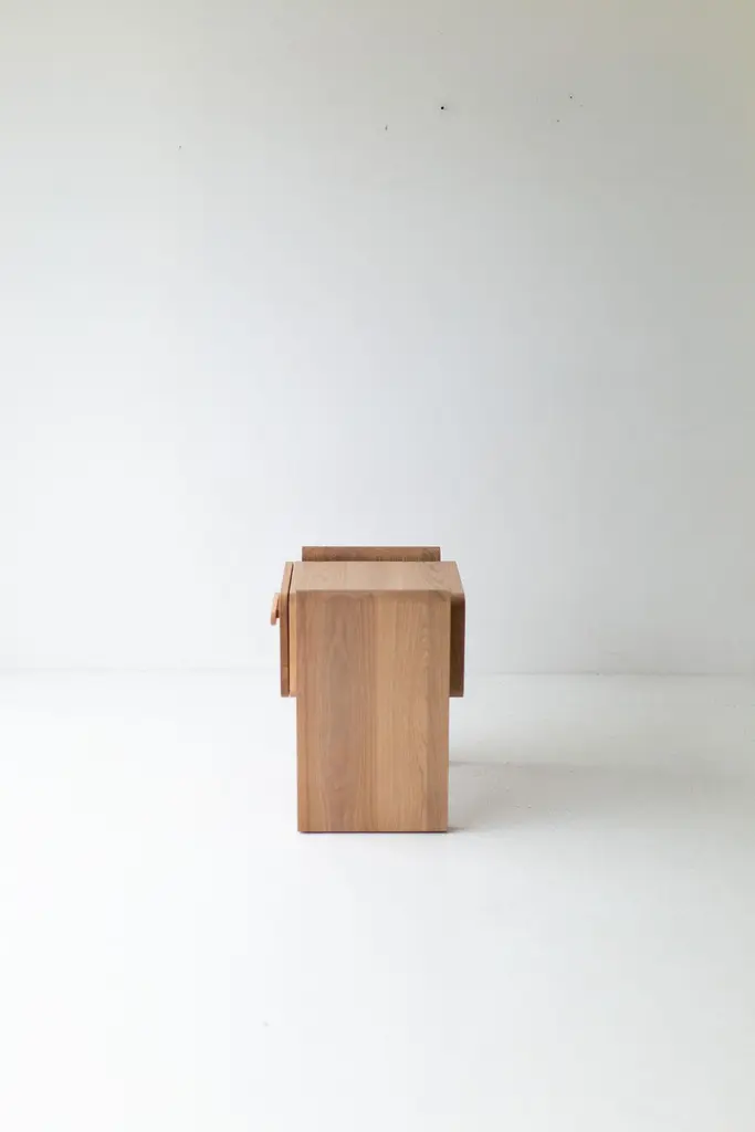 Bertu Nightstands, Iris Oak Nightstand, Bleached This Iris Nightstand in Bleached White Oak is made in the heart of Ohio with locally sourced wood. Each piece is hand-made with solid white oak and finished with a beautiful matte commercial grade finish. It is important to us to let the natural beauty of the wood shine. We use secondary wood for the drawers (poplar), and each is constructed with dovetail joints. We absolutely love this design and all the curves feel very current and modern.specsPeriod/Model: New; Mid Century Modern InspiredSpecs: White Oak, Poplar, Commercial grade finishIndoor/Outdoor: IndoorCustomizable: Yes! It's what we do :)dimensions H: 23"W: 20"D: 17" (18" with handle)SKU: Bertu Nightstands, Iris Oak Nightstand, Bleached