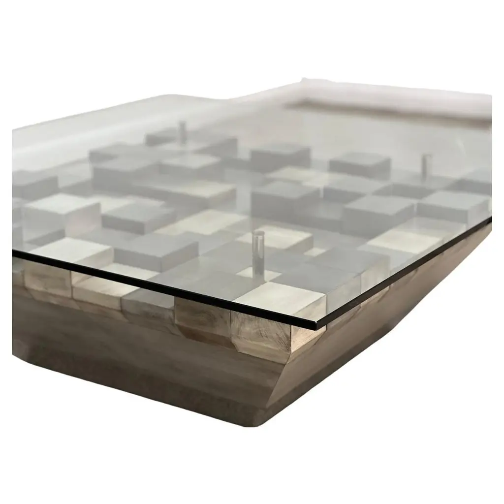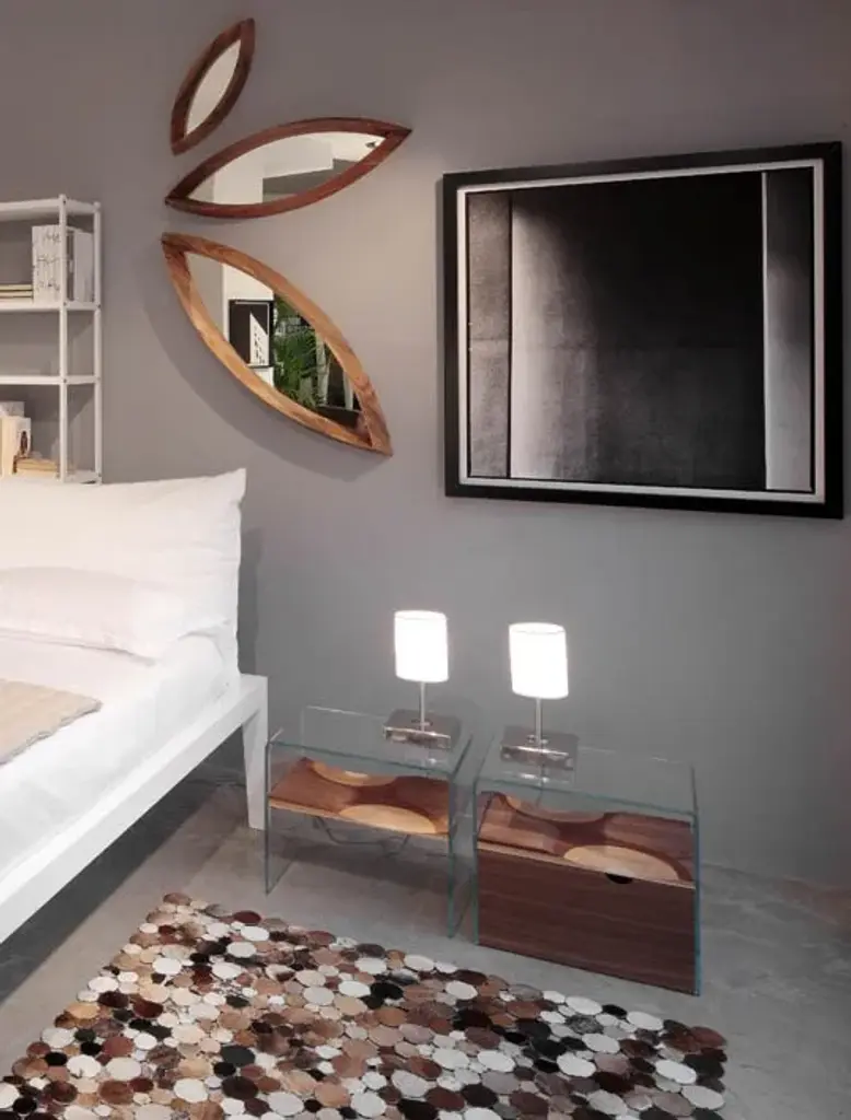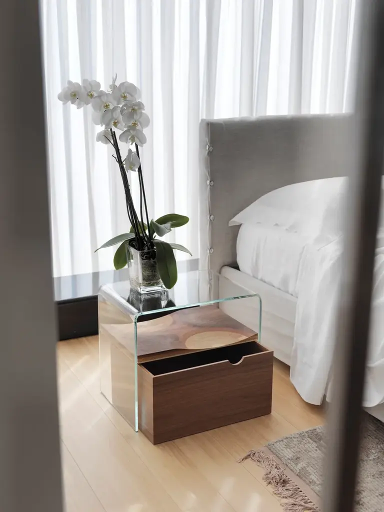 Toyo Ito's Ripples bench, winner of the Compasso d'Oro 2004, has given rise to a collection composed of different furnishing accessories. One of these is the Bifronte bedside table, in which a small portion of Ripples is framed in an extra-clear glass bridge, giving the sensation that it is floating in the air.The capacious drawer moves on wheels and has a white lacquered front and one in Canaletto walnut, to match the colours of the sleeping area.MATERIALS:Extra clear curved glass structure. Multilayer solid wood shelf in five different woods (Canaletto walnut, mahogany, cherry, oak and ash).Drawer in MDF veneered in Canaletto walnut with a white lacquered front and a walnut front.