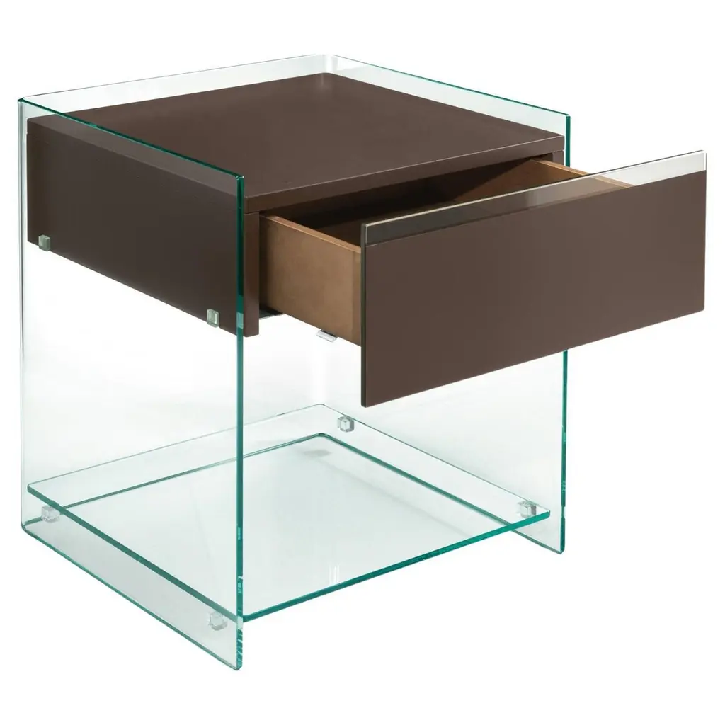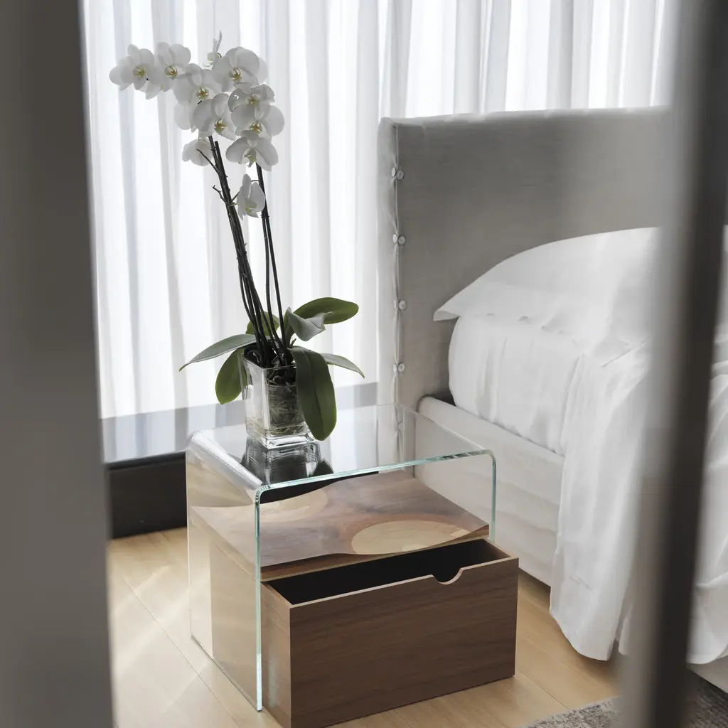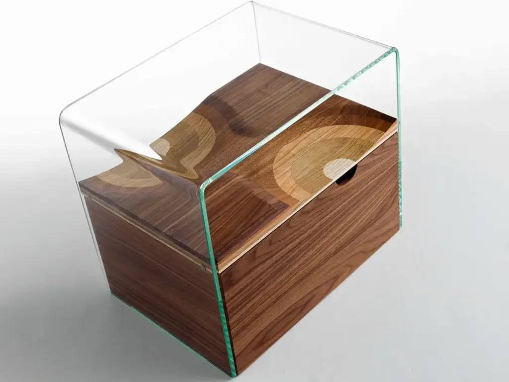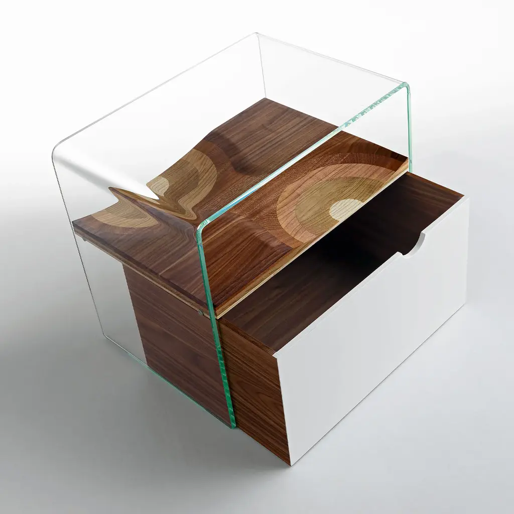 Exquisitely designed by Toyo Ito and part of the Ripples Collection, this nightstand features a shelf made of five different types of wood (walnut, cherry, mahogany, ash, and oak), enclosed in an extra clear tempered glass frame, creating a “trompe l’oeil” effect of mid-air suspension. A capacious drawer on wheels made of MDF is at the bottom, boasting a white lacquered finish on the sides and walnut front and back.
