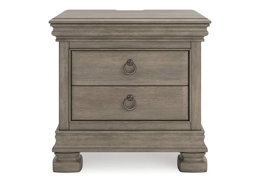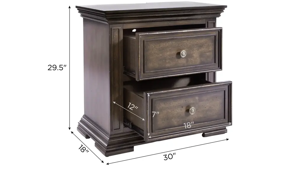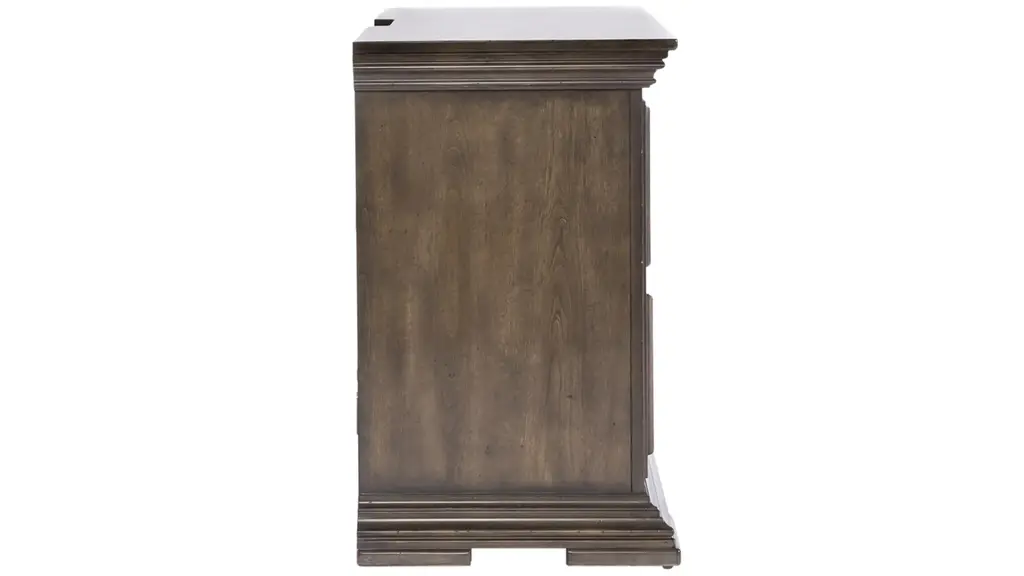 This unique Big Valley Nightstand w/ Charging Station is the perfect way to accent your room with traditional living design. The brownstone finish accompanied by heavy distressing creates a truly unique look. Crafted with rubberwood solids and birch veneers, this night stand features fully stained interior drawers, premium felt lined top drawers and bottom case proofing, tied together effortlessly with antique pewter knob hardware. With today's electronics in mind, this piece includes a charging stations for user convenience.