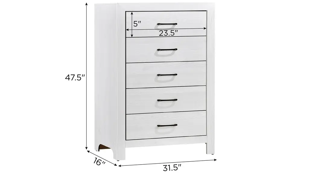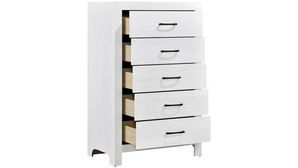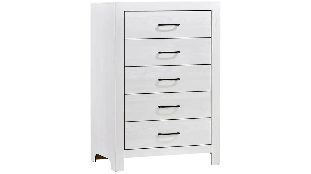 Modern lines and rustic styling are paired to create the look of the Bijou Chest. The embossed faux-wood veneer's texture is highlighted by a rustic finish for a realistic wood look. Providing complementing contrast, the drawer fronts of the chest feature black metal hardware. Subtle framing defines the profile of the chest, further lending to the unfettered design.