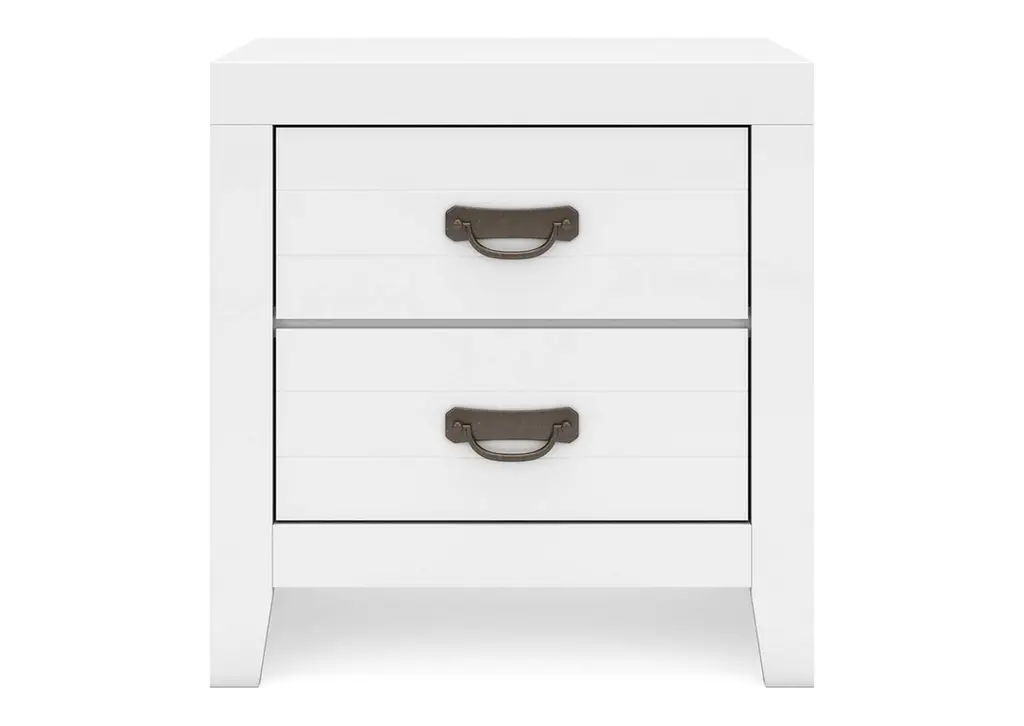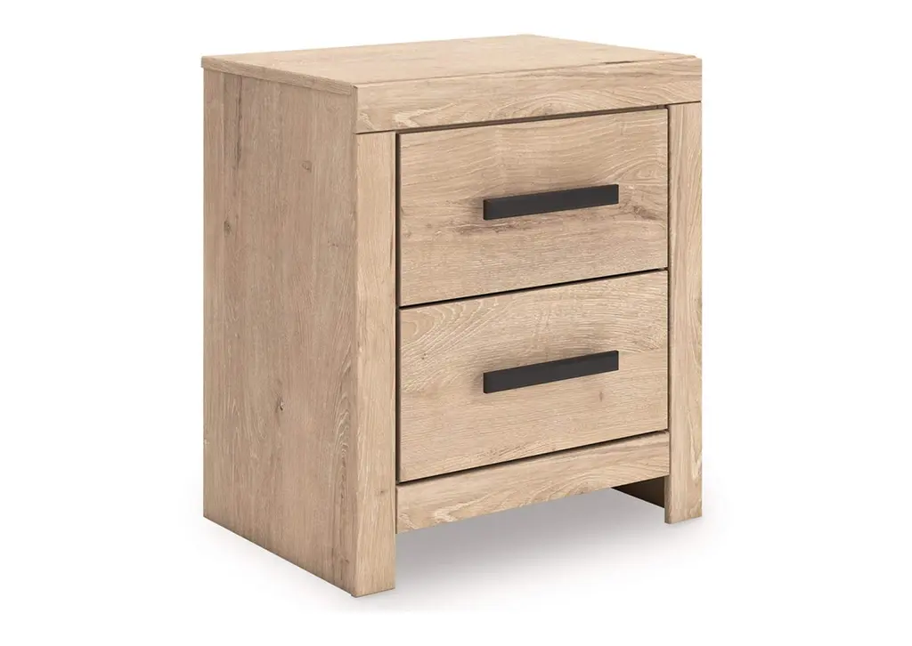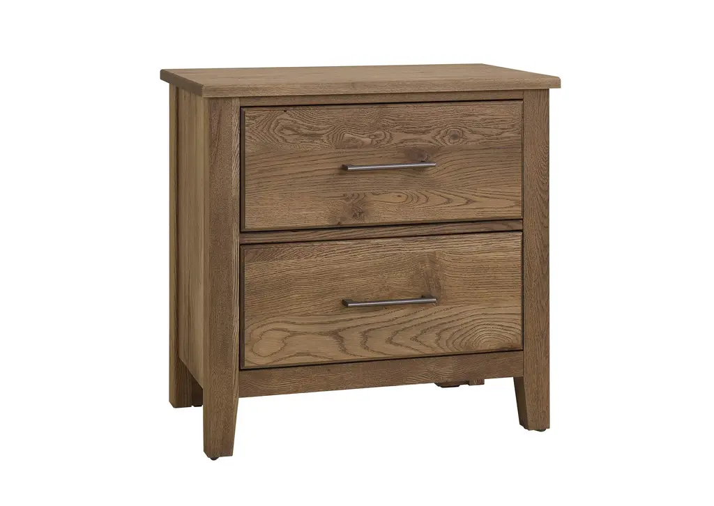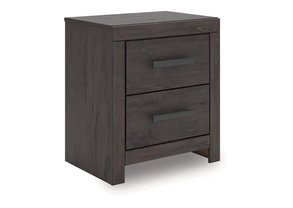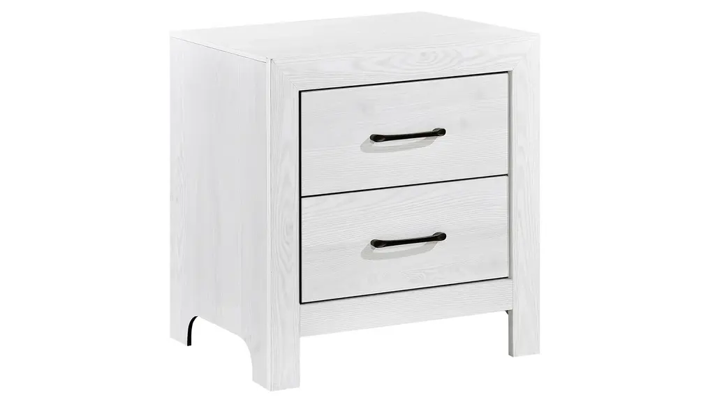 Modern lines and rustic styling are paired to create the look of the Bijou Nightstand. The embossed faux-wood veneer's texture is highlighted by a rustic finish for a realistic wood look. Providing complementing contrast, the drawer fronts of the nightstand feature black metal hardware. Subtle framing defines the profile of the nightstand, further lending to the unfettered design.