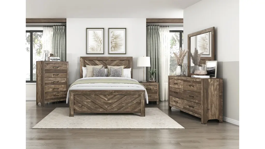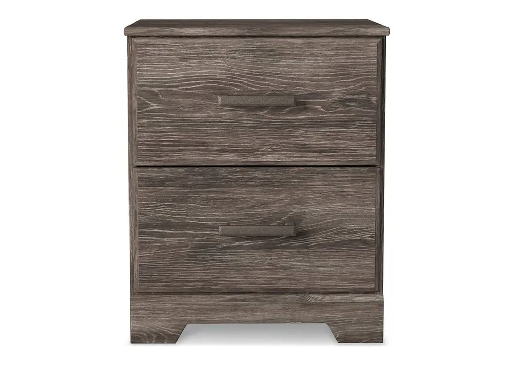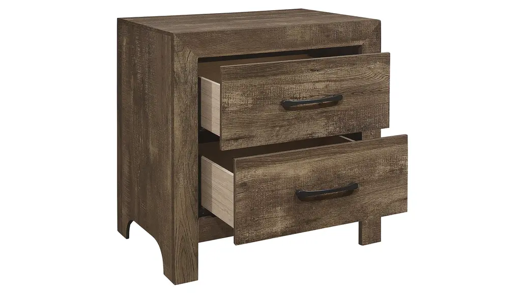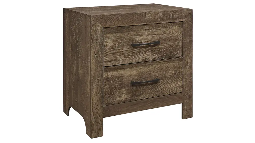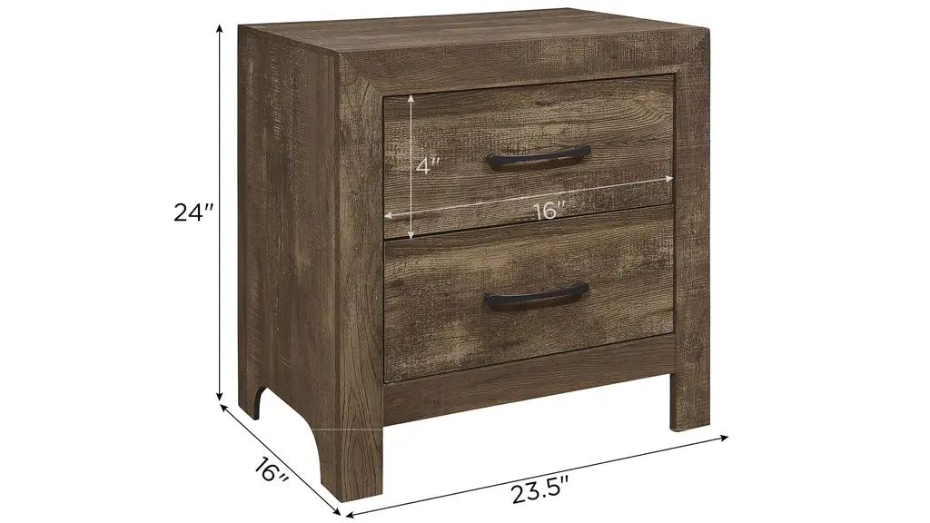 Modern lines and rustic styling are paired to create the look of the Bijou Nightstand. The embossed faux-wood veneer's texture is highlighted by a rustic finish for a realistic wood look. Providing complementing contrast, the drawer fronts of the nightstand feature black metal hardware. Subtle framing defines the profile of the nightstand, further lending to the unfettered design.