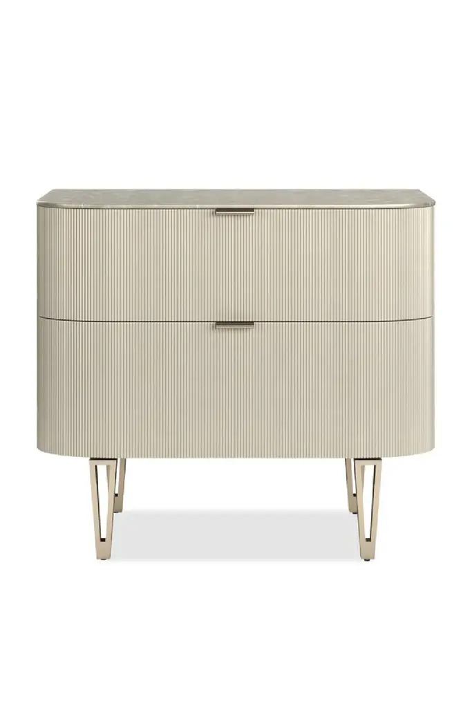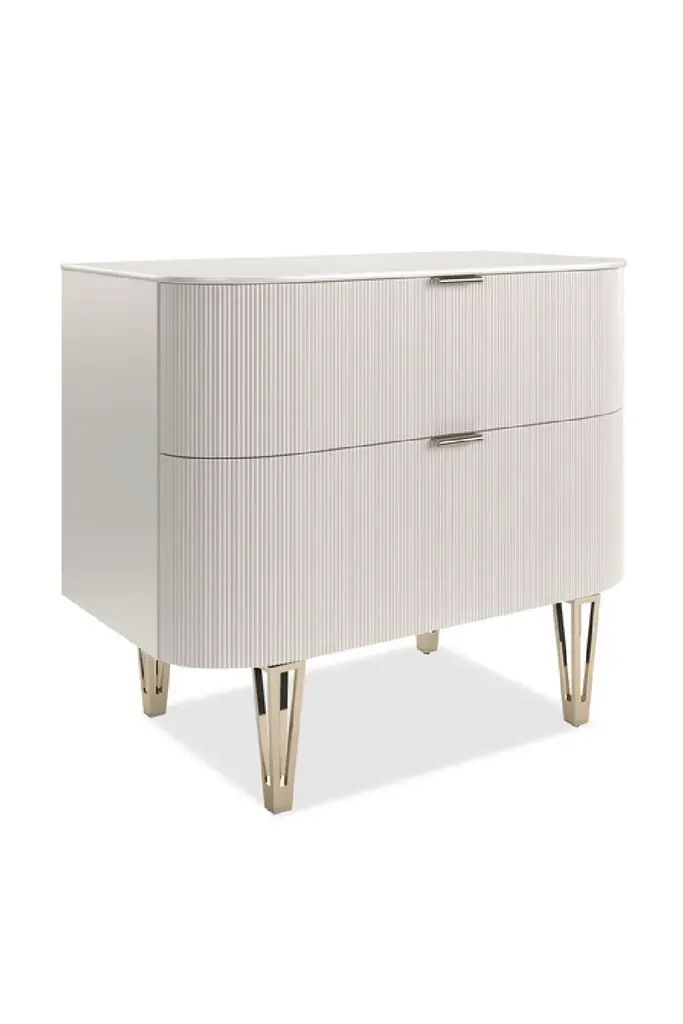 No other nightstand will look the same after you’ve experienced the graceful elegance of this head-turner. A lustrous palette and Whisper of Gold highlights its rounded silhouette and fluted surfaces. This nightstand’s glimmering tapered metal feet in Whisper of Gold add an unforgettable finishing touch.
