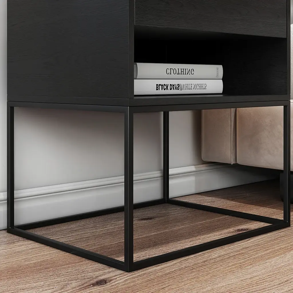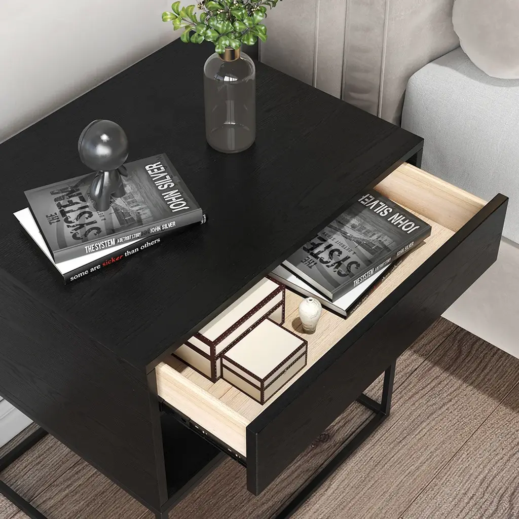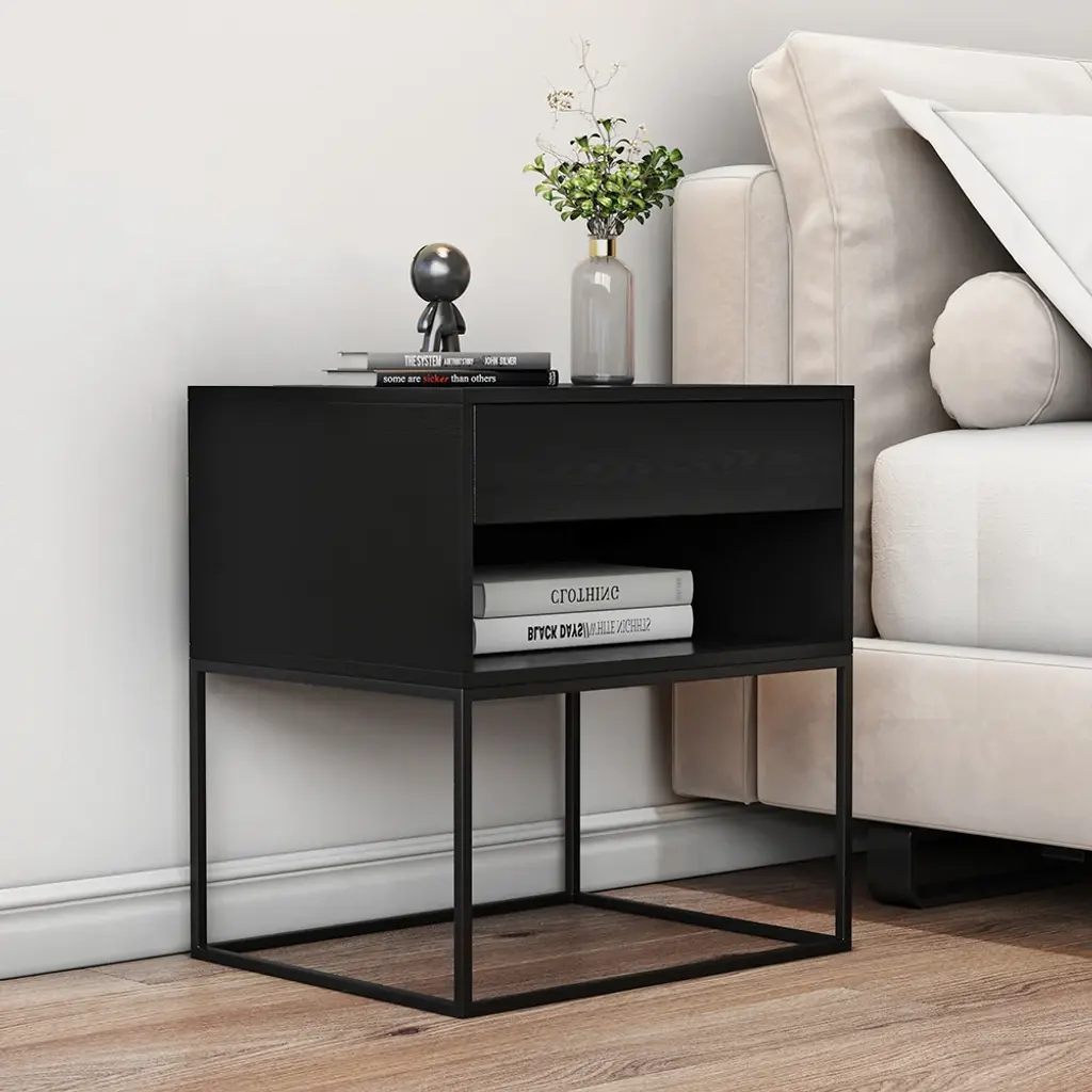 Black Modern Nightstand With Drawer And Black Metal Base Set Of 2