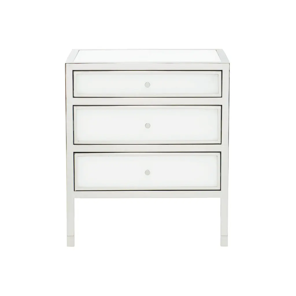 The Blanca Nightstand from Bernhardt effortlessly blends modern style with practical functionality. Its sleek stainless steel design and snow glass panels bring a touch of glam to any bedroom. The three spacious drawers, adorned with chic round pulls, are painted white inside for a clean and contemporary finish. Upgrade your bedroom decor with this elegant nightstand. Highlights