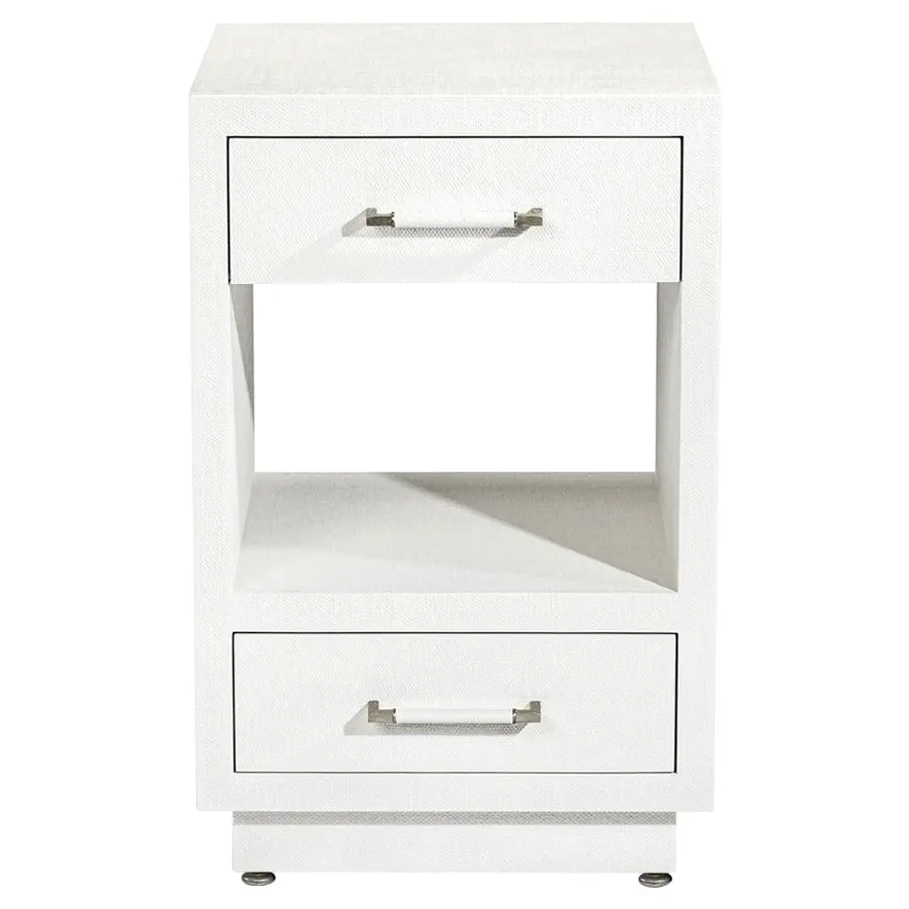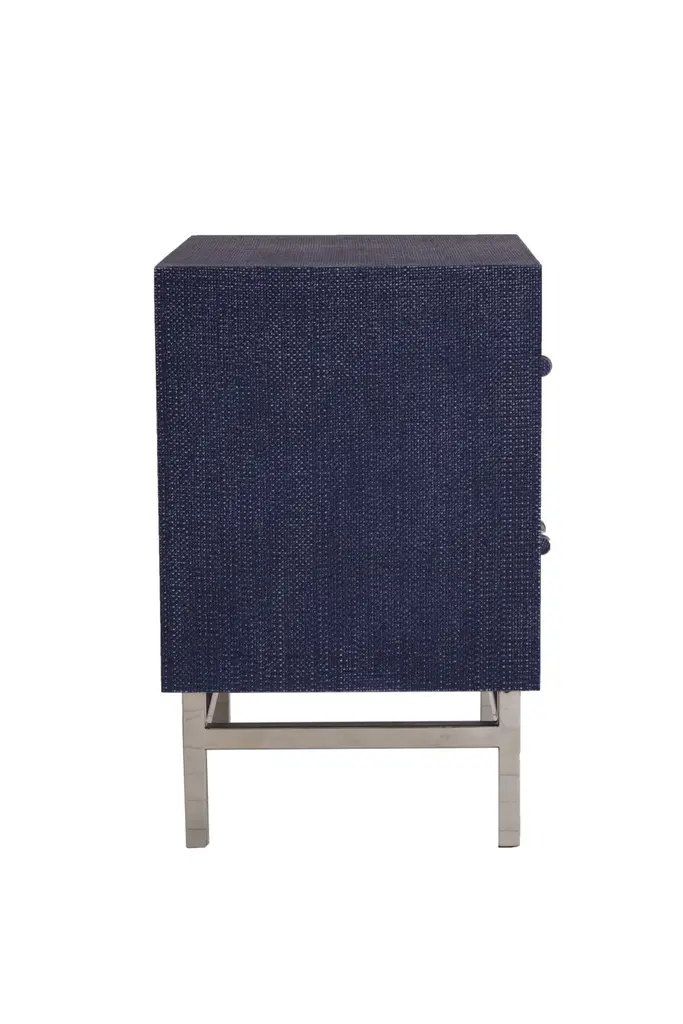 A chic bedside table with textured rattan veneer in a rich, cobalt blue finish adding a pop of color to your interiors. Andrew Martin Hesta has two spacious drawers providing ample bedside storage and is balanced on sleek polished chrome legs with modern bar handles.
