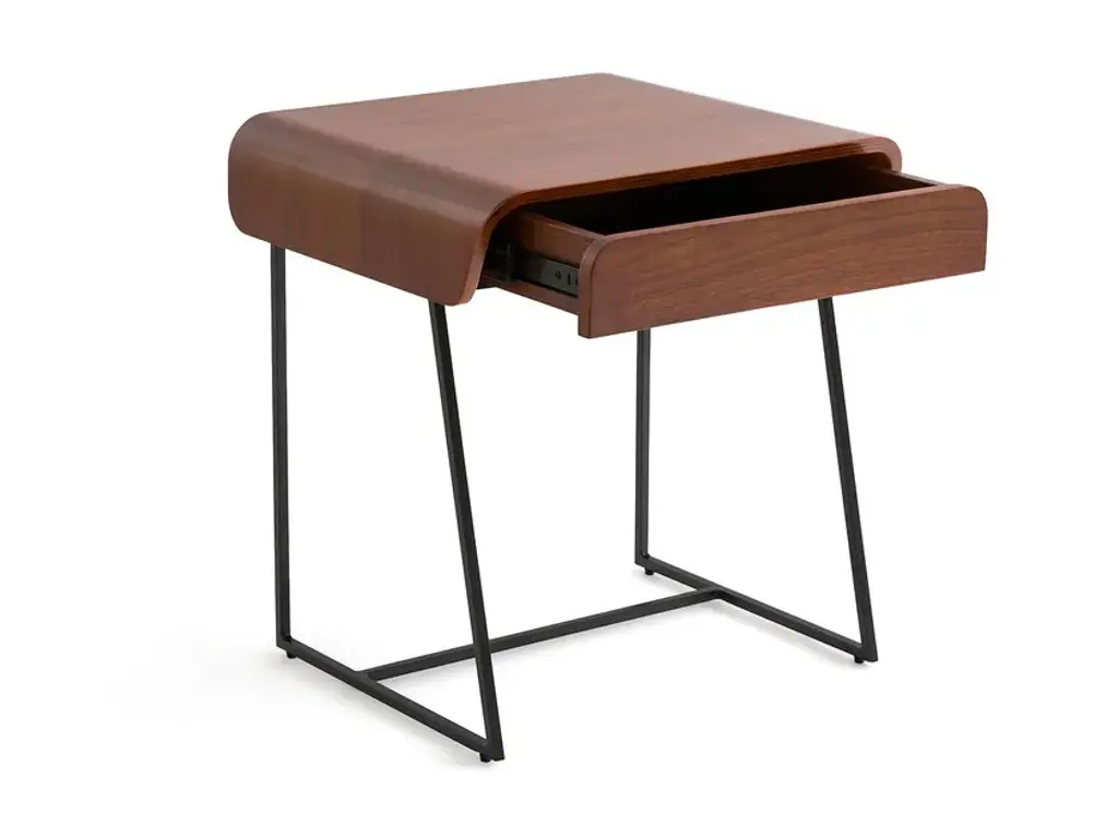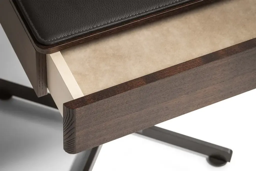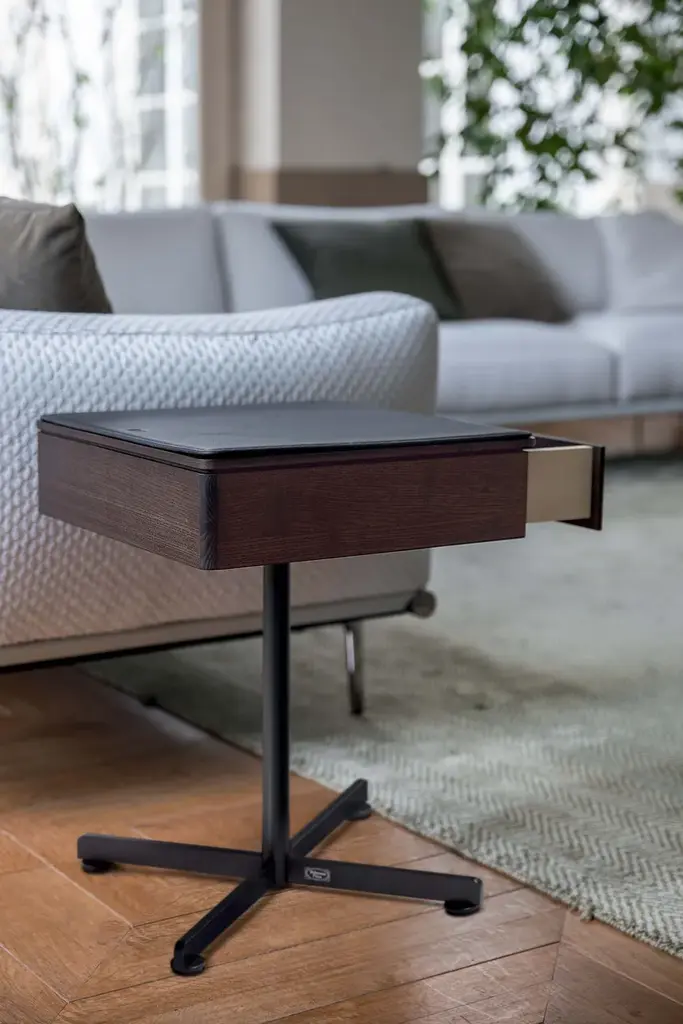 Stylish and functional, the Bob side table with integrated drawer completes any room with elegant simplicity. This Bob side table model is particularly suitable for the bedroom, thanks to the storage compartment that makes it ideal as a nightstand. Designer Jean-Marie Massaud offers refined combinations of wood, leather, marble and steel for a free and casual formal result, inspired by the international lifestyle of Kennedian influence.TThe BOB side table with drawer has a solid ash wood top and drawer front. The base and leg are made of painted steel, available in a number of finishes. Optional add-ons include a beige Alcantara non-slip mat to protect and decorate the drawer inside, and a lightly padded Pelle Frau® mat with tone-on-tone or contrast stitching to be placed on to the tabletop for an additional level of comfort.hThe BOB coffee table with square top is available in different sizes. The tabletop is finished with Canaletto walnut, Pelle Frau® leather, polished or semi-gloss marble with beveled edges. The upper part of the leg of the BOB coffee table is made of steel, on which is applied a collar insert that matches the top finish. The marble-top coffee table instead has its upper leg part upholstered in leather in a matching color. The leg base is made of steel, available in a range of finishes.Attractive and functional, the Bob side table completes every room with elegant simplicity. Designer Jean-Marie Massaud proposes refined combinations of wood, leather, marble and steel for a free and self-confident formal result inspired by a Kennedy-style international way of life. The Bob side tables have a steel base that is available in the gunmetal grey, ruthenium, brushed burnished and Canaletto walnut finishes (that latter is only available in the versions with top in leather or marble). The top is available in Pelle Frau® leather, birch plywood with Canaletto walnut veneer, Emperador marble or Calacatta gold marble (polished or semi-polished) (except for the ø 110 model). The upper part of leg always matches the finish of the table top. In the variants with marble top the upper part of the leg is upholstered in matching coloured leather.