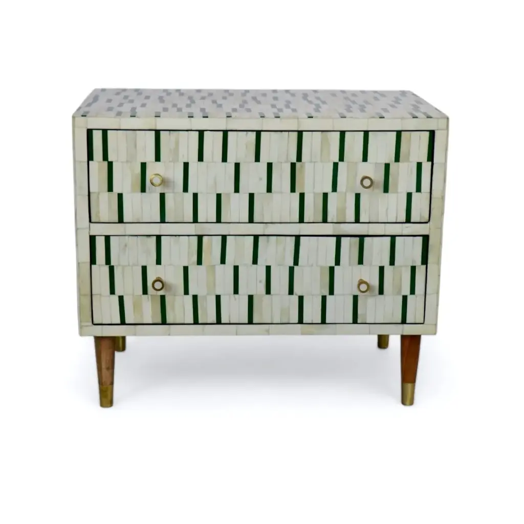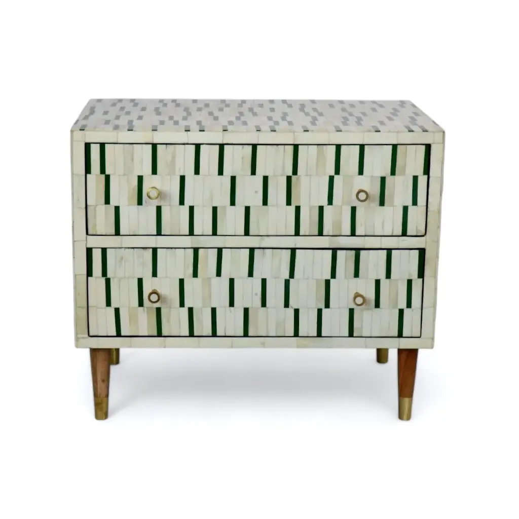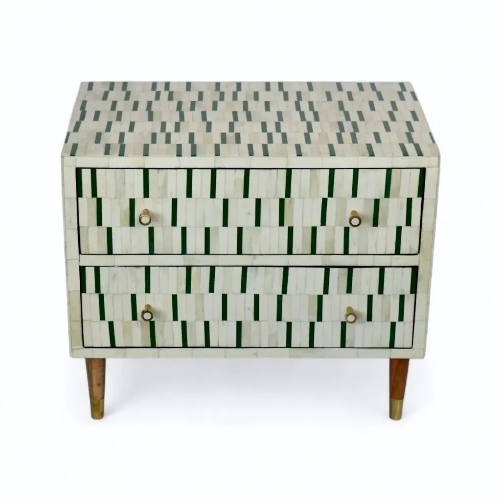 Bone Inlay Bedside Table In Green & White Geometric Pattern
