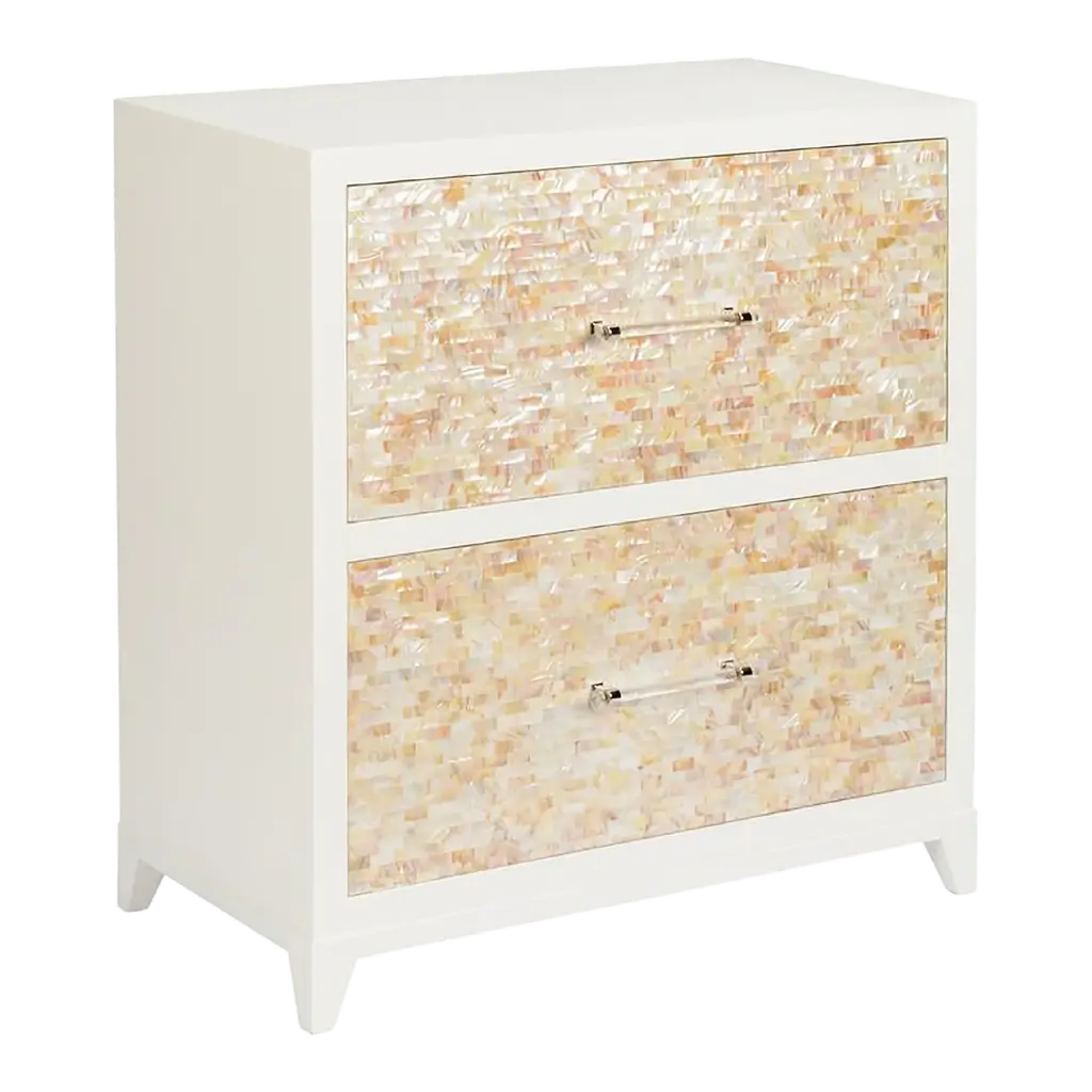 A bone inlay Bed side table with drawers is a stunning piece of furniture that adds a touch of elegance & artistry to your living room.This Bedside Bone Inlay table showcases a captivating mosaic pattern with delicate white and deep Green inlay arranged in a rhythmic, vertical design. Each Inlay has been carefully hand-set, creating a distinct texture and enhancing the visual appeal of the piece. It features two spacious drawers, each adorned with brass-finished knobs for a touch of sophistication and ease of use. The sturdy wooden legs provide a stable base, ensuring longevity. Size: 16" D x 26" W x 22".5 H Key Features: • Handcrafted Bone Inlay: Meticulously designed with premium bone inlay for an exquisite and artisanal touch. • Modern Geometric Pattern: The blue and white pattern offers a chic, contemporary aesthetic that complements various decor styles. • Spacious Storage: Two large drawers provide ample space for storing essentials, keeping your space organized and clutter-free. • Durable Construction: Supported by sturdy wooden legs that adds to the dresser’s durability and stability. Material Care Instruction: • Dust regularly with a dry, soft cloth. • Avoid or limit direct exposure to sunlight to prevent fading and loss of luster. • Use a clean, buff cloth lightly misted with water for frequent cleaning. • Avoid abrasive cleaners to protect the finish. • In case of spills, clean immediately with a damp cloth to prevent stains.