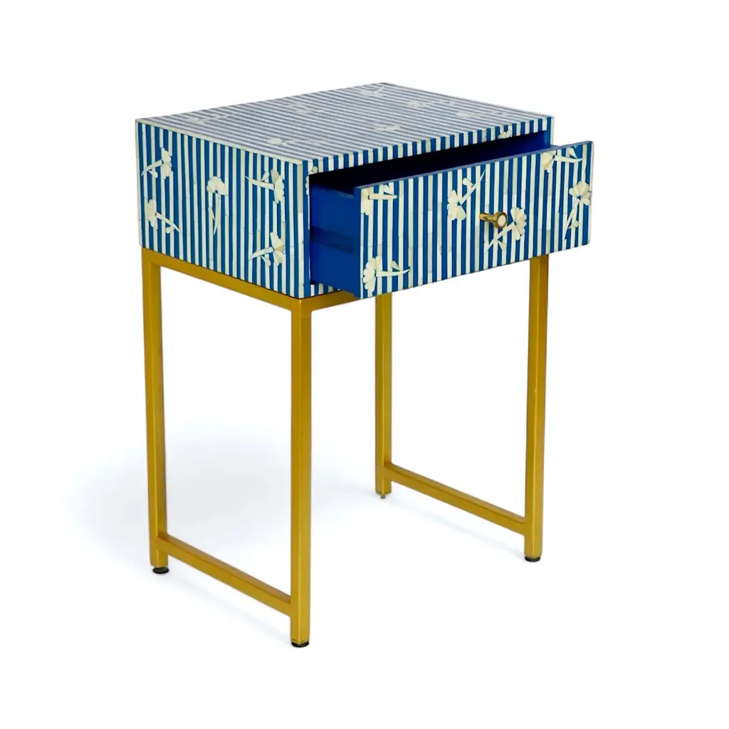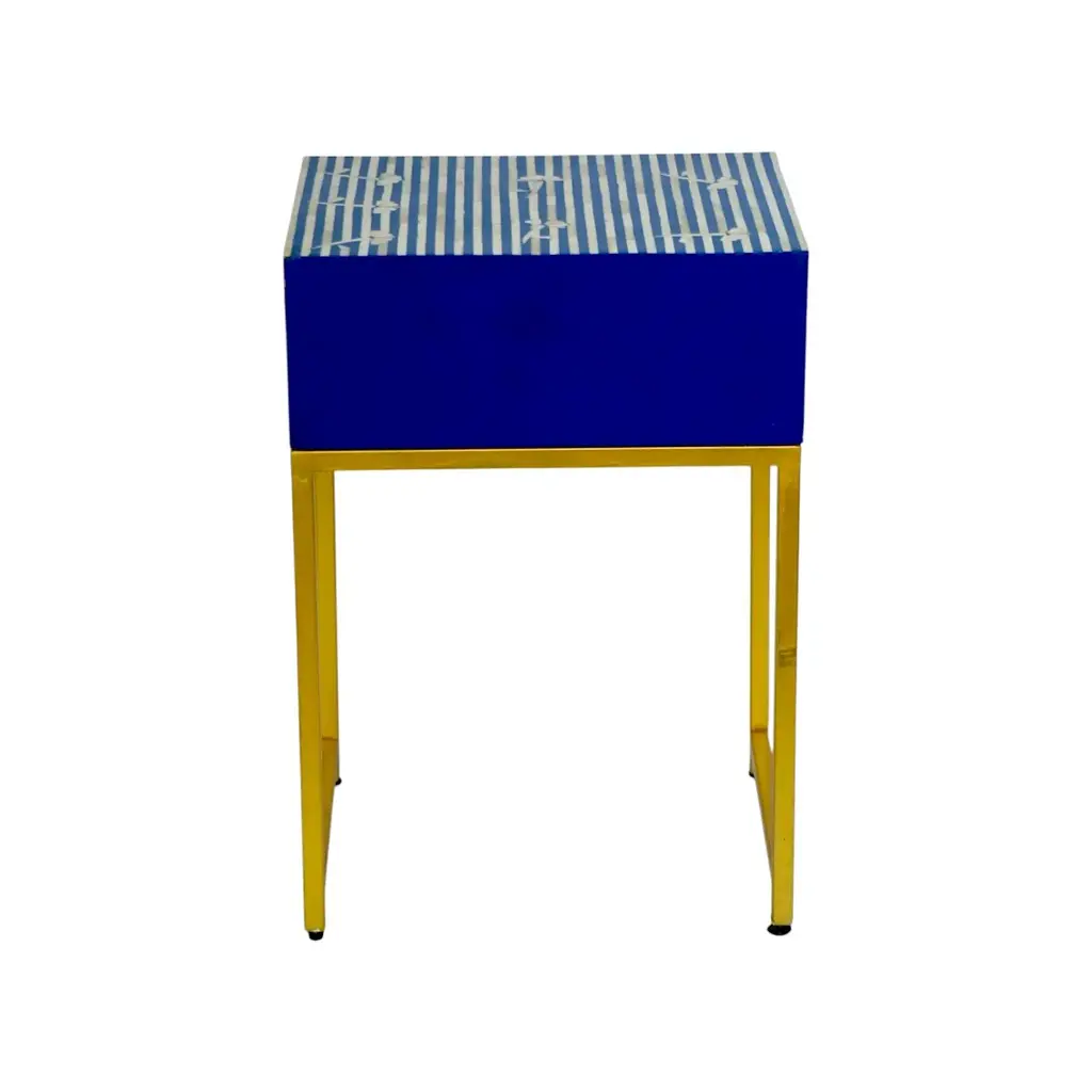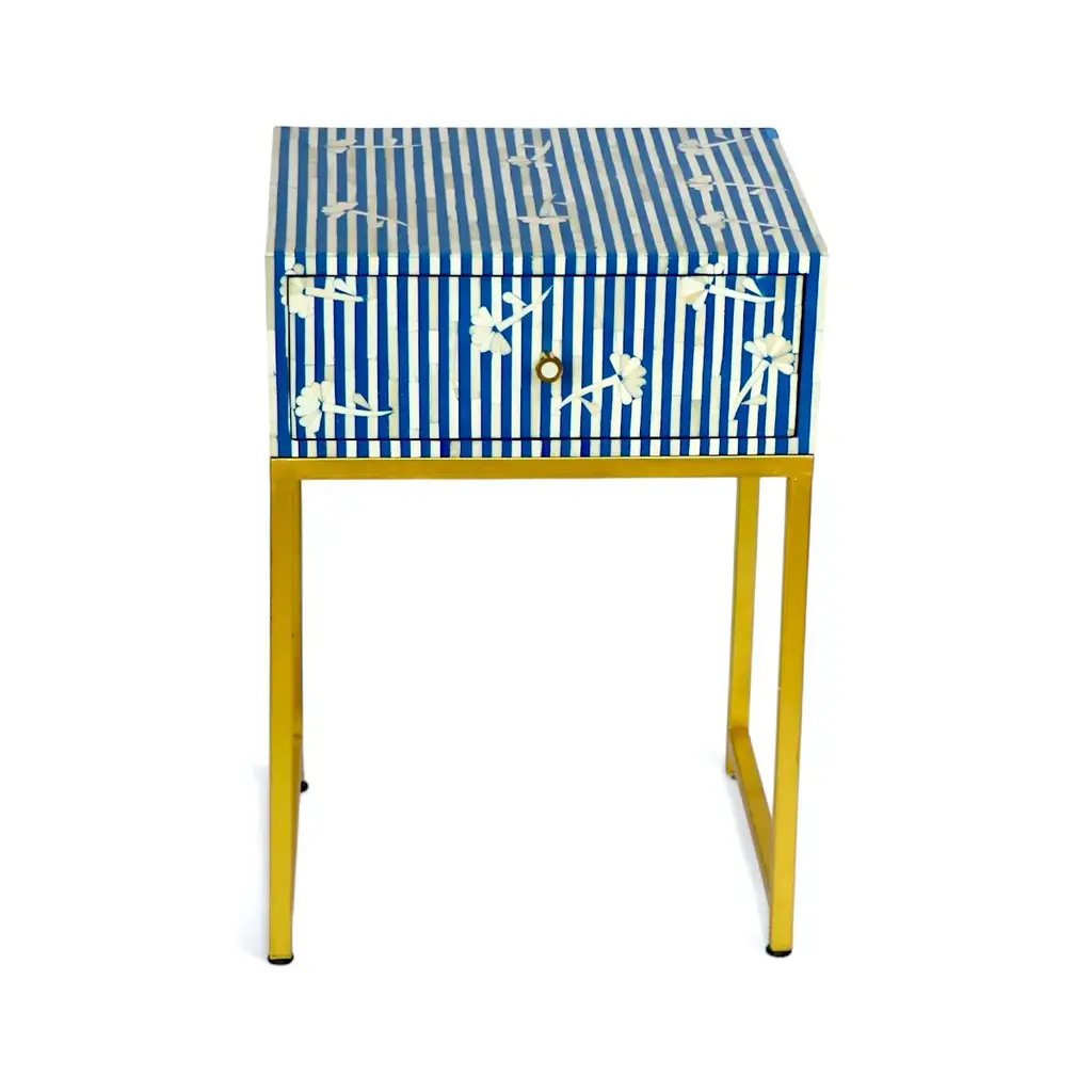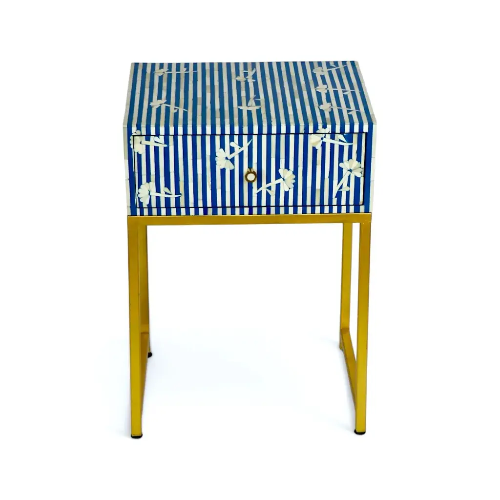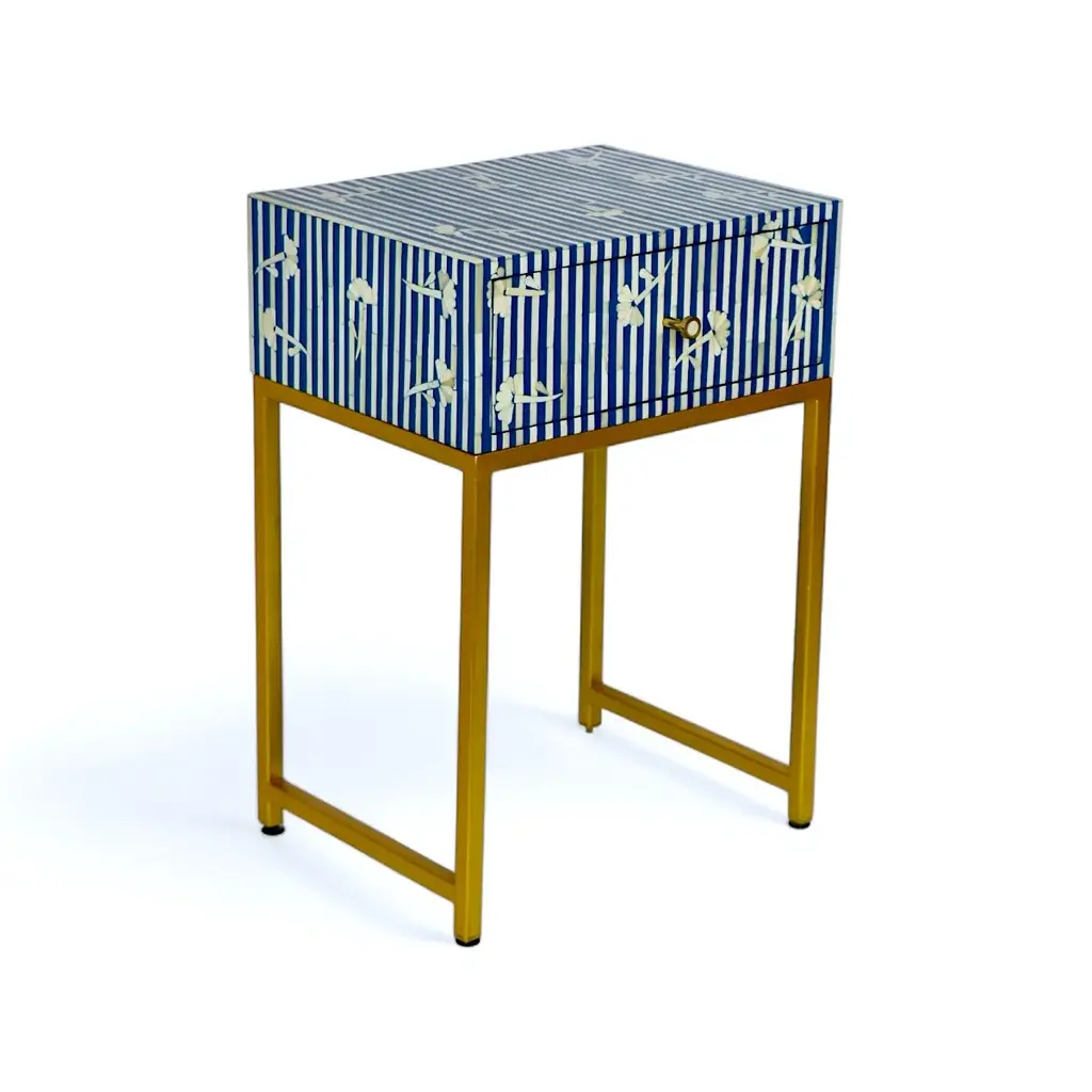 Handmade in India, this traditional Blue and bone inlaid bedside table features a sweet floral motif and a brass polished metal stand. It would be just perfect by the bed or living room. Floral Bedside table with brass polished metal stand Dimensions: 18" W x 14" D x 25" H Material: Bone, Wood, Resin Color: Blue