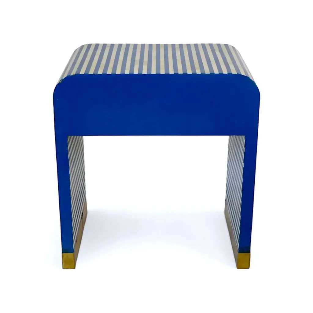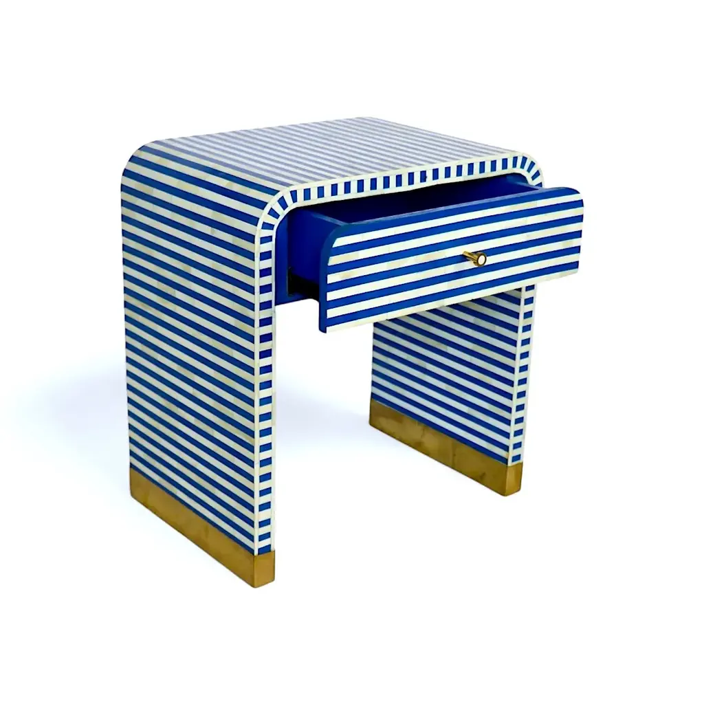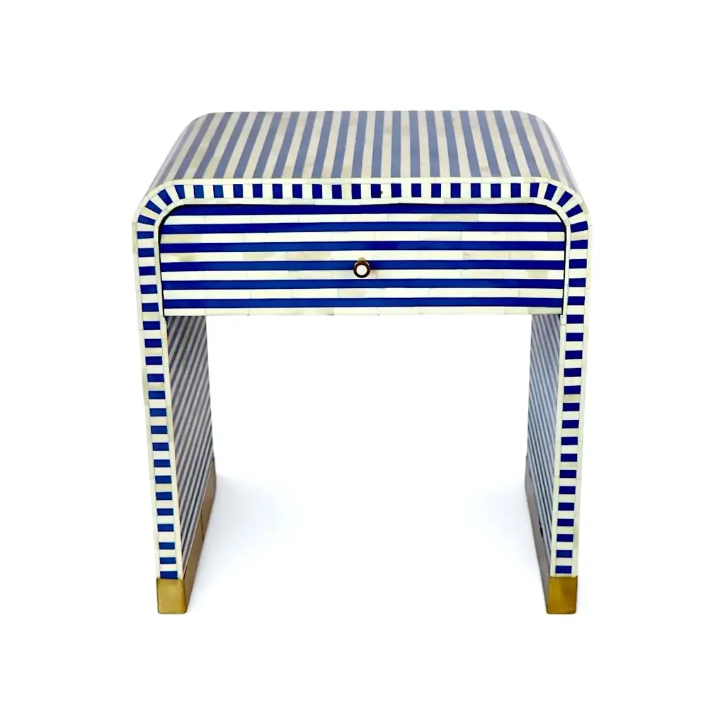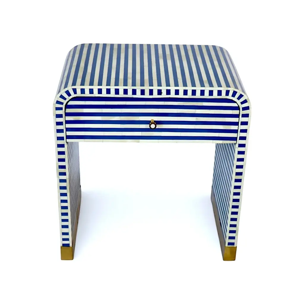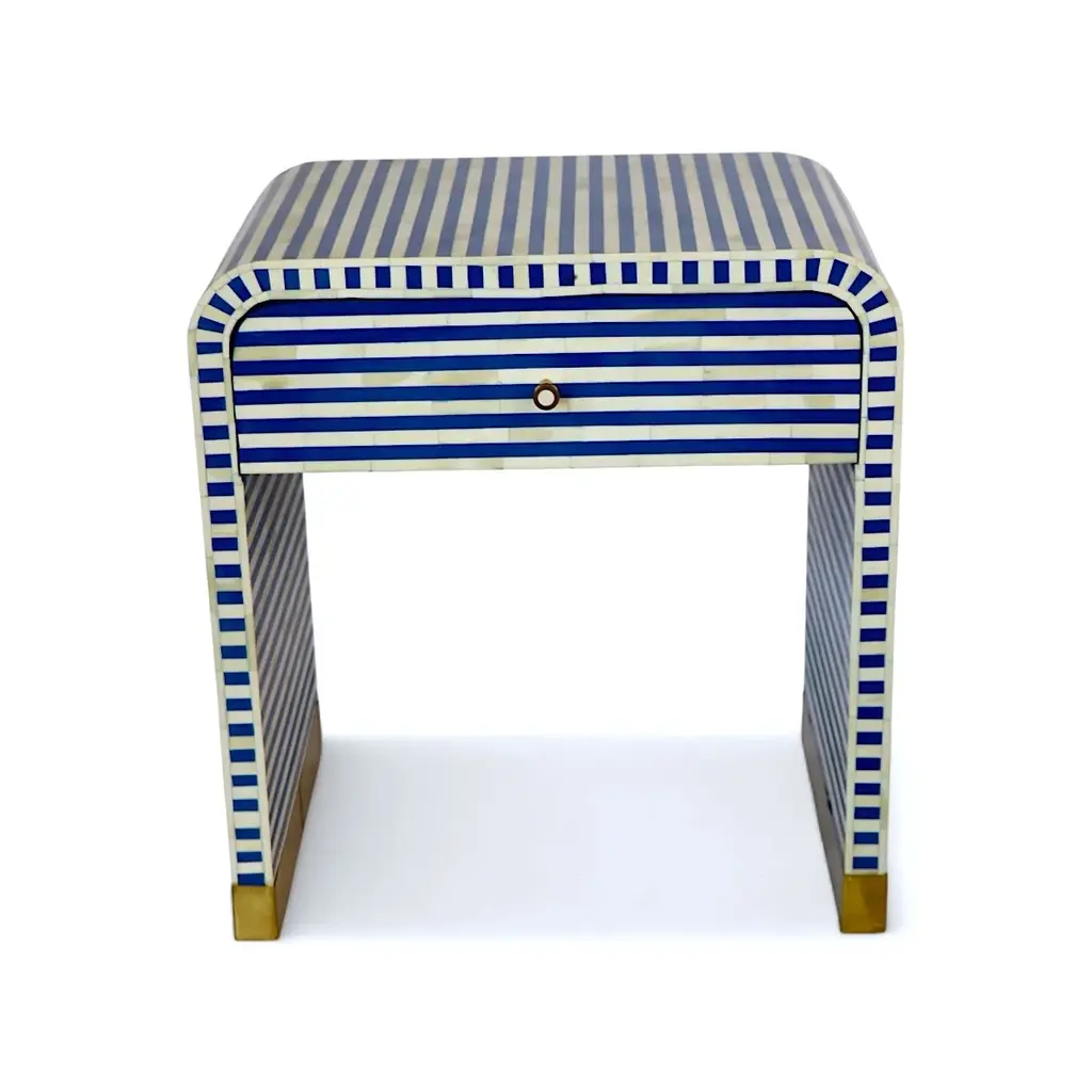Elevate your bedroom decor with our Bone Inlay Curved Collection—a contemporary take on timeless elegance. This striped bedside table features a bold and shapely design, adding sophistication and charm to any space. Equipped with a spacious drawer, it keeps your bedside essentials neatly tucked away while doubling as a stunning decorative piece.Handcrafted in India from ethically sourced buffalo bones, each table is a testament to the royal craftsmanship of Rajasthan. The intricate bone fragments are hand-carved and affixed in a mosaic-like design, filled with resin to create a smooth and seamless finish. Key Features: •Dimensions: 16" x 24" x 26" H •Ethical Craftsmanship: Handcrafted from ethically sourced buffalo bones. •Modern Design: Sleek, striped pattern with a curved silhouette. •Functional Storage: Includes a spacious drawer for practical organization. •Timeless Elegance: Inspired by the regal art of Bone Inlay, originating in Rajasthan. Perfectly complements soft linens, velvet accents, natural timber, or bold statement accessories. Add a touch of royal heritage and contemporary flair to your bedroom with this unique bedside table.
