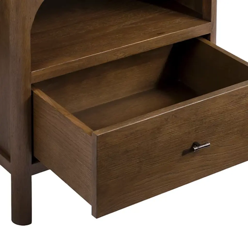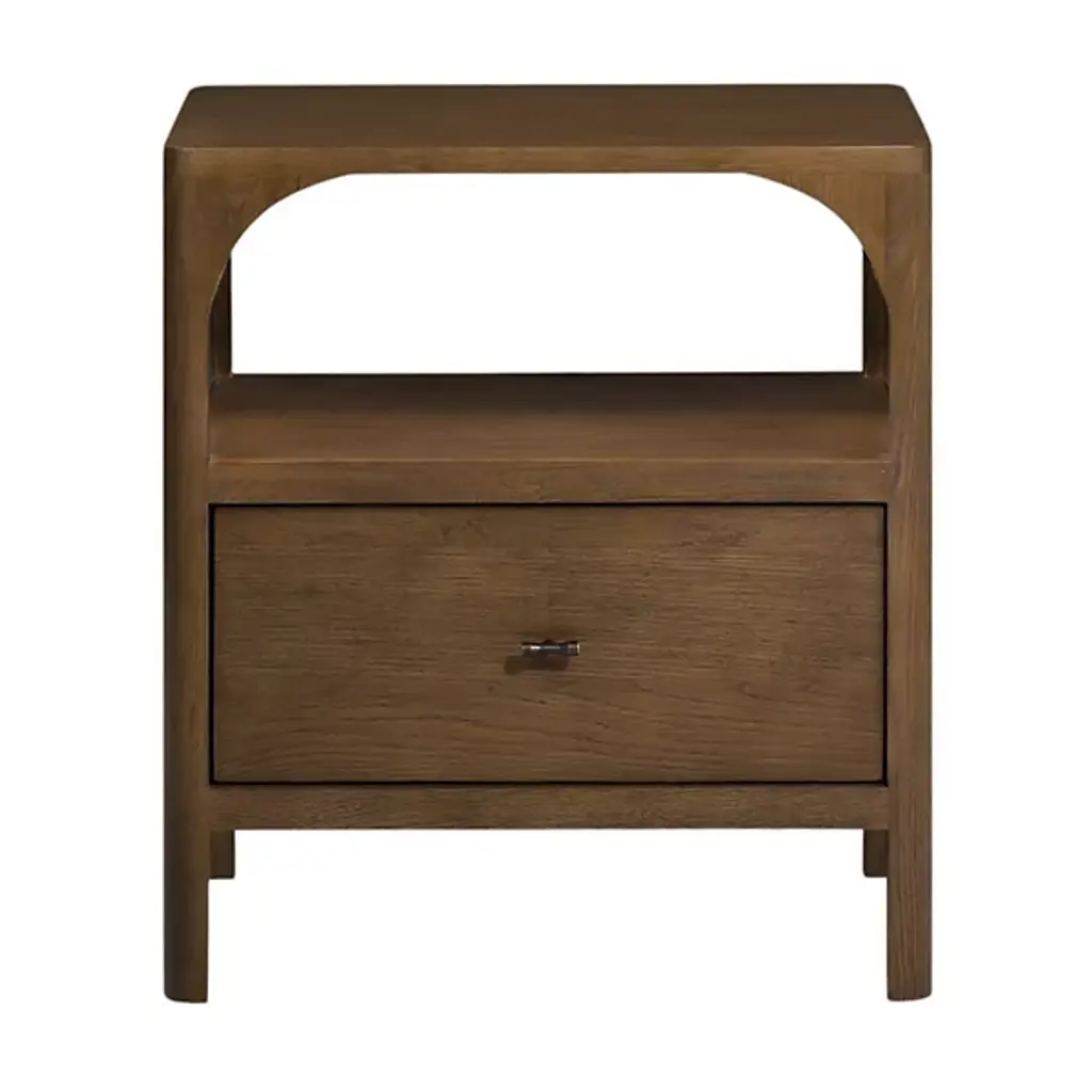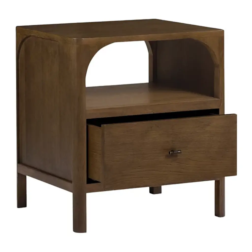 The Bonito Nightstand from Alder & Ore is a nocturnal storyteller, whispering tales of craftsmanship as you drift off to sleep. Its solid oak body, hand-finished to a rich walnut hue, invites touch with its warmth and depth. Crowned by a graceful arch, the open shelf offers a stage for your nightly essentials or cherished mementos. Below, a drawer glides open silently; its antique bronze pulls a subtle nod to bygone eras.