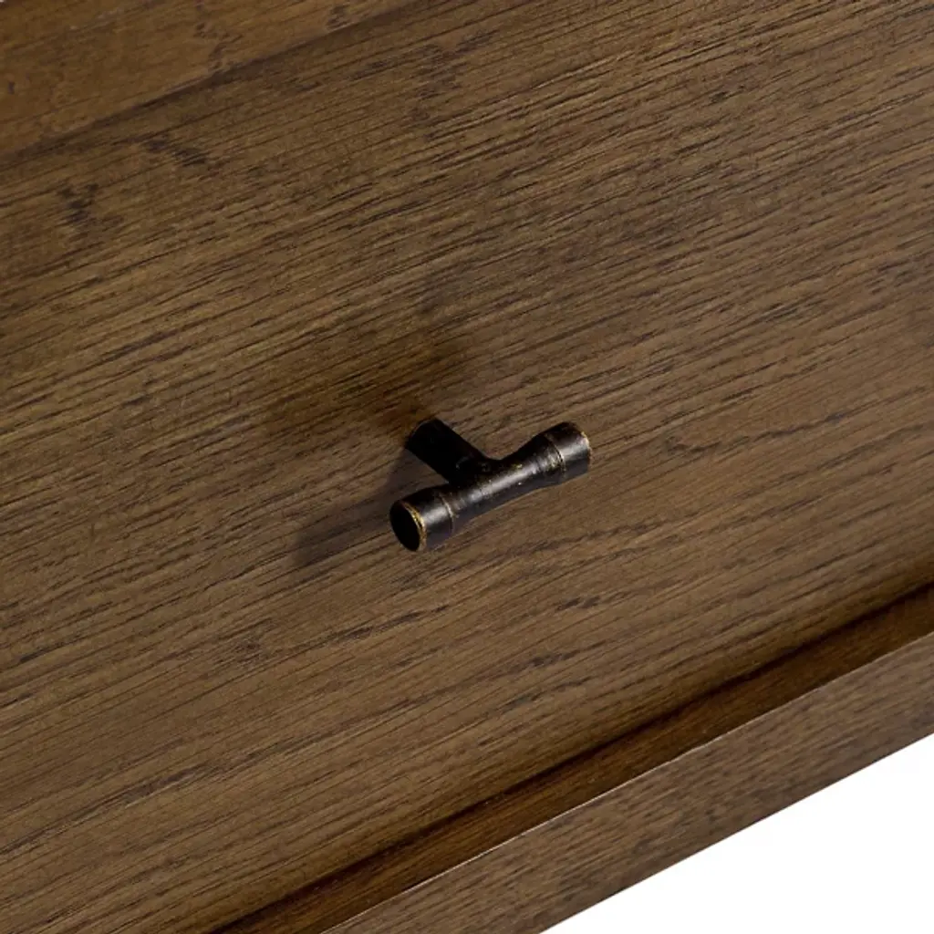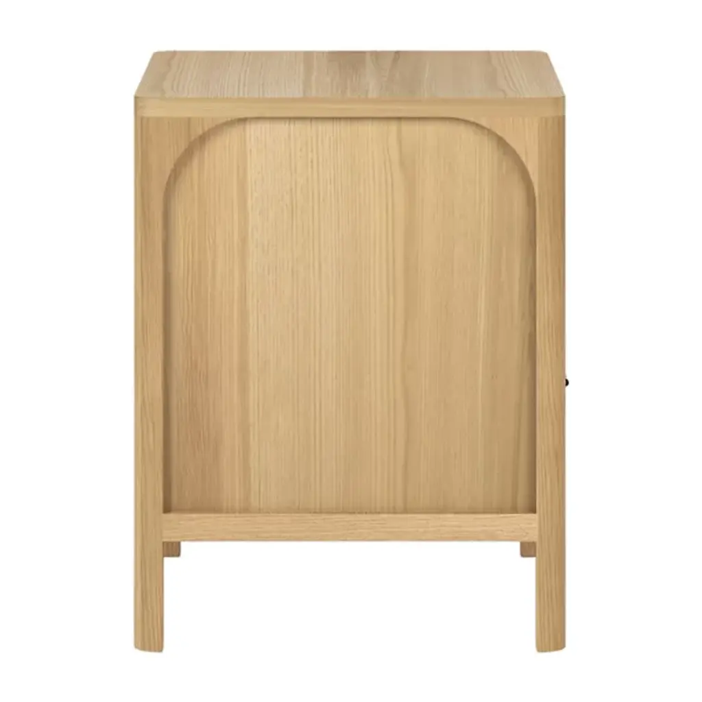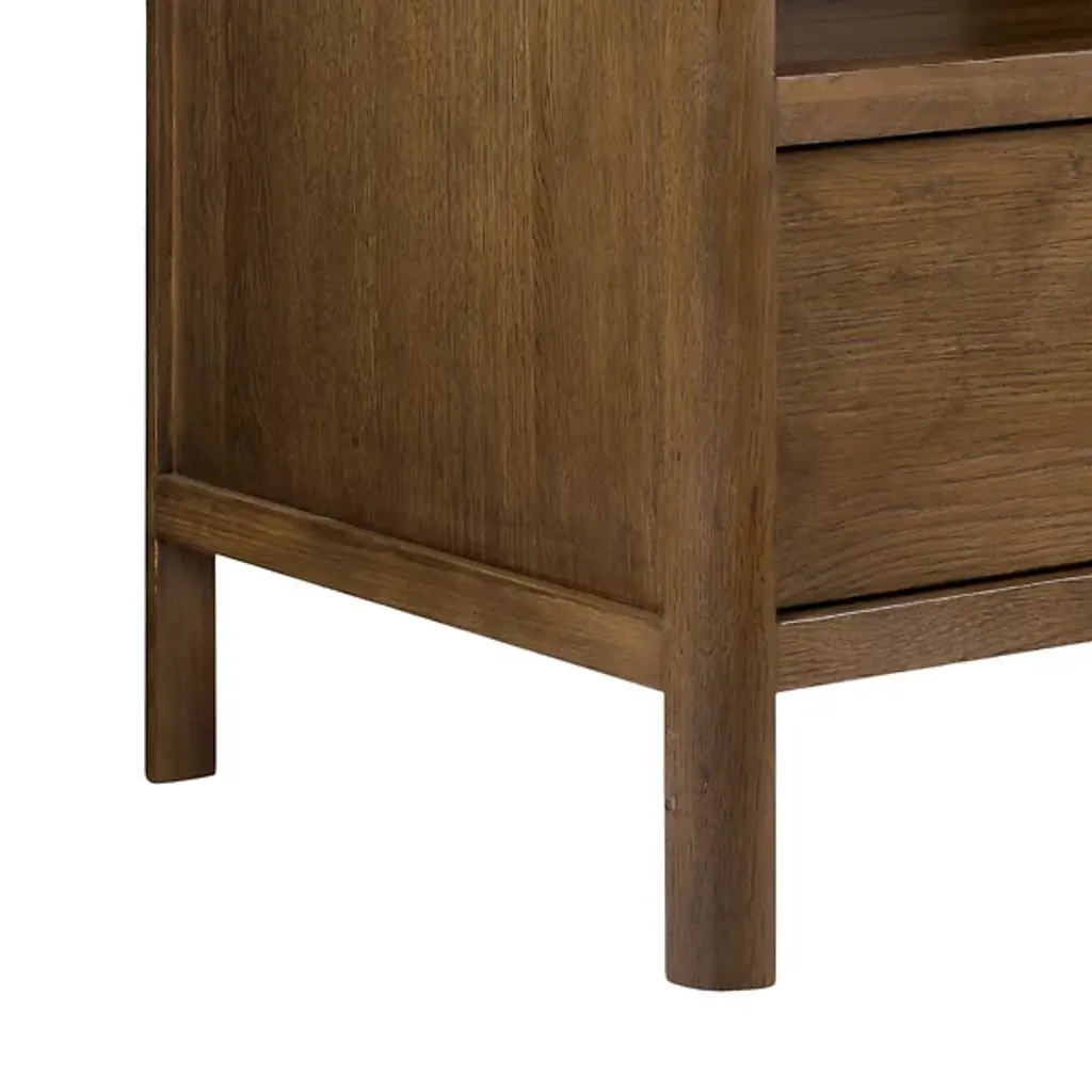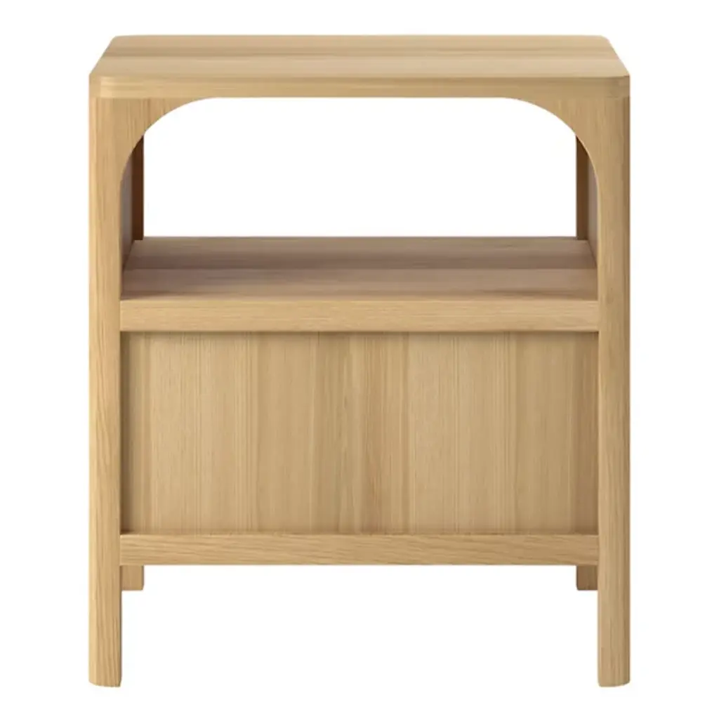 The Bonito Nightstand from Alder & Ore is a nocturnal storyteller, whispering tales of craftsmanship as you drift off to sleep. Its solid oak body, hand-finished to a rich walnut hue, invites touch with its warmth and depth. Crowned by a graceful arch, the open shelf offers a stage for your nightly essentials or cherished mementos. Below, a drawer glides open silently; its antique bronze pulls a subtle nod to bygone eras.