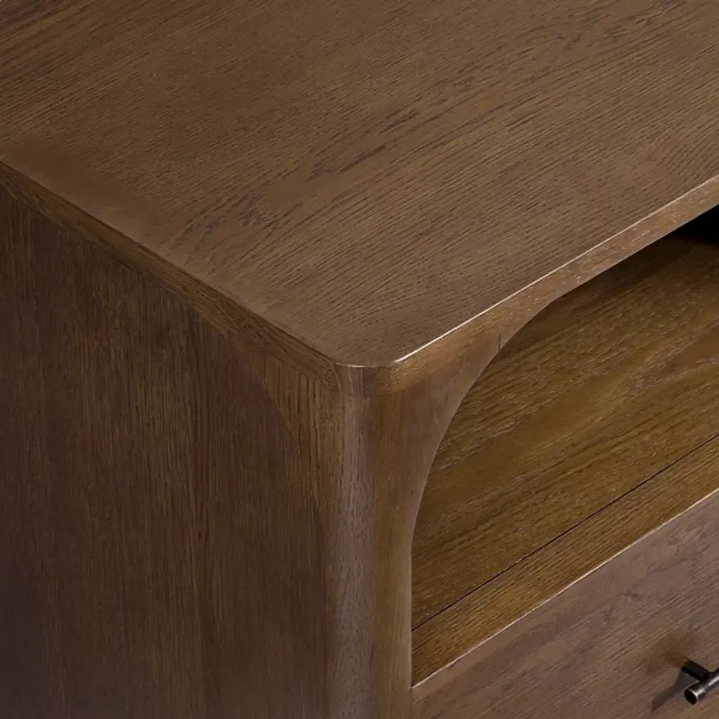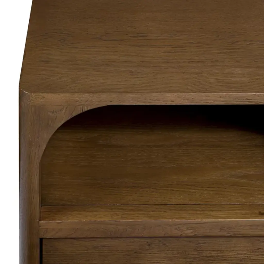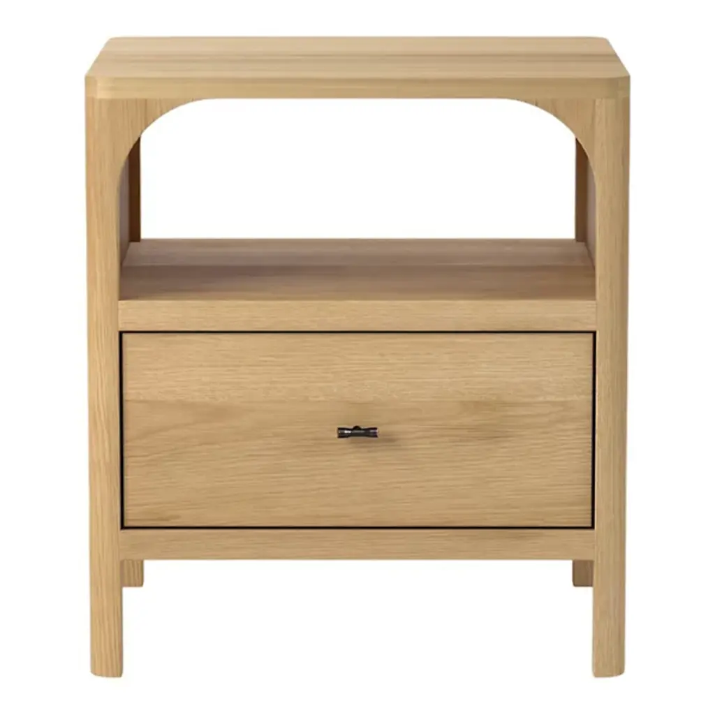 The Bonito Nightstand from Alder & Ore is a nocturnal storyteller, whispering tales of craftsmanship as you drift off to sleep. Its solid oak body, hand-finished to a rich walnut hue, invites touch with its warmth and depth. Crowned by a graceful arch, the open shelf offers a stage for your nightly essentials or cherished mementos. Below, a drawer glides open silently; its antique bronze pulls a subtle nod to bygone eras.