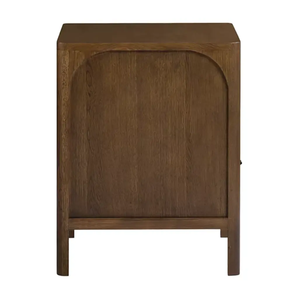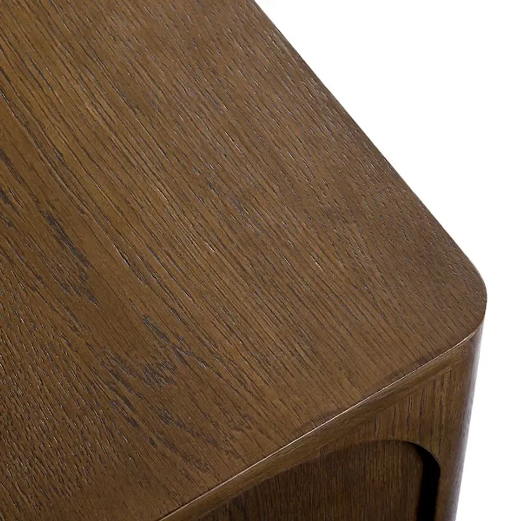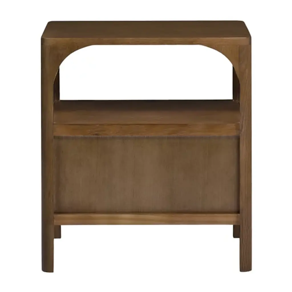 The Bonito Nightstand from Alder & Ore is a nocturnal storyteller, whispering tales of craftsmanship as you drift off to sleep. Its solid oak body, hand-finished to a rich walnut hue, invites touch with its warmth and depth. Crowned by a graceful arch, the open shelf offers a stage for your nightly essentials or cherished mementos. Below, a drawer glides open silently; its antique bronze pulls a subtle nod to bygone eras.