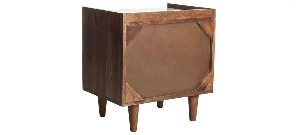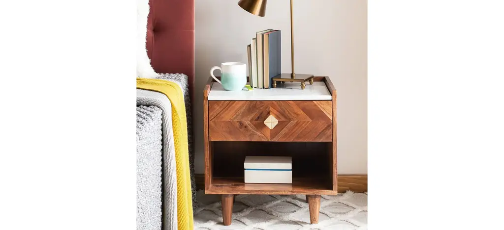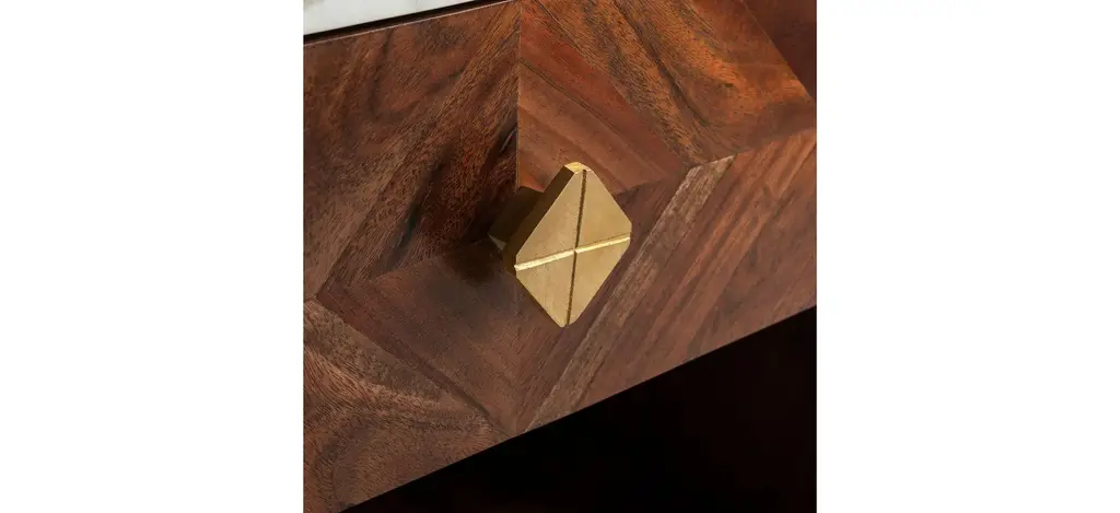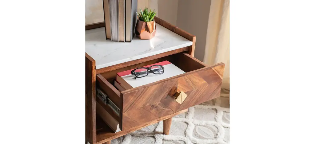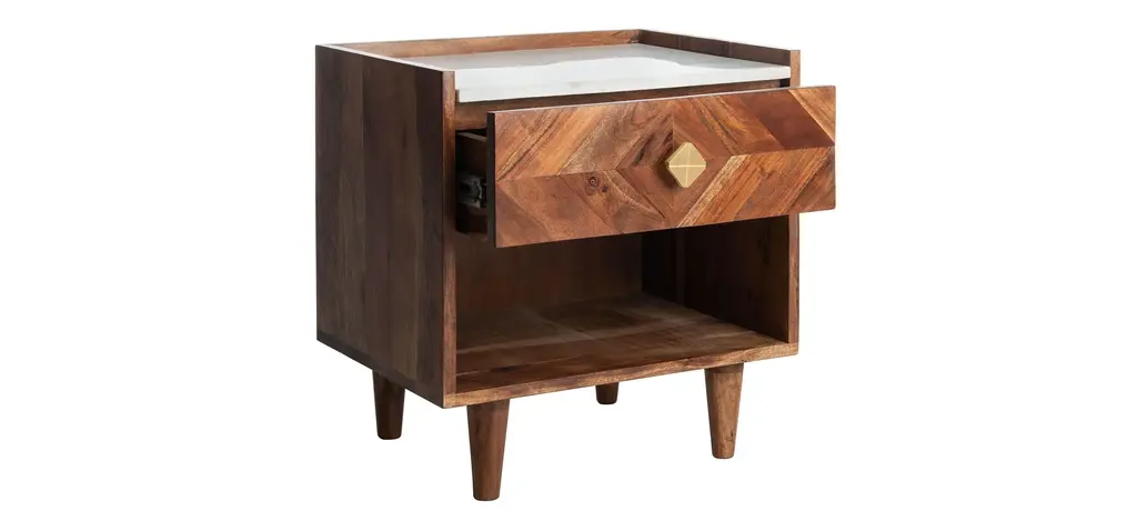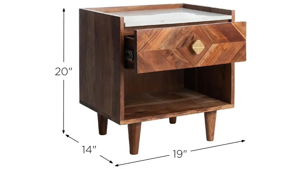 Bring striking visual intrigue to any bedroom with this Bora Parquet Nightstand. Finely crafted of acacia wood in a rich walnut finish that highlights the geometric design on its single drawer, Bora features a faux white marble top that beautifully offsets its deep colors and gold hardware.