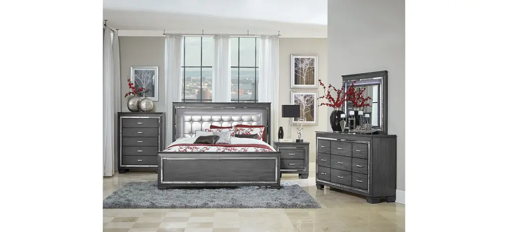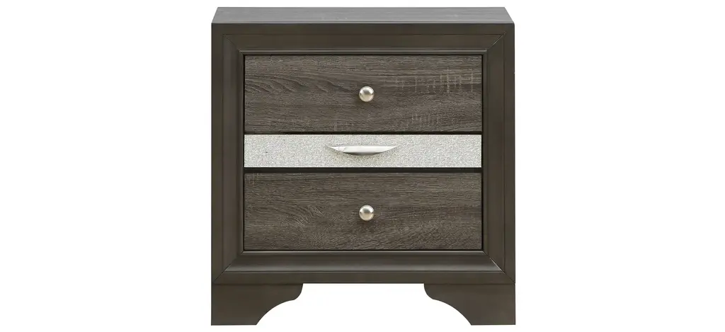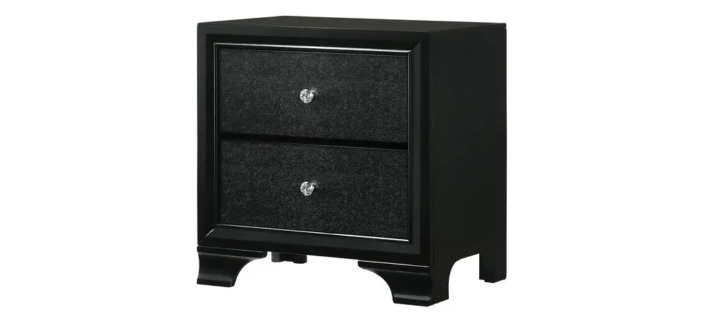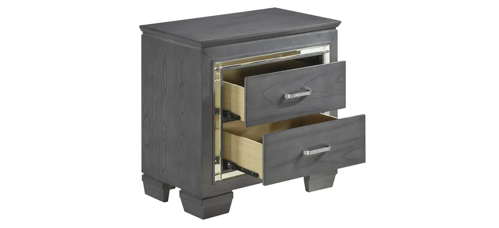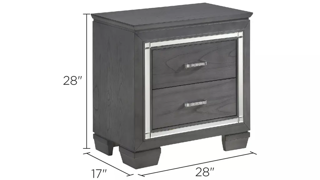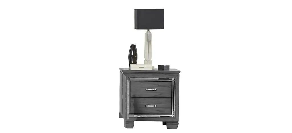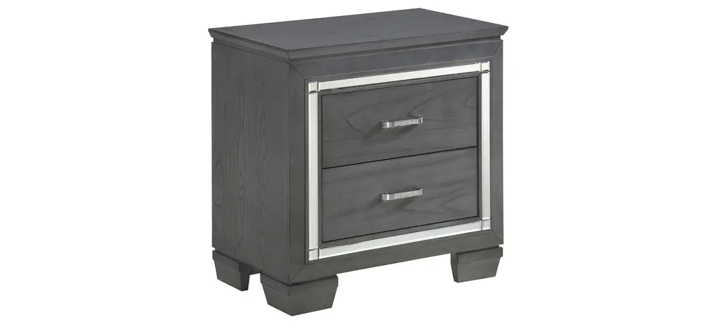 Glamour reigns in the design of the Brambley Nightstand. Framed by a decorative beveled mirror accent that enhances the illumination , as well as the under-light of the night stand. Alligator embossing and high polished crystal elevates hardware boldly accent the finish - over mindy veneer - of the collection, providing additional glamour and functionality to your bedroom featuring an added hint of sparkle.