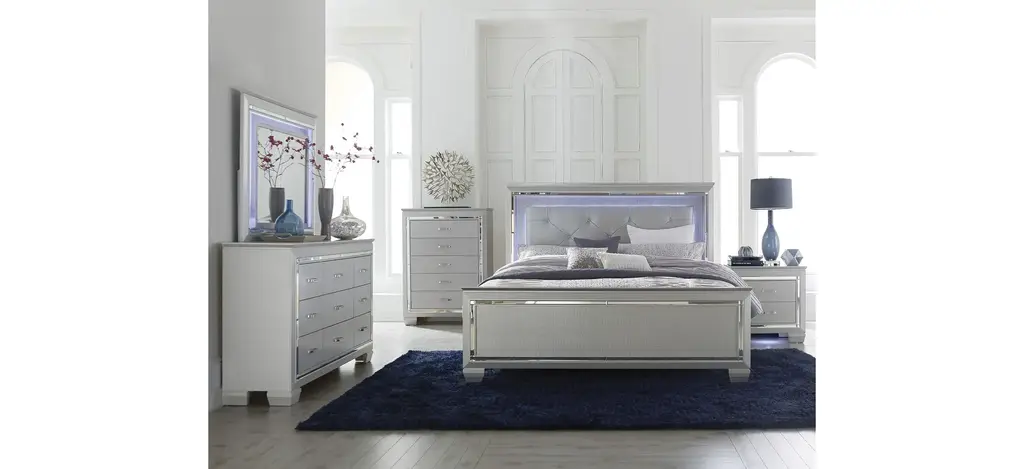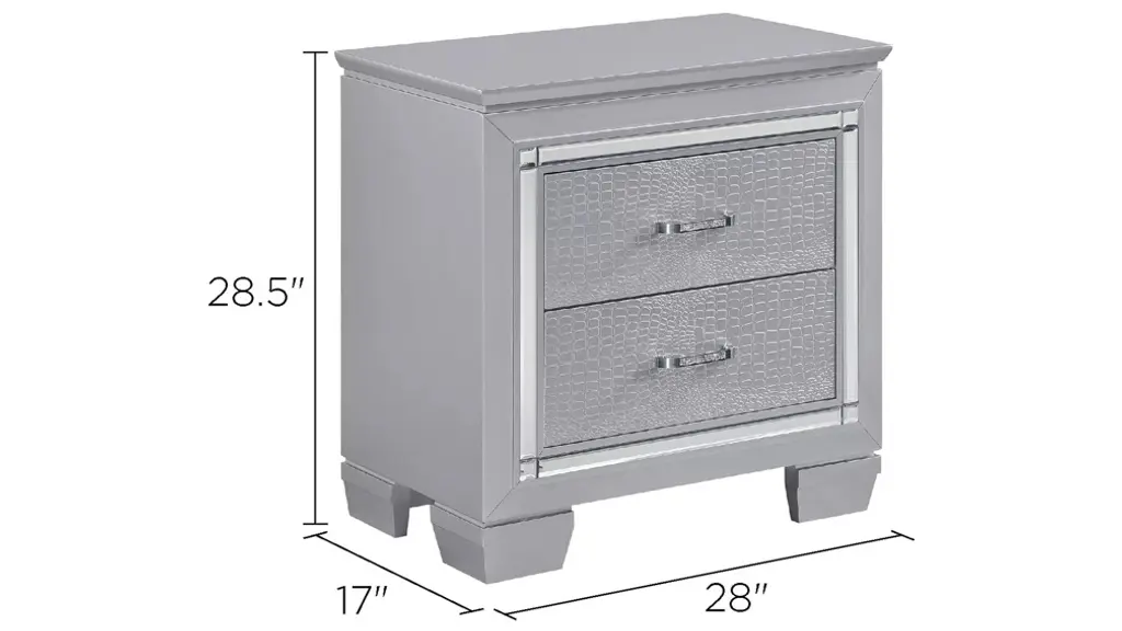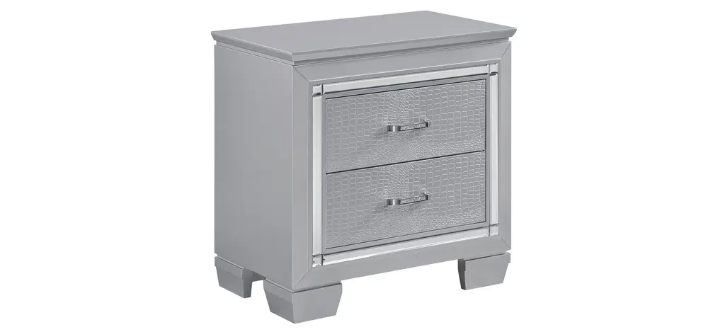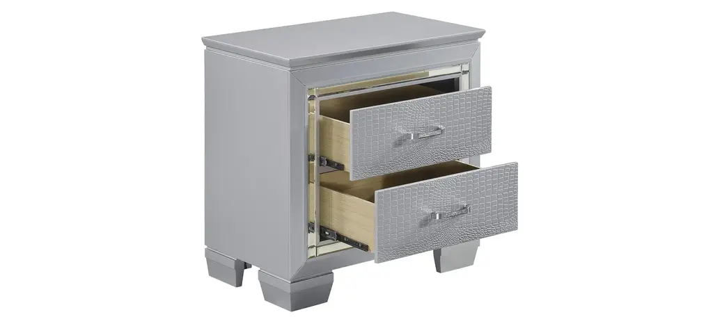 Glamour reigns in the design of the Brambley Nightstand. Framing nightstand is a decorative beveled mirror accent that enhances the illumination from the touch-engaged LED under-light of the nightstand. The alligator embossing of the drawer fronts is paired with high-polished crystal-enhanced hardware that boldly decorates the silver finish.