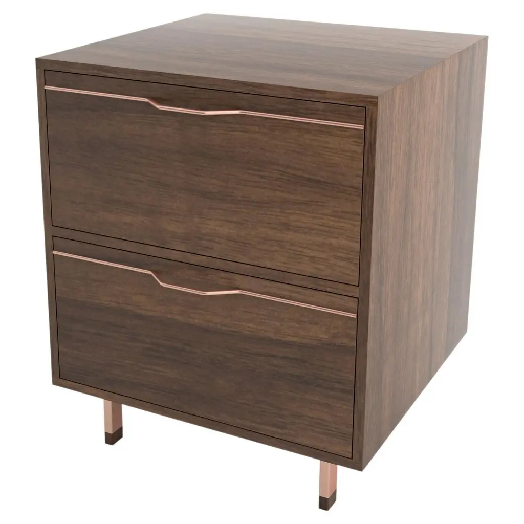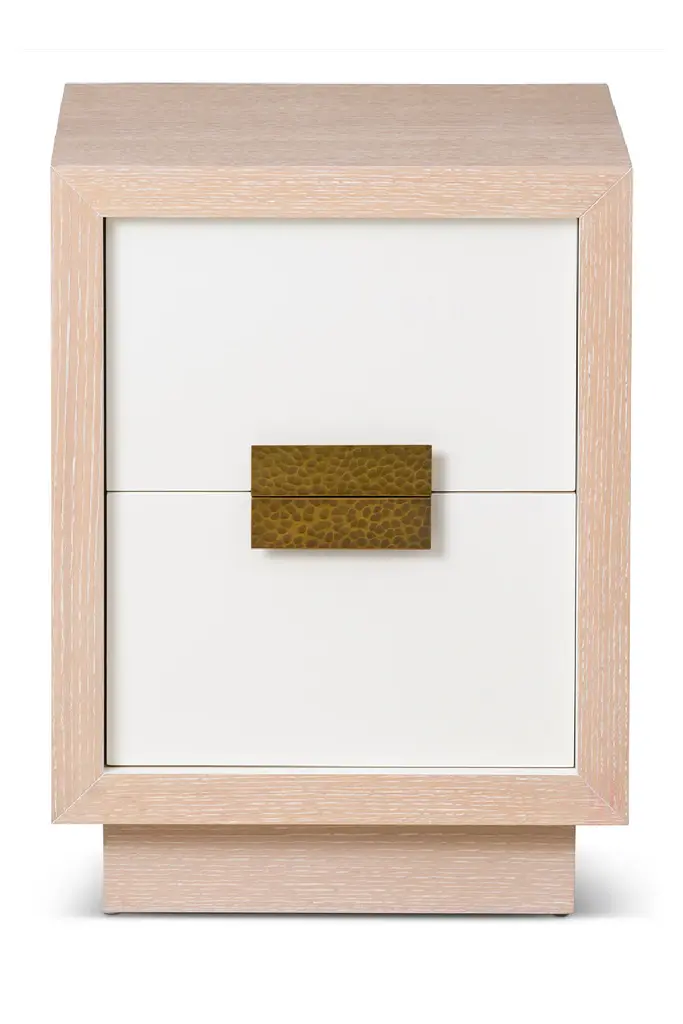 Elegant and ergonomic, this exquisite bedside table will effortlessly complement any contemporary interior infusing it with subtle sophistication. Boasting a sturdy and clean shape, it crafted of wood enhanced with a sand lacquer on the top and sides and an ebony veneer on the front. The base is uniquely adorned with gold leaf for a plush accent that completes the stylish aesthetic.