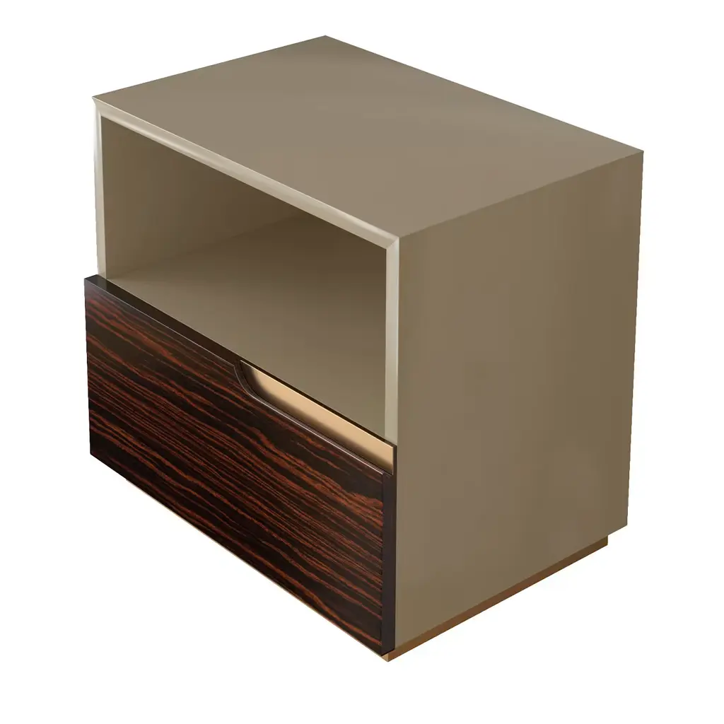 Stunningly elegant in its clean and essential design, this bedside table will effortlessly complement any modern bedroom thanks to a versatile and timeless charm. Entirely crafted of sand-lacquered wood, also available in ice white, it features an open compartment and an ebony-veneered drawer. Completed with precious details in gold leaf. Please ask the Concierge for further information.