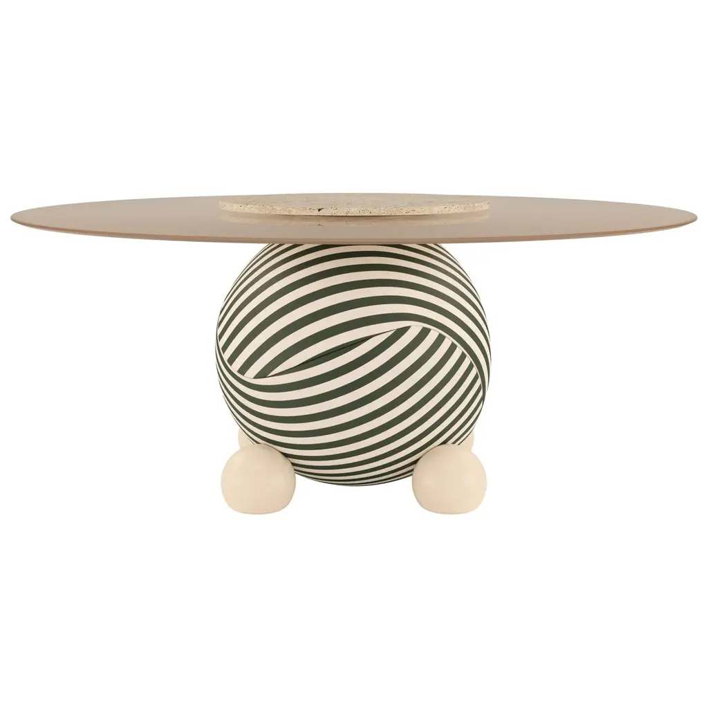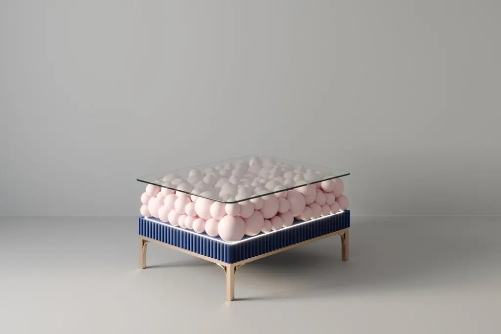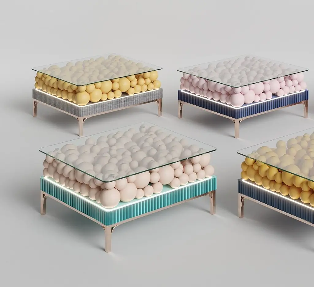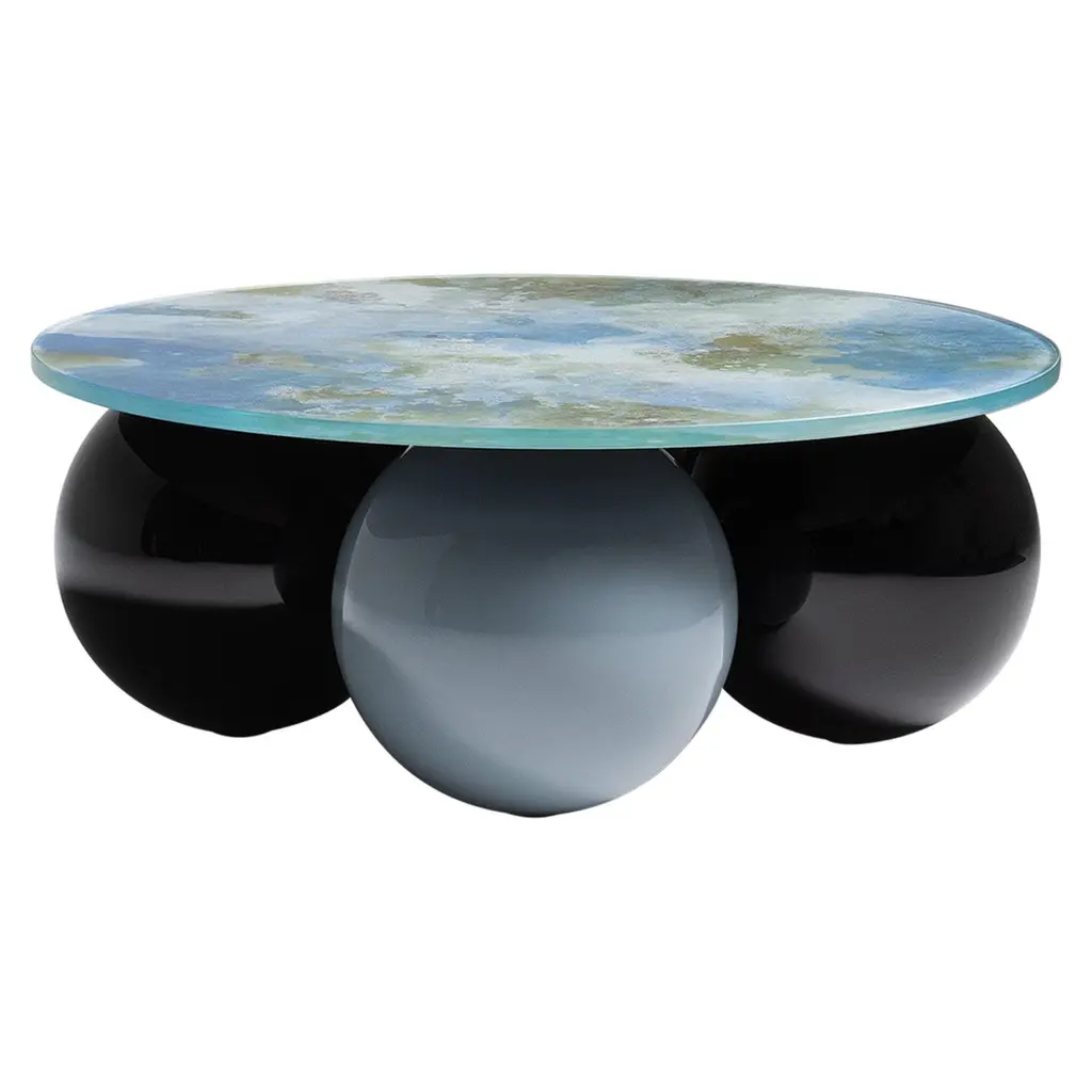 Brass And Paint Bubbles Decorative Coffee Table by PANOPTIKUM COLLECTIONSDimensions: D 80 x W 100 x H 50 cm.Materials: MDF, brass, paint, and LED lighting.The “Bubbles collection” is an example of an emotional design that appeals to our inner child. The collection is inspired by excitement from childhood, provoked by the first reaction to rainbow-colored soap bubbles and pink bubble-gums. Colour palette: pastels and pure, rich colors and textures, gloss and matte coating of the facades. An airy array of the «bubbles» covered by glass makes a dynamic contrast of shapes, like a layer of puffy cream in a cake. Due to its height, the item can function as a bedside table and add positive energy to your interior.PANOPTIKUM COLLECTIONS is proof of the feasibility of the materialization of ideas, even the most unusual ones, which were embodied in astonishing yet functional interior objects. We created this platform for experimentation with design objects, ideas, materials, shapes, and textures. This is a real collection of unusual objects, each of which was once just a reckless idea. The most expensive ideas are those whose implementation requires not only material resources but also courage, intuition, and skill.