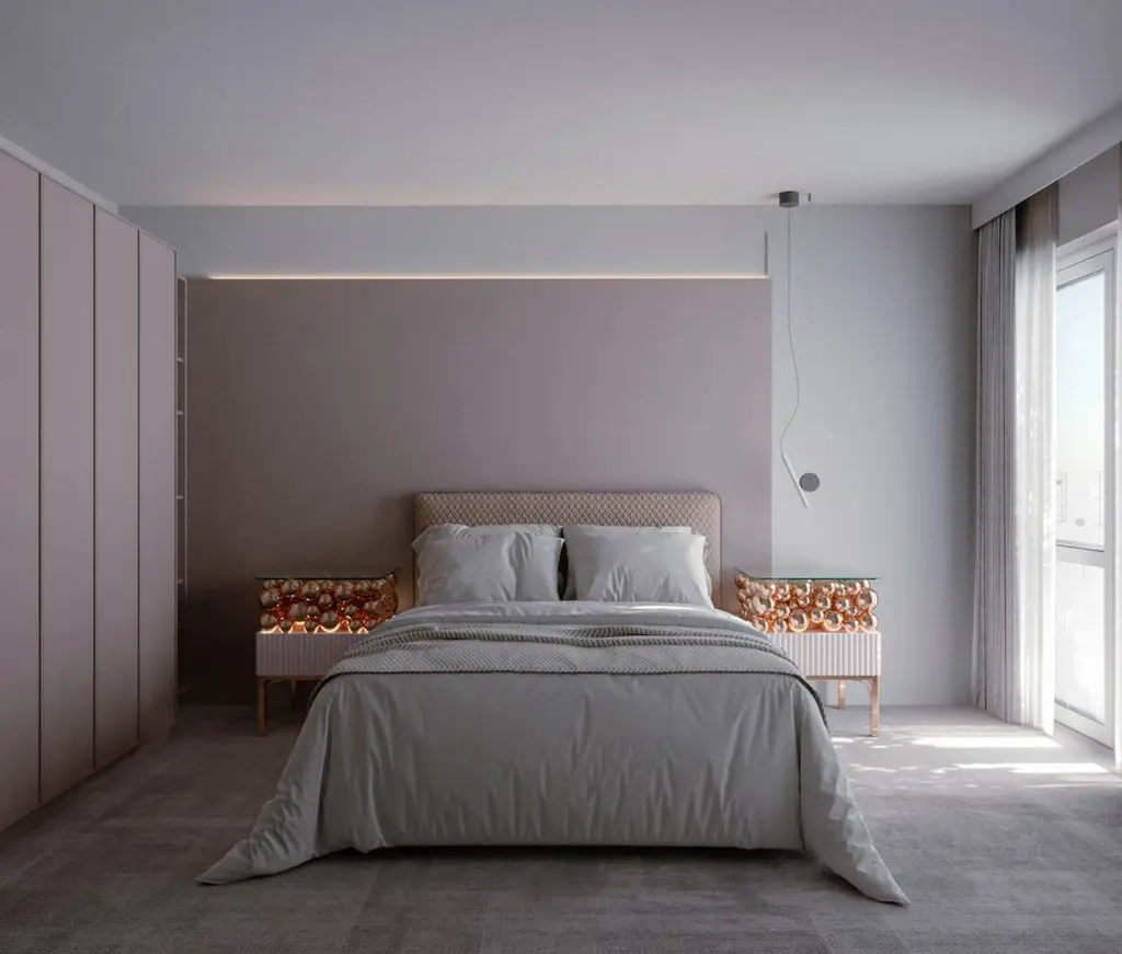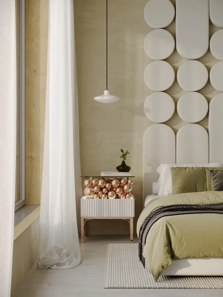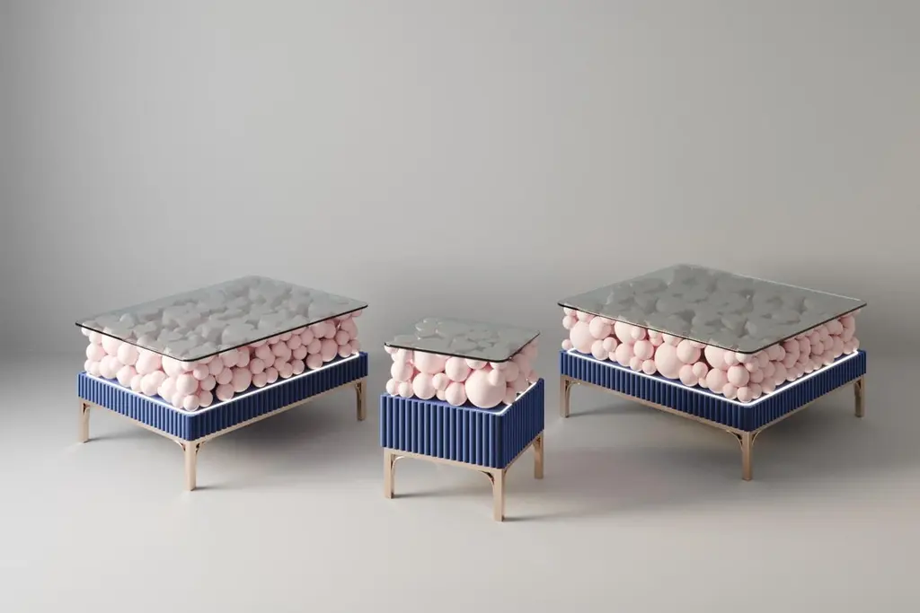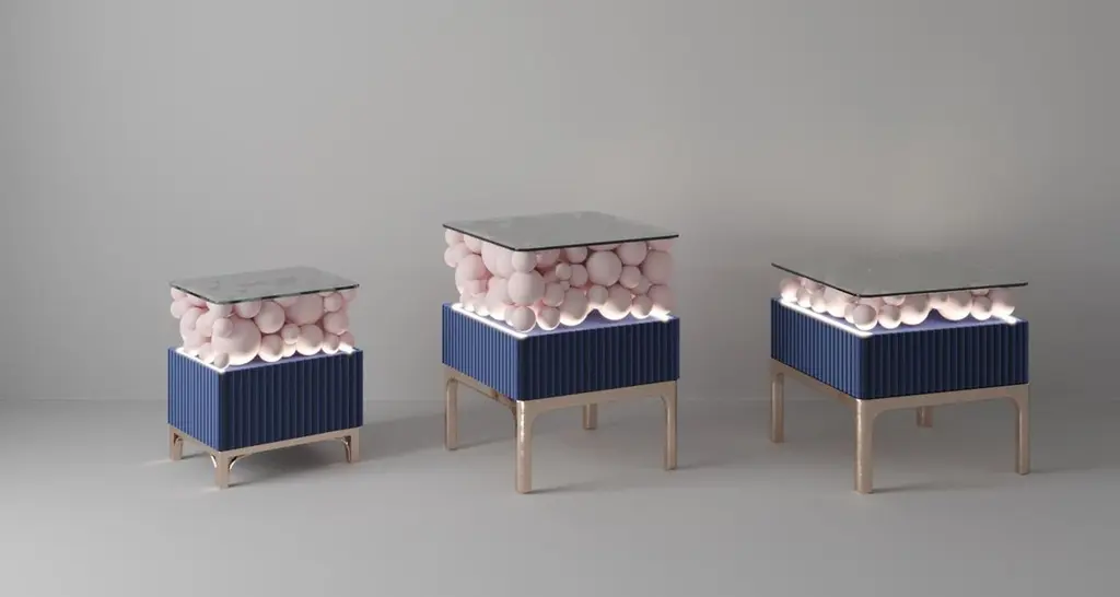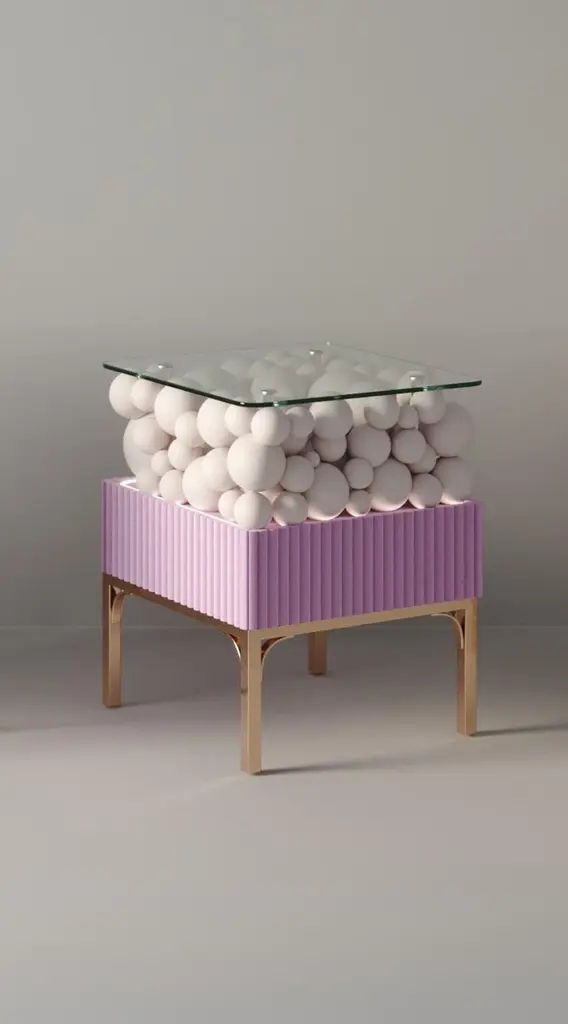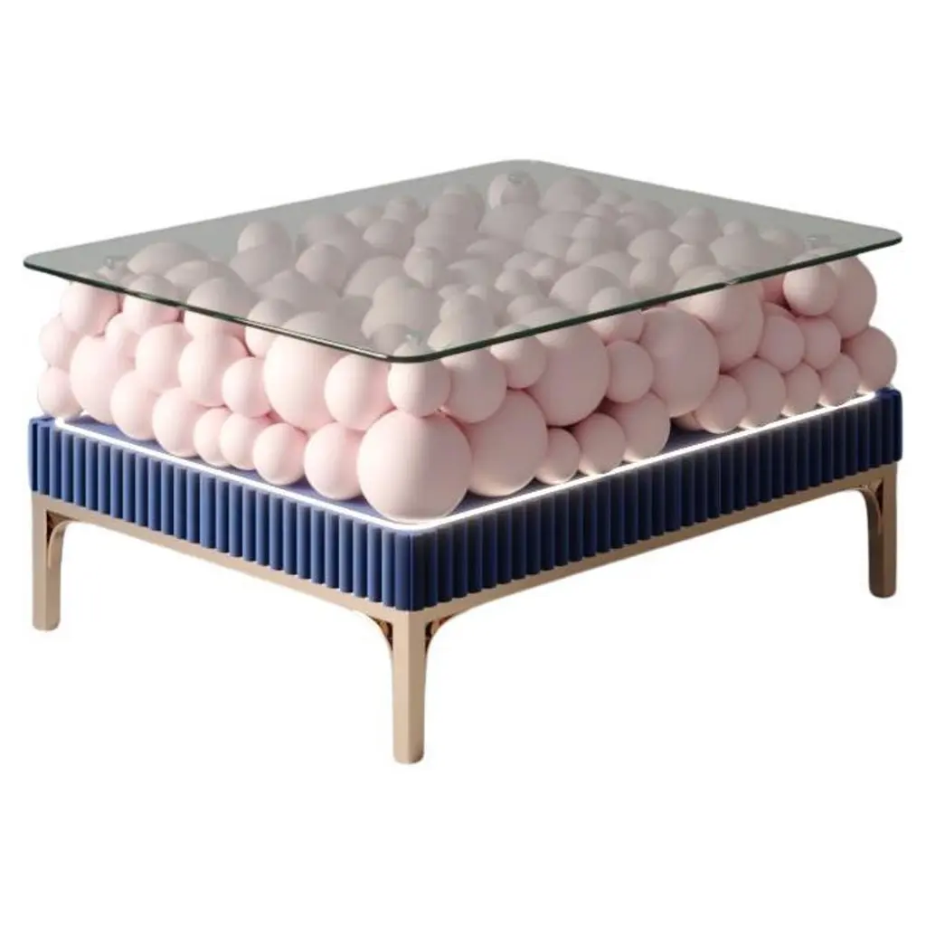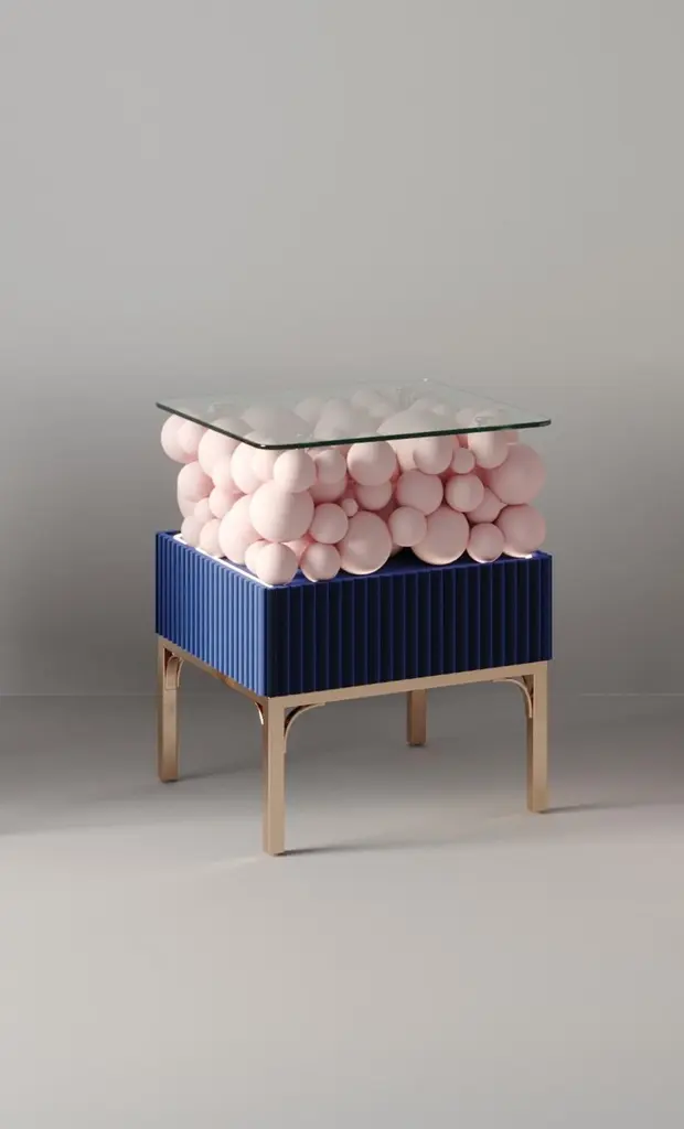 Brass And Painted Bubbles Decorative Bedside Table by PANOPTIKUM COLLECTIONSDimensions: D 45 x W 50 x H 56,3 cm.Materials: MDF, brass, paint, and LED lighting.The “Bubbles collection” is an example of an emotional design that appeals to our inner child. The collection is inspired by excitement from childhood, provoked by the first reaction to rainbow-colored soap bubbles and pink bubble-gums. Colour palette: pastels and pure, rich colors and textures, gloss and matte coating of the facades. An airy array of the «bubbles» covered by glass makes a dynamic contrast of shapes, like a layer of puffy cream in a cake. Due to its height, the item can function as a bedside table and add positive energy to your interior.PANOPTIKUM COLLECTIONS is proof of the feasibility of the materialization of ideas, even the most unusual ones, which were embodied in astonishing yet functional interior objects. We created this platform for experimentation with design objects, ideas, materials, shapes, and textures. This is a real collection of unusual objects, each of which was once just a reckless idea. The most expensive ideas are those whose implementation requires not only material resources but also courage, intuition, and skill.