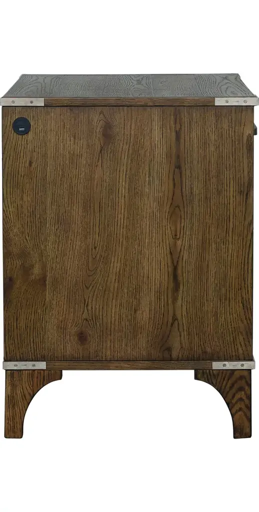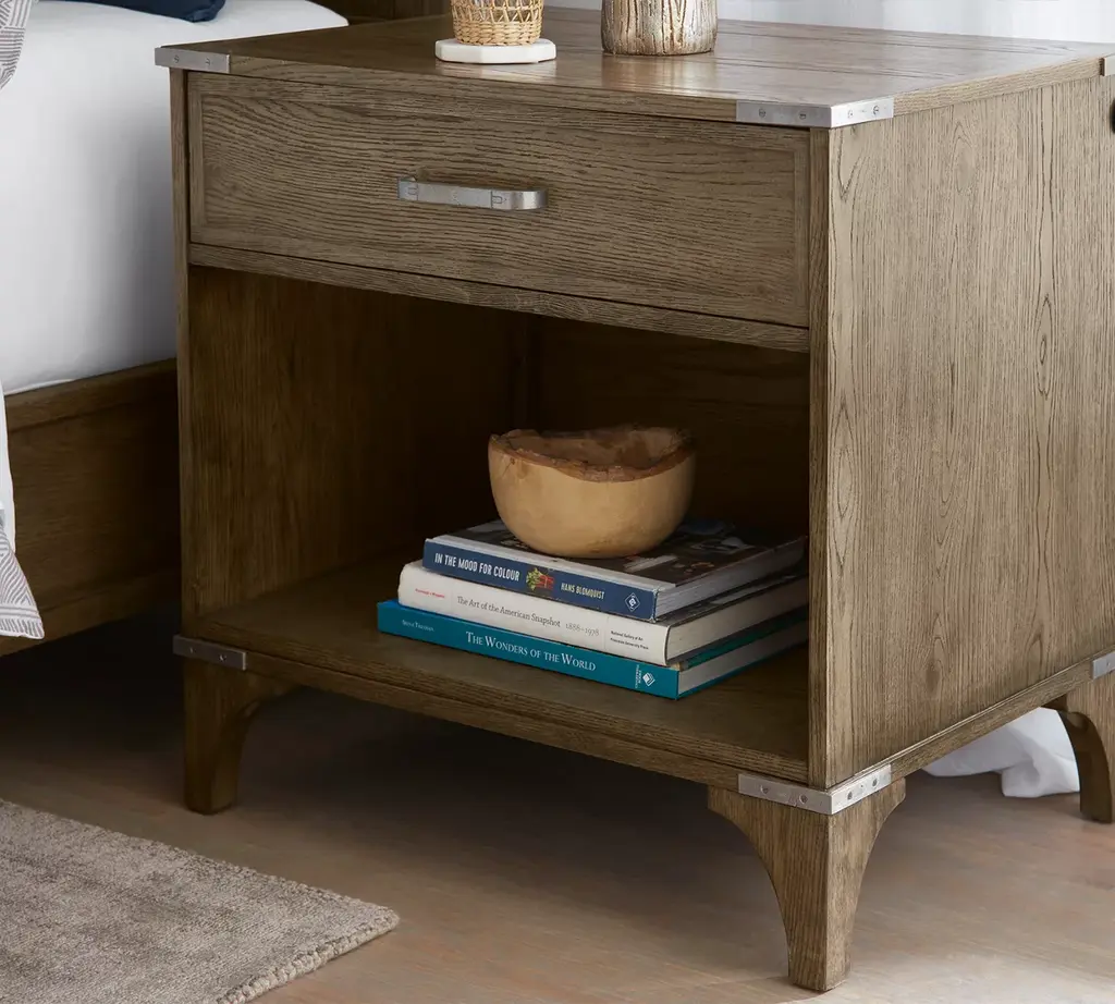 Add a touch of casually chic charm to your bedroom space with our Brighton nightstand. Boasting solid aluminum hardware and crafted from solid ash and oak veneers in a multi-step warm oak finish, this piece perfectly balances style and storage. Also features a USB port for convenient charging.